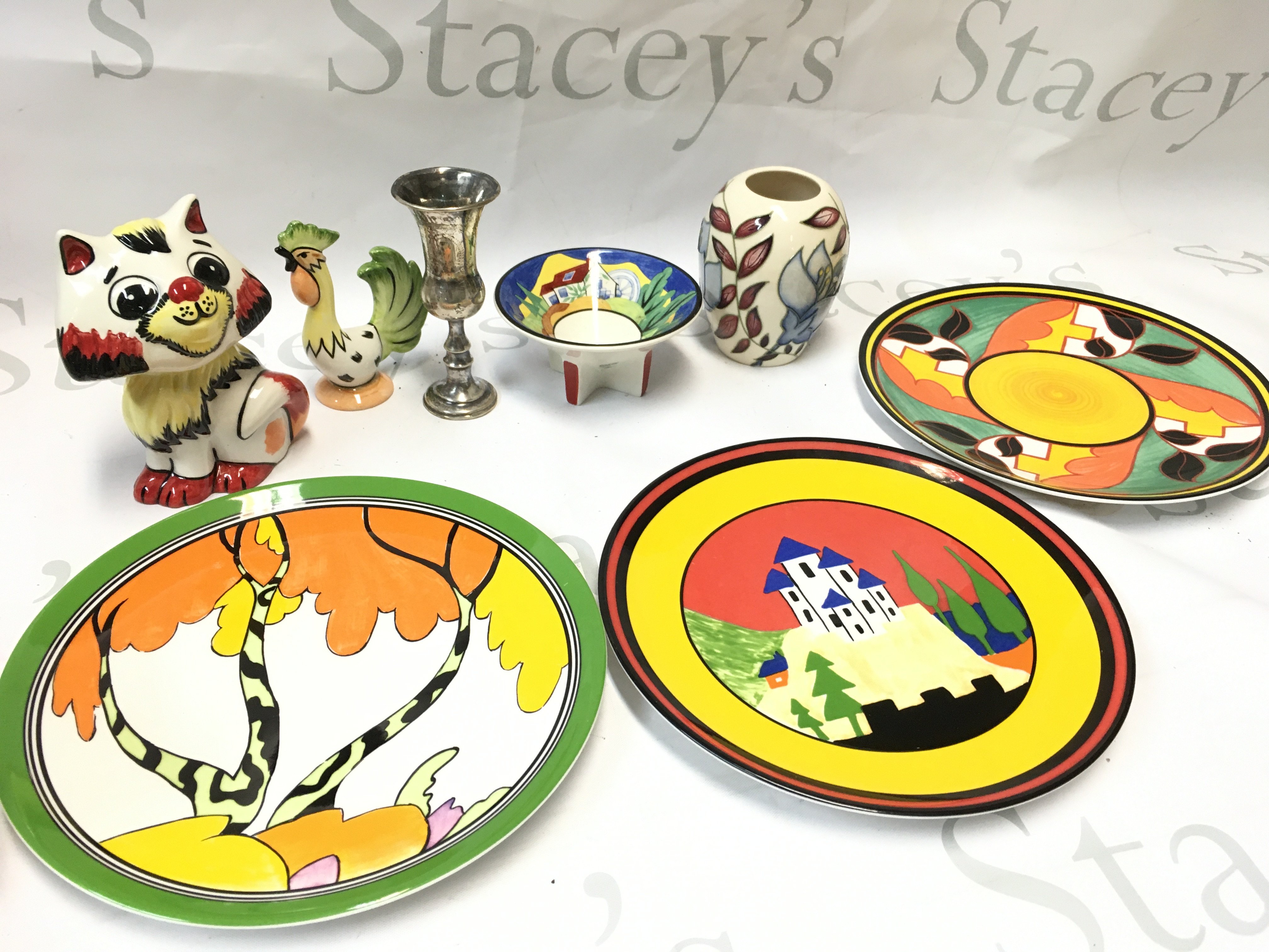 A collection of Lorna Bailey ceramic figures, Wedgwood Clarice Cliff big Anne and Flamboyance plates,