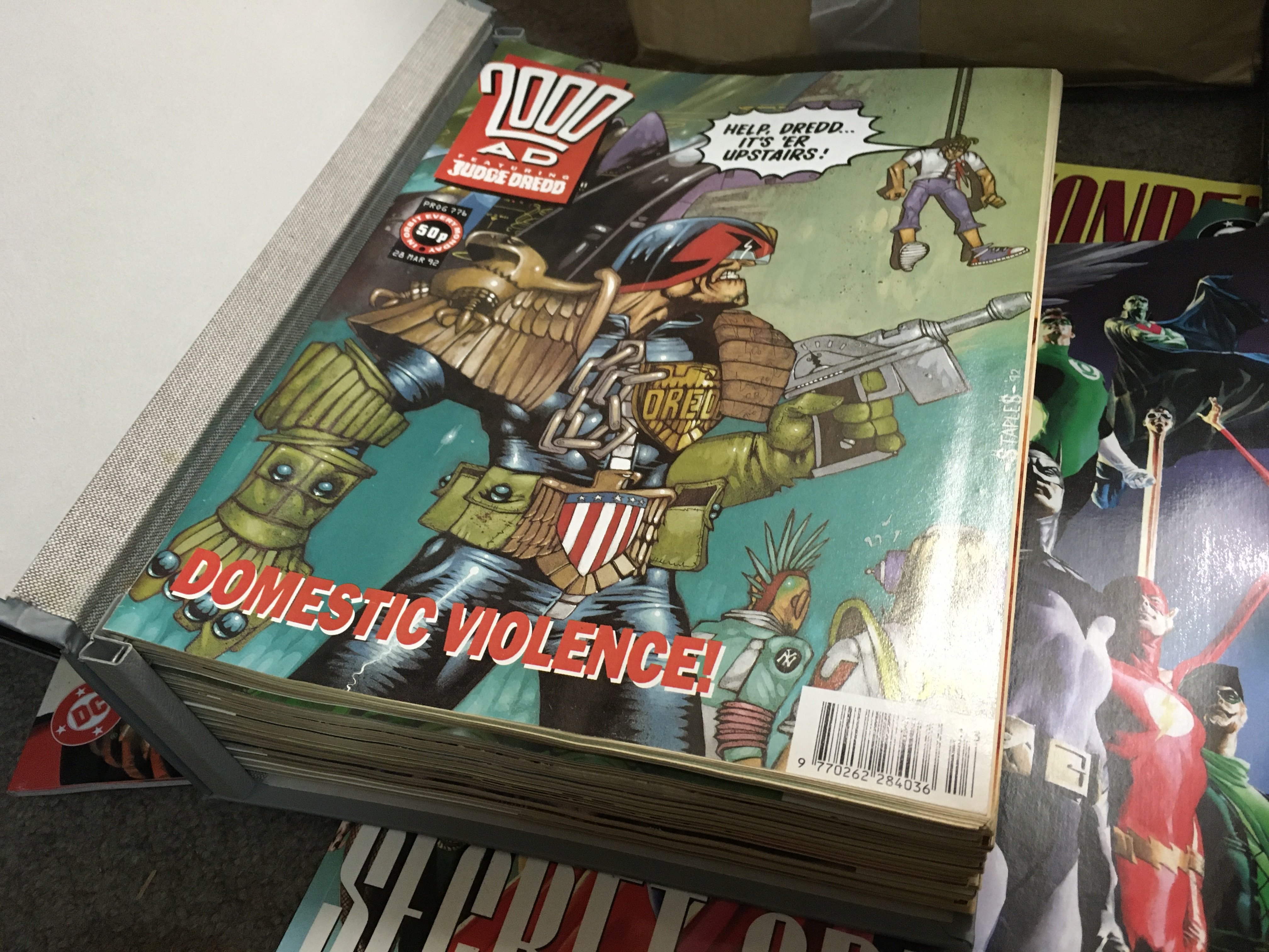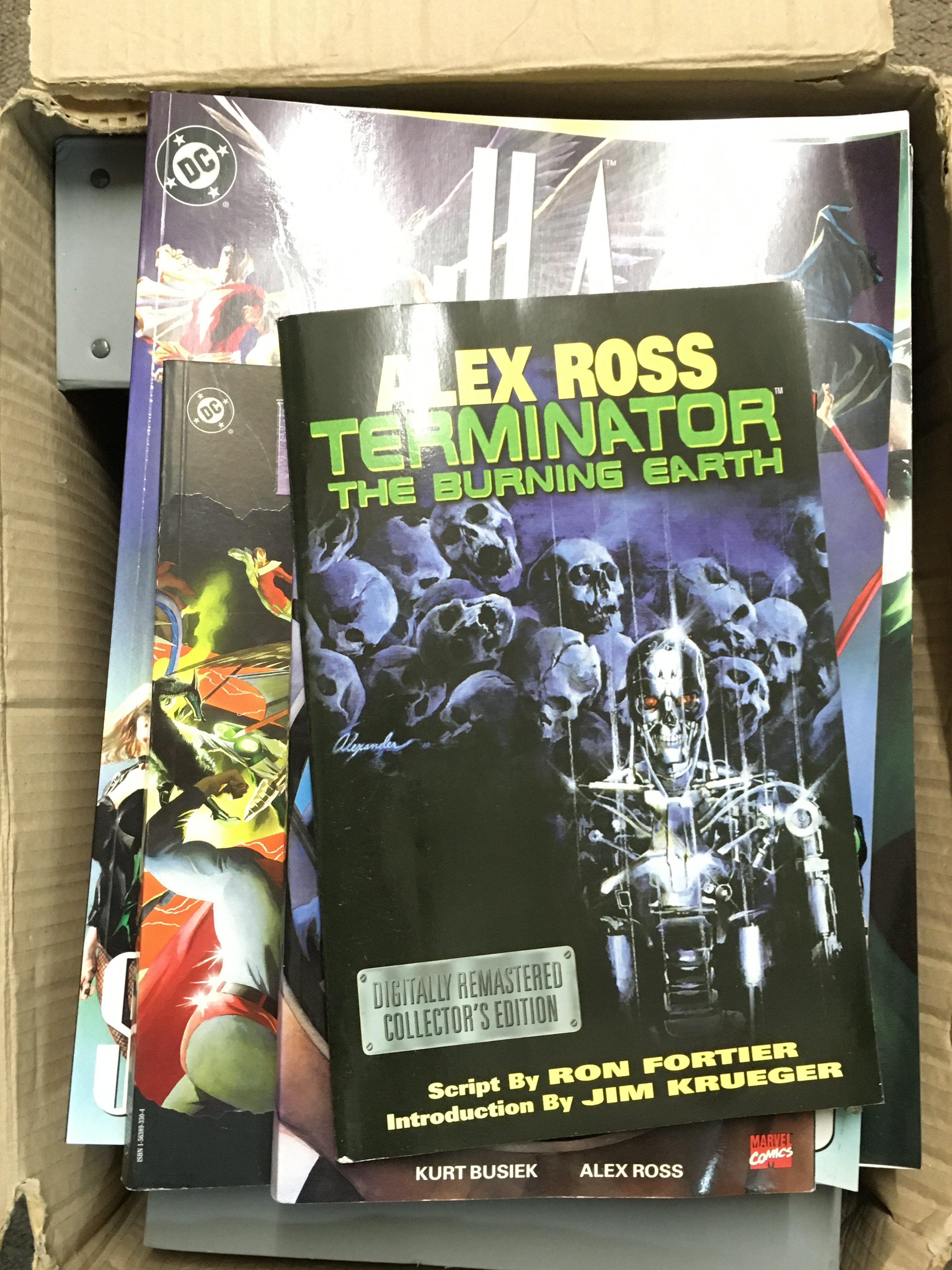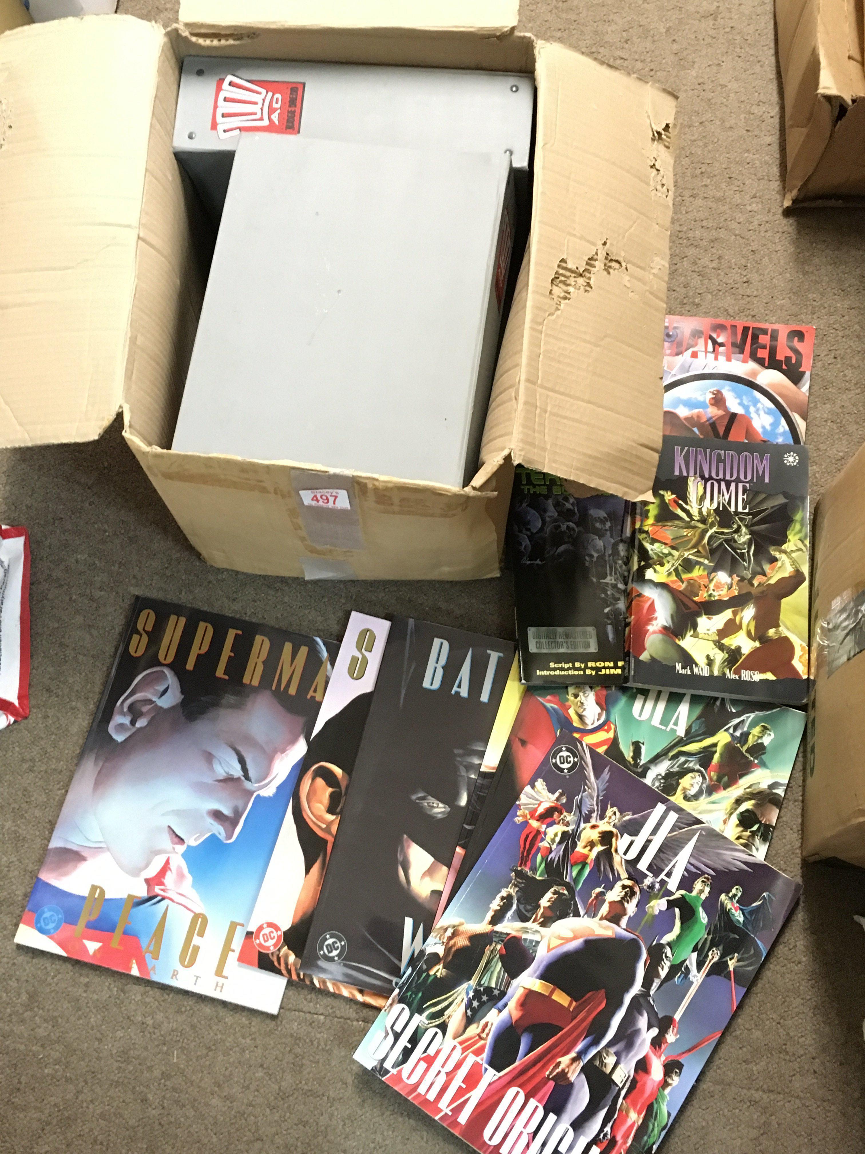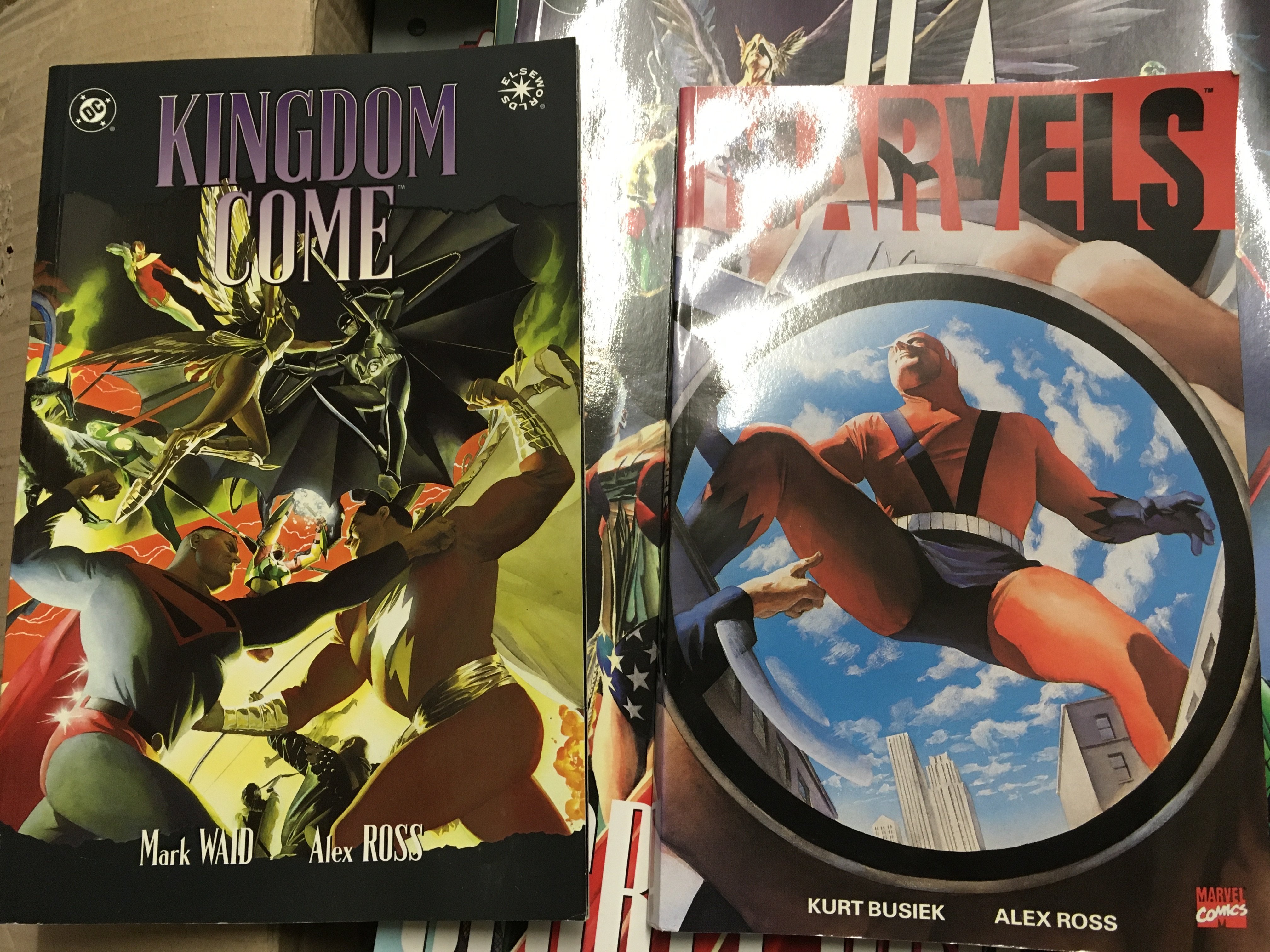 A collection of graphic novels including Marvels graphic novel, DC Kingdom come novel, Wonder Woman spirit of truth, Batman war on crime, Shazam power of hope, JLA secret origins and a collection of 2000 AD comics