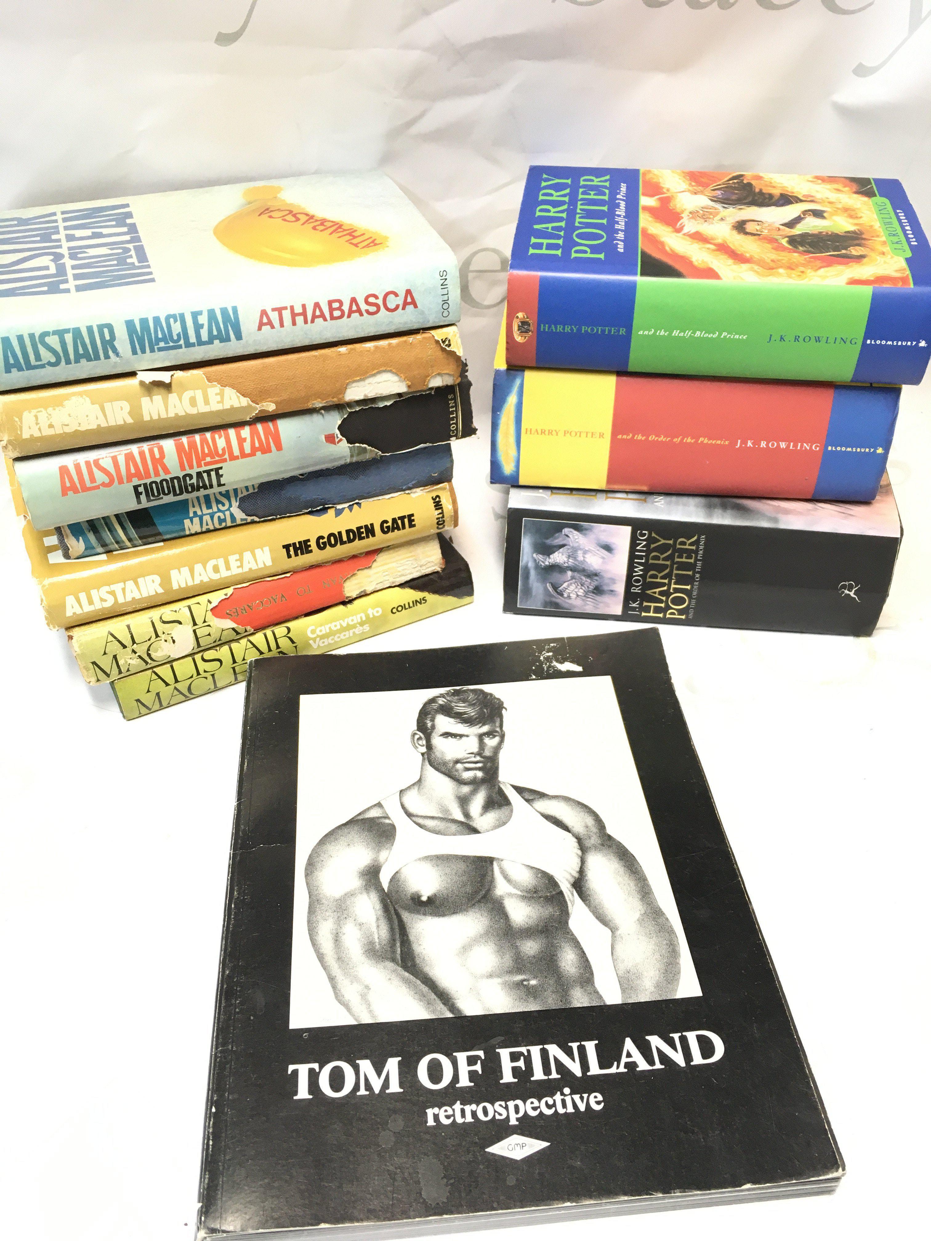 A collection of Alistar Maclean books including Athabasca, The Golden Gate etc. Harry Potter books and Tom of Finland retrospective