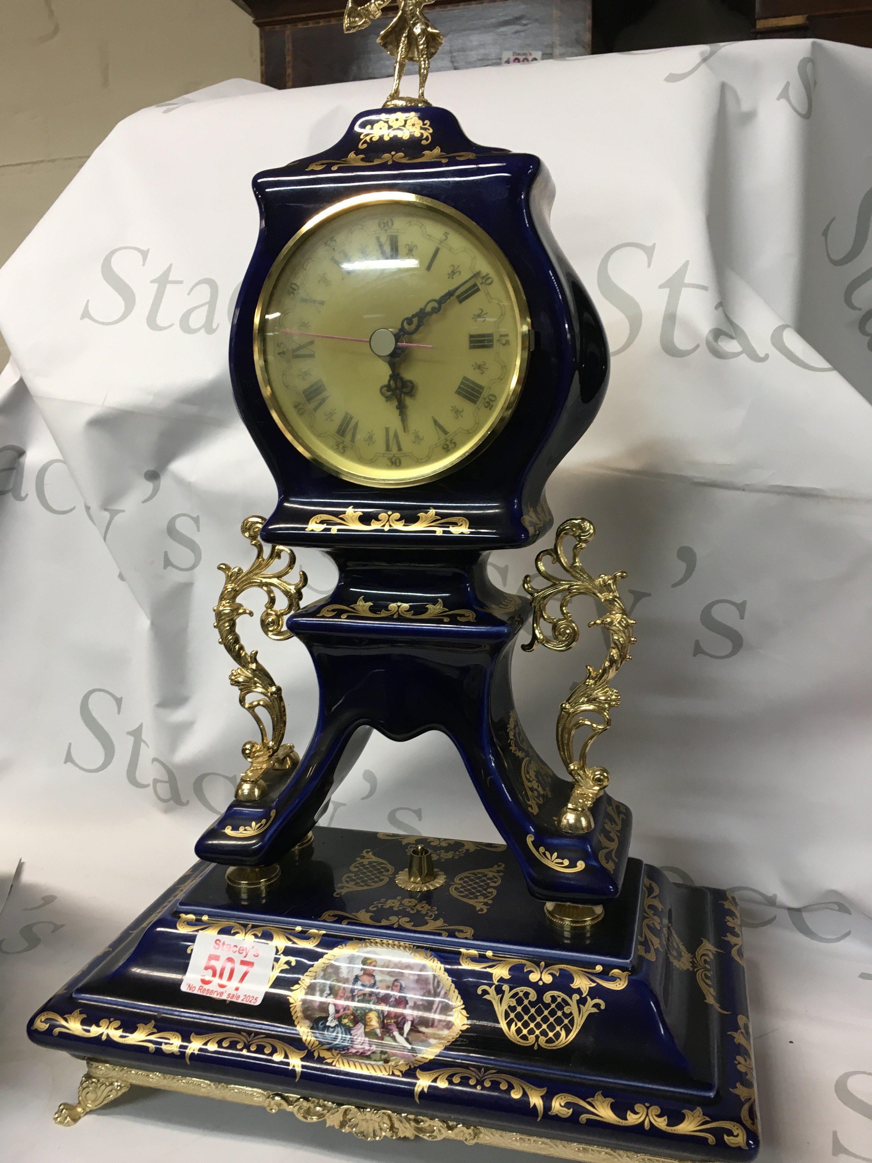 Vintage cobalt blue porcelain mantle clock. Blue and white with golden colours, made by Alfa.