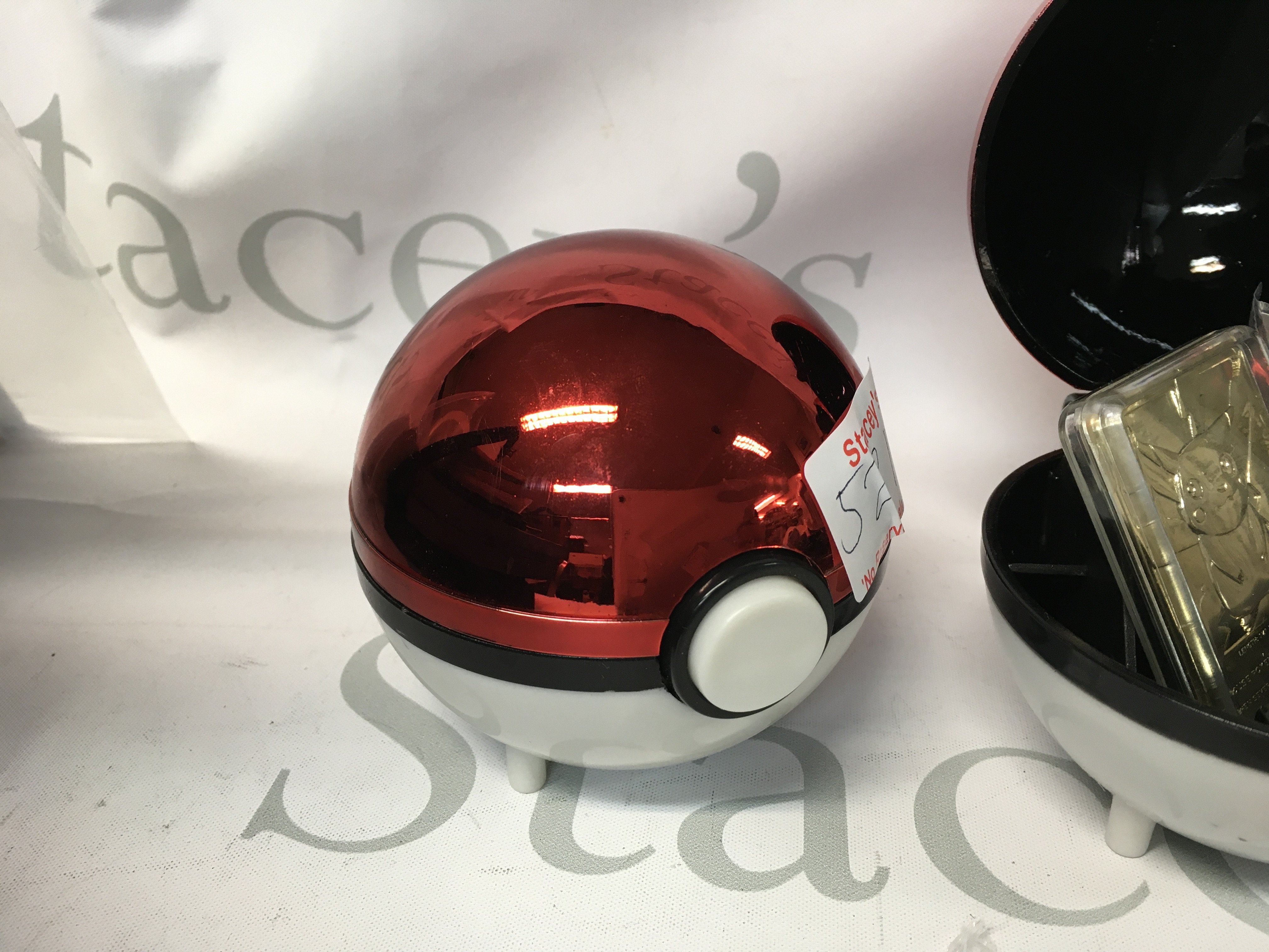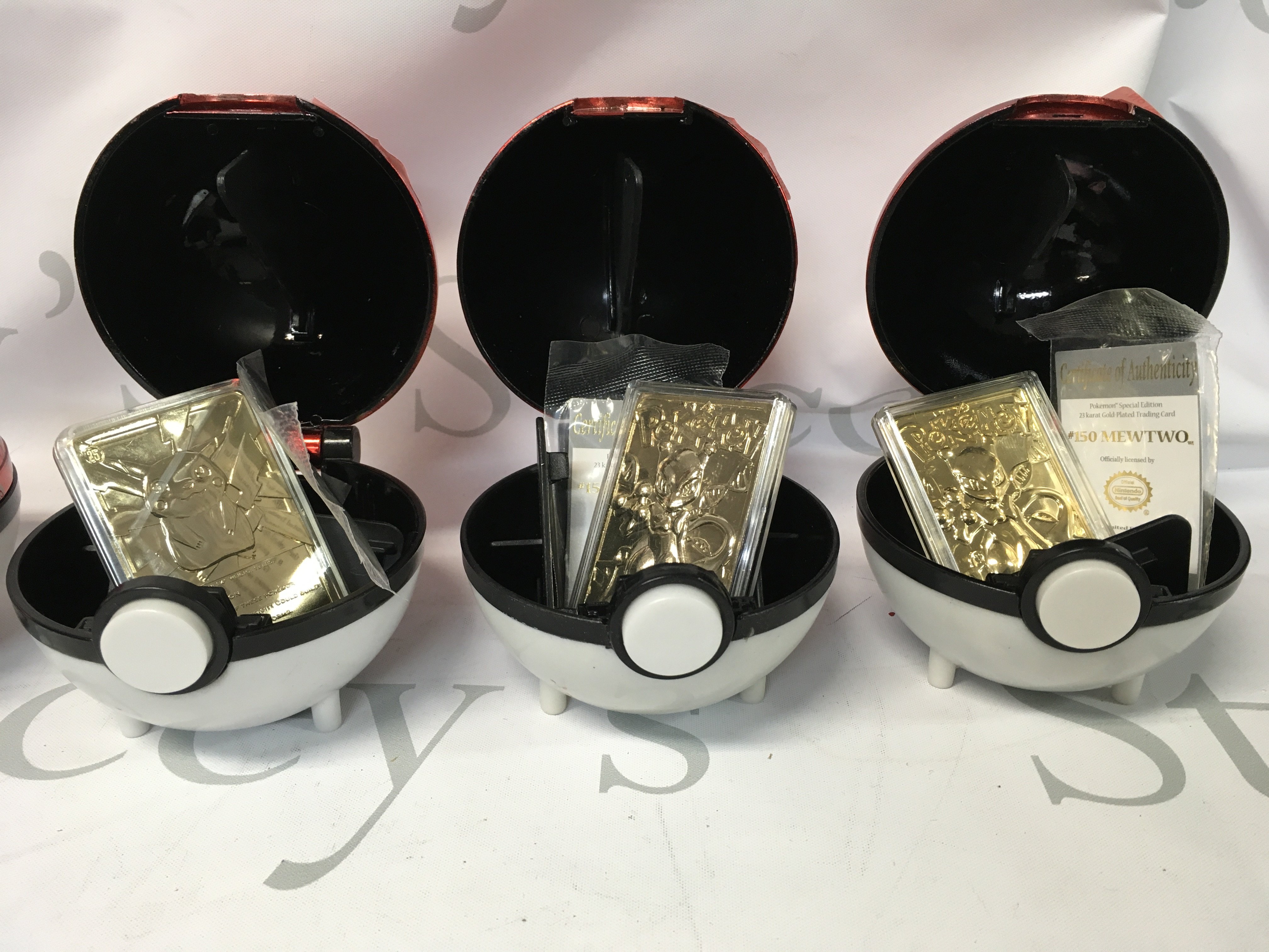A collection of 4 poke balls and 3 23k gold plated 1999 Pokémon cards. The cards are 2 Mewtos and Pickachu.