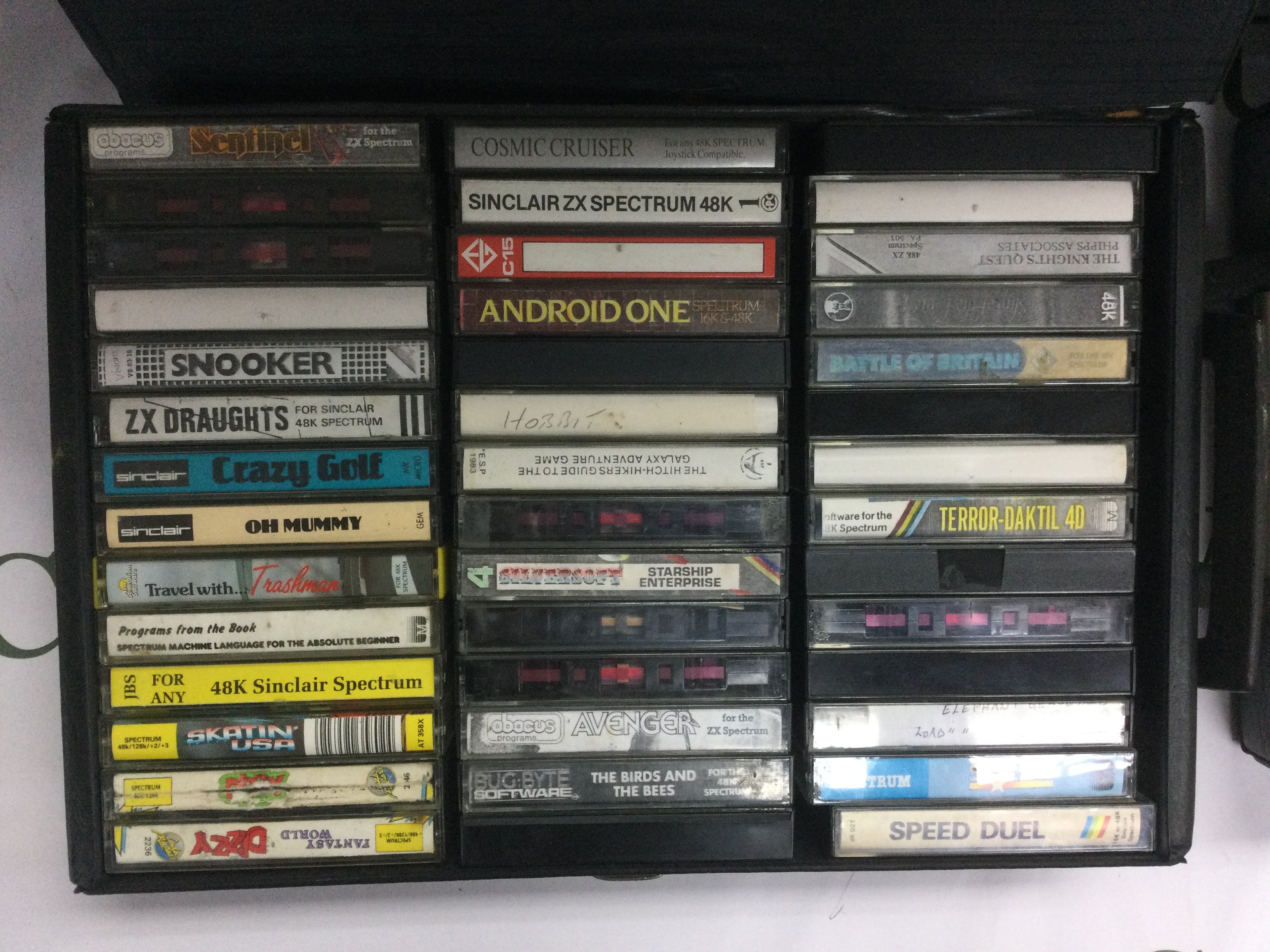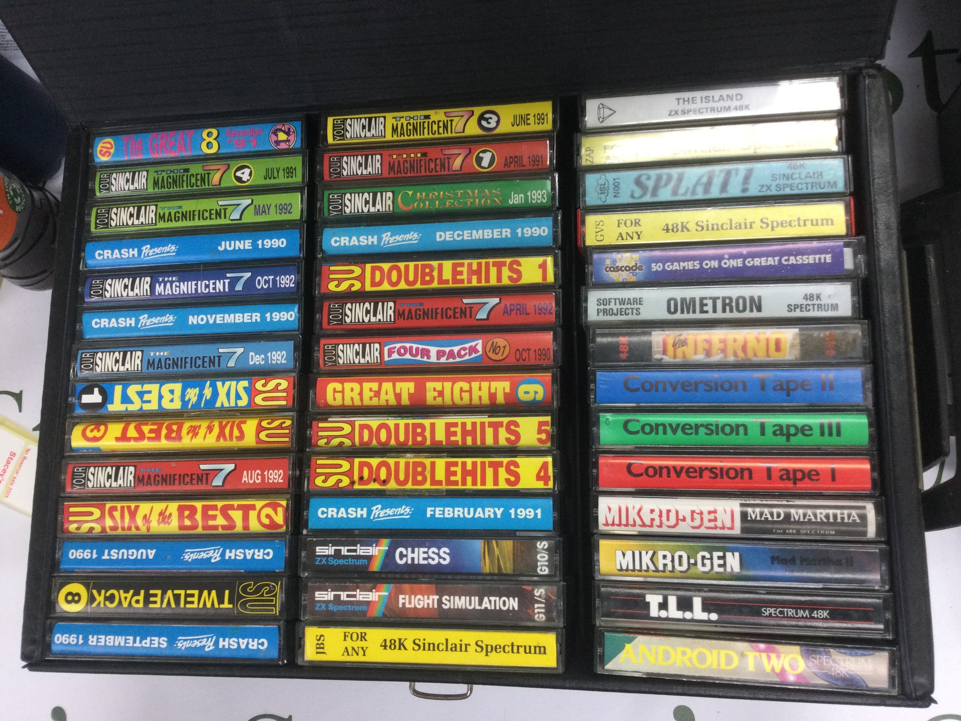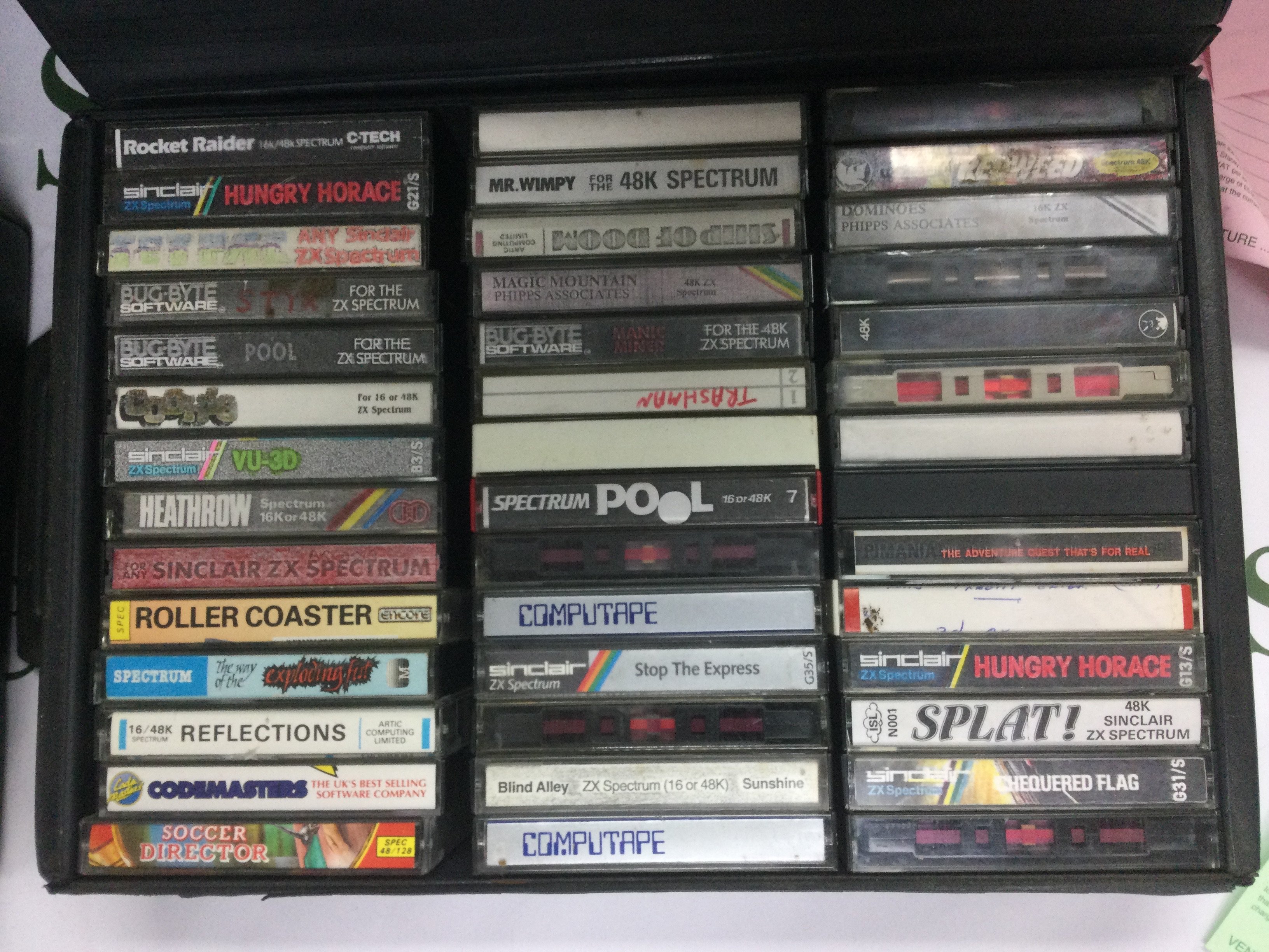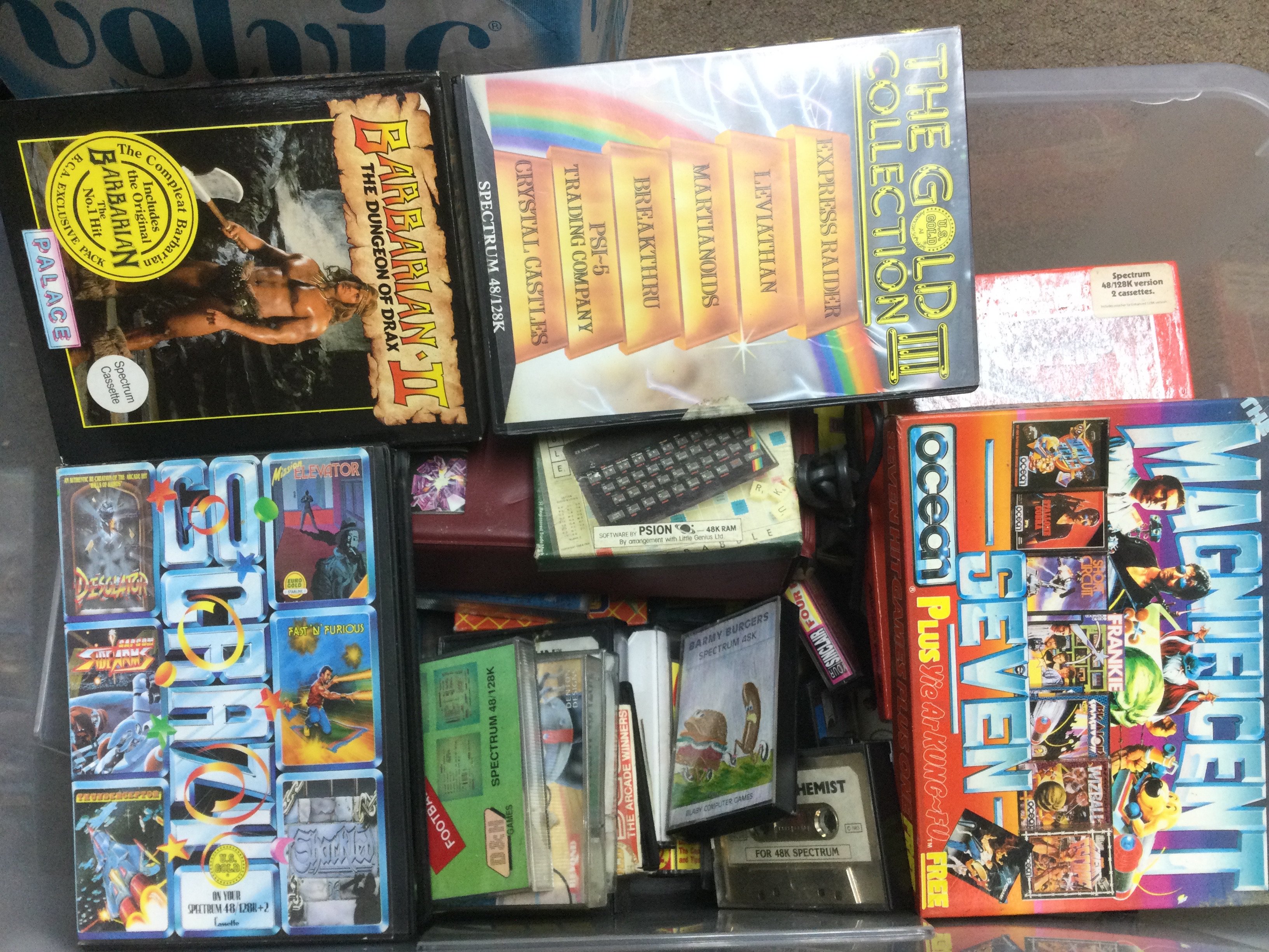 A box of vintage computer games comprising many Sinclair Spectrum games.