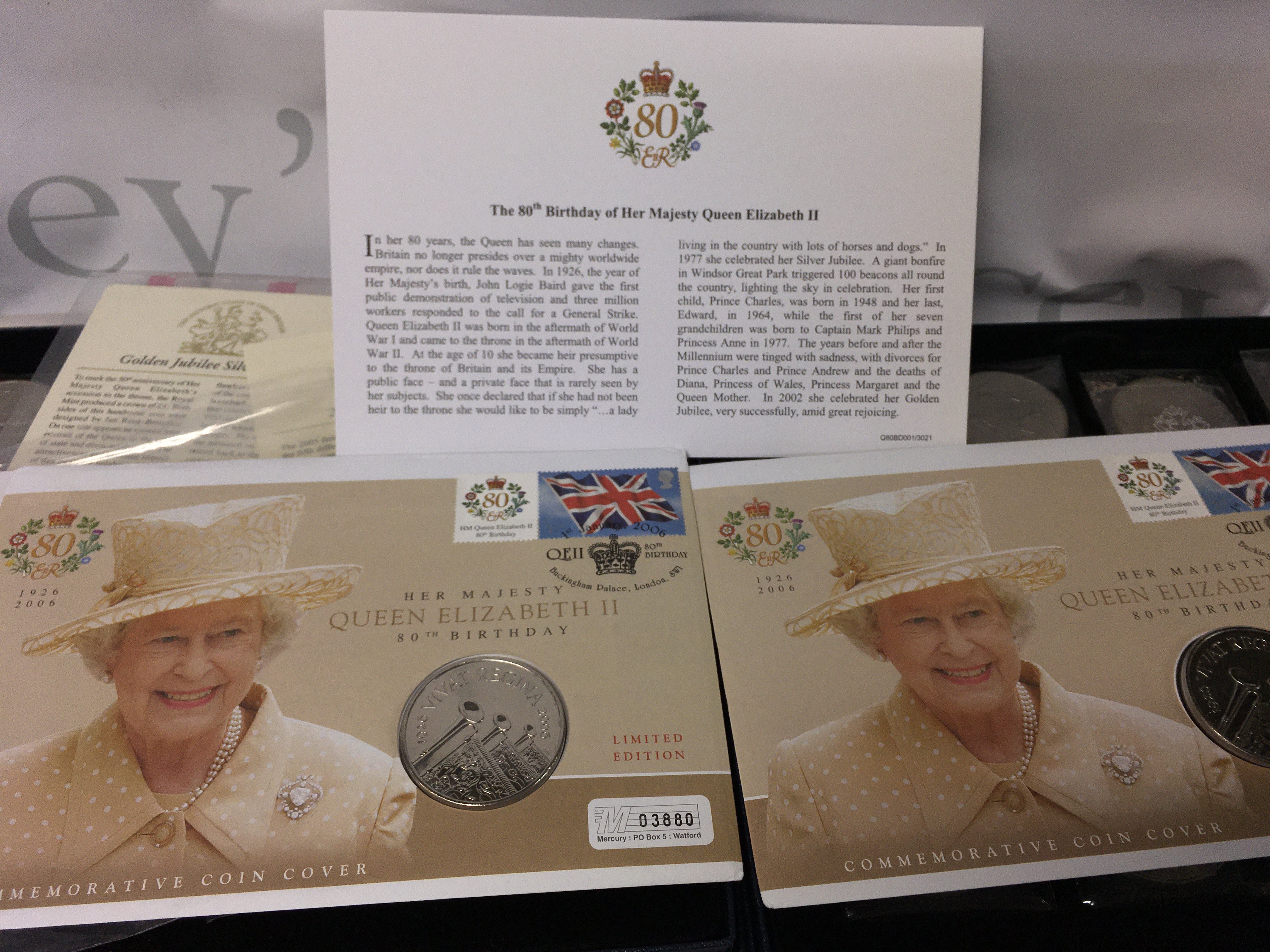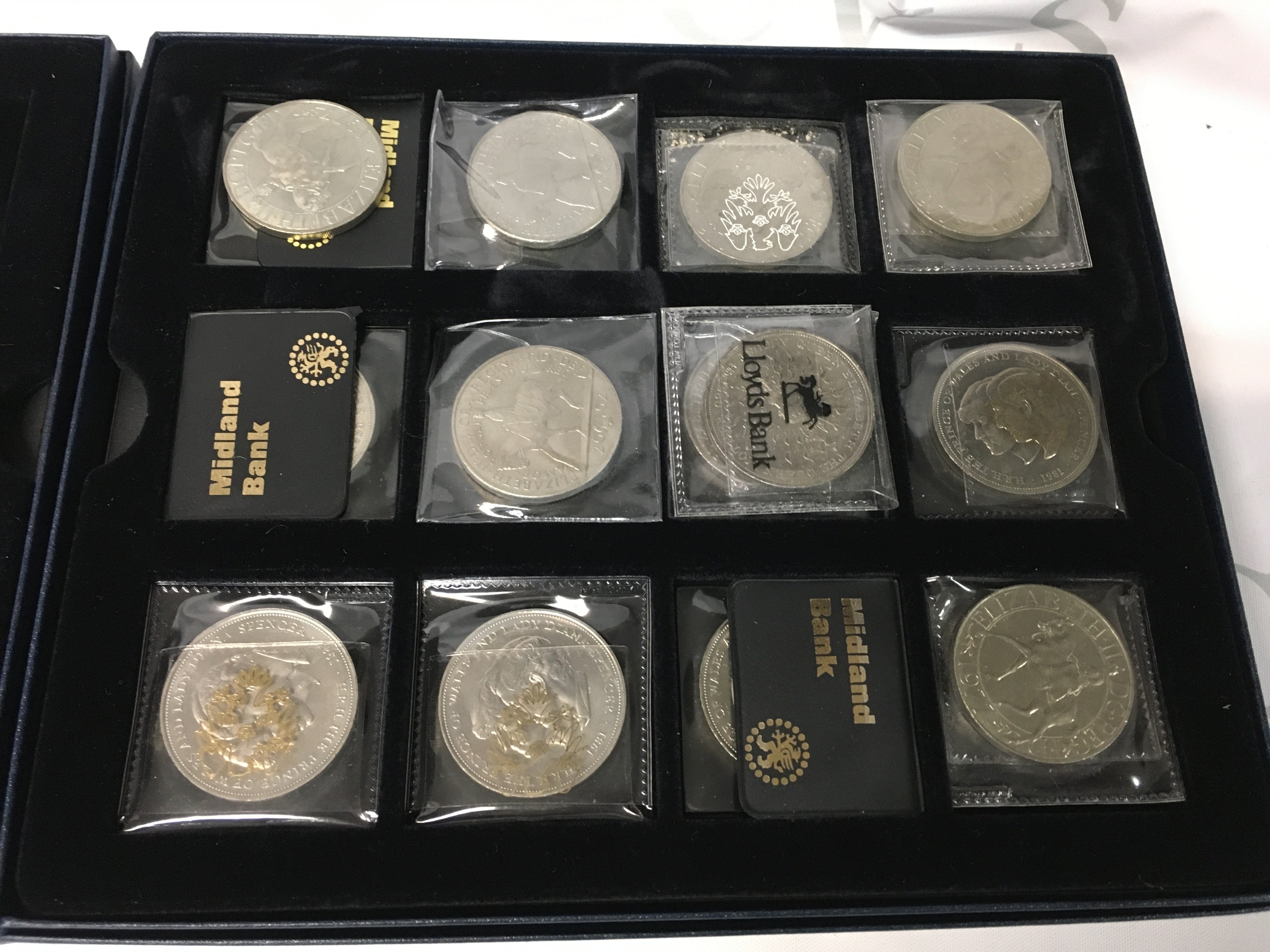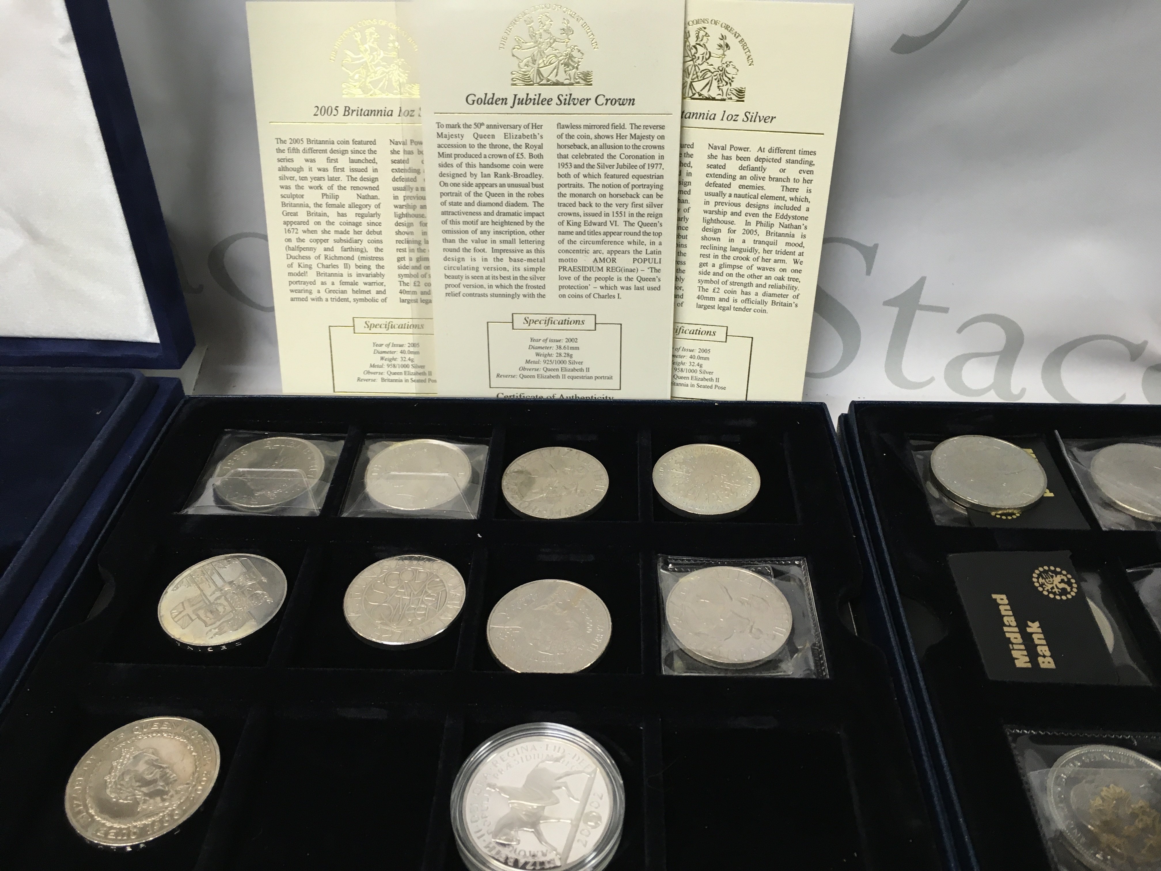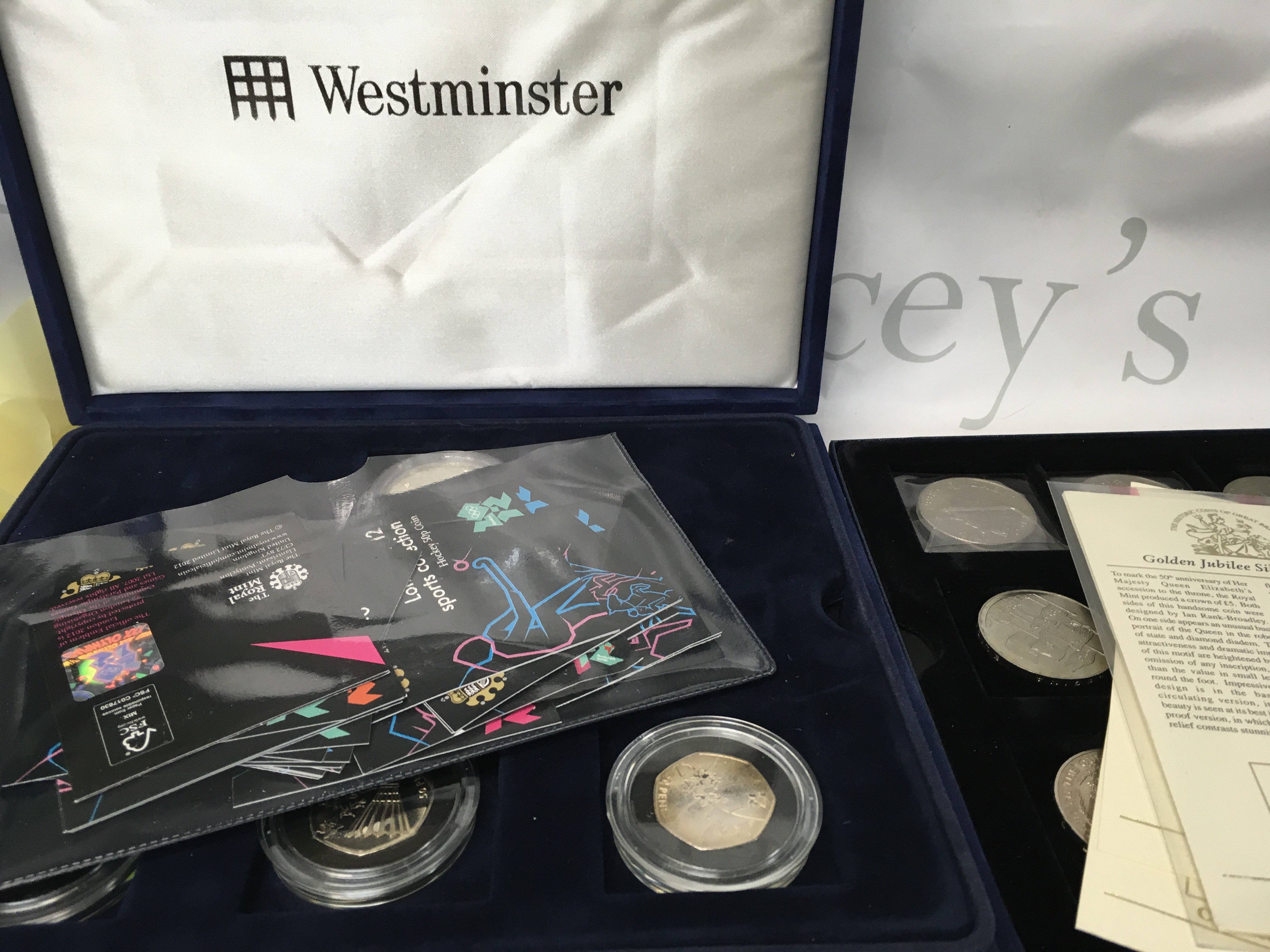 A large collection of coins including… a coin honouring the first U.S. Soviet Joint Space Mission, 2 2004 and 3 1998 official English squad medal collections, a small limited edition medal collection, British coins pre-1967, some 1 pound notes and some Royal Mail first class stamps, some Queen Elizabeth coins, The Railway Sesquicentennial Medallic First Day Cover and 3 large Westminster coin collections.