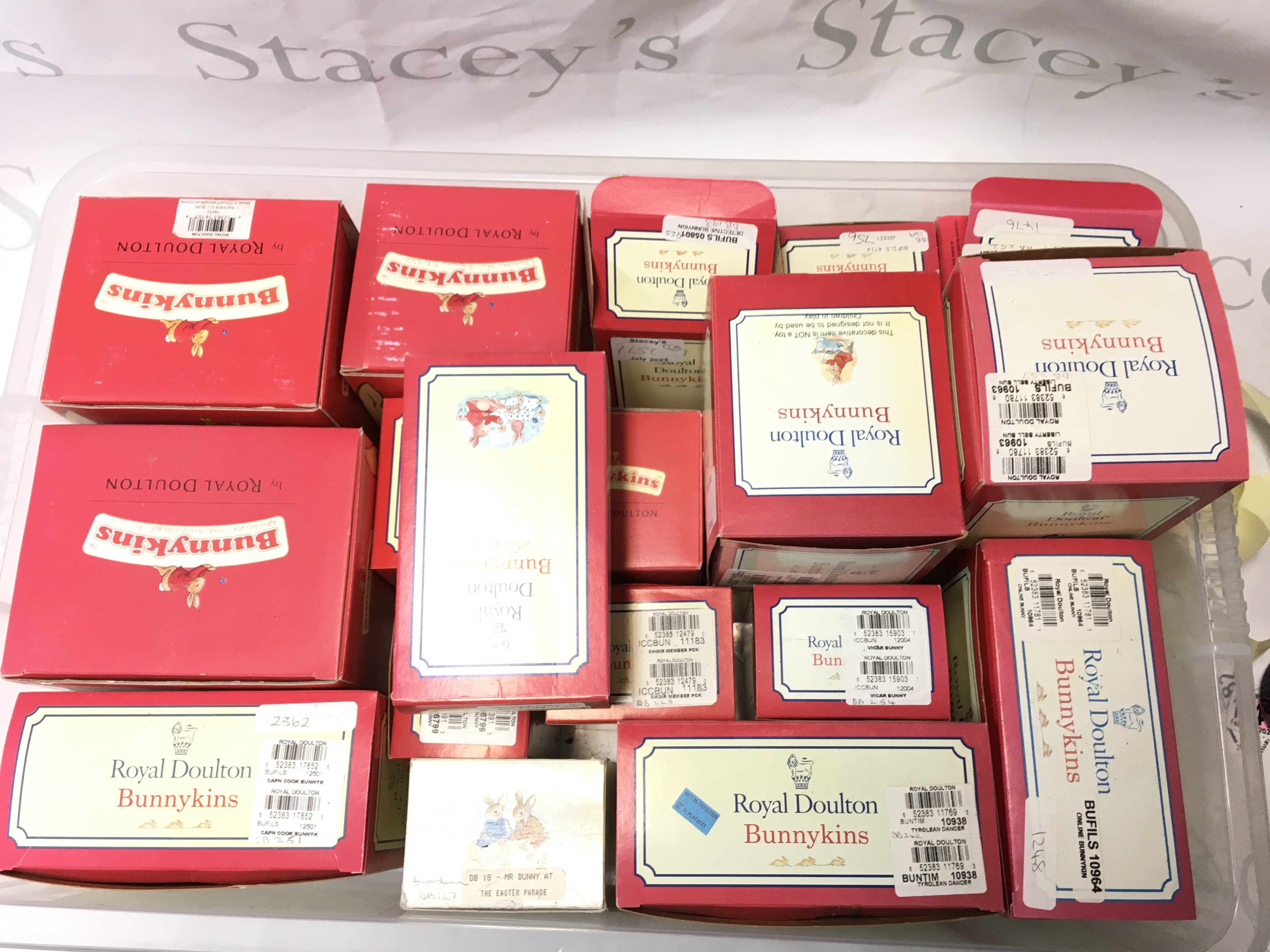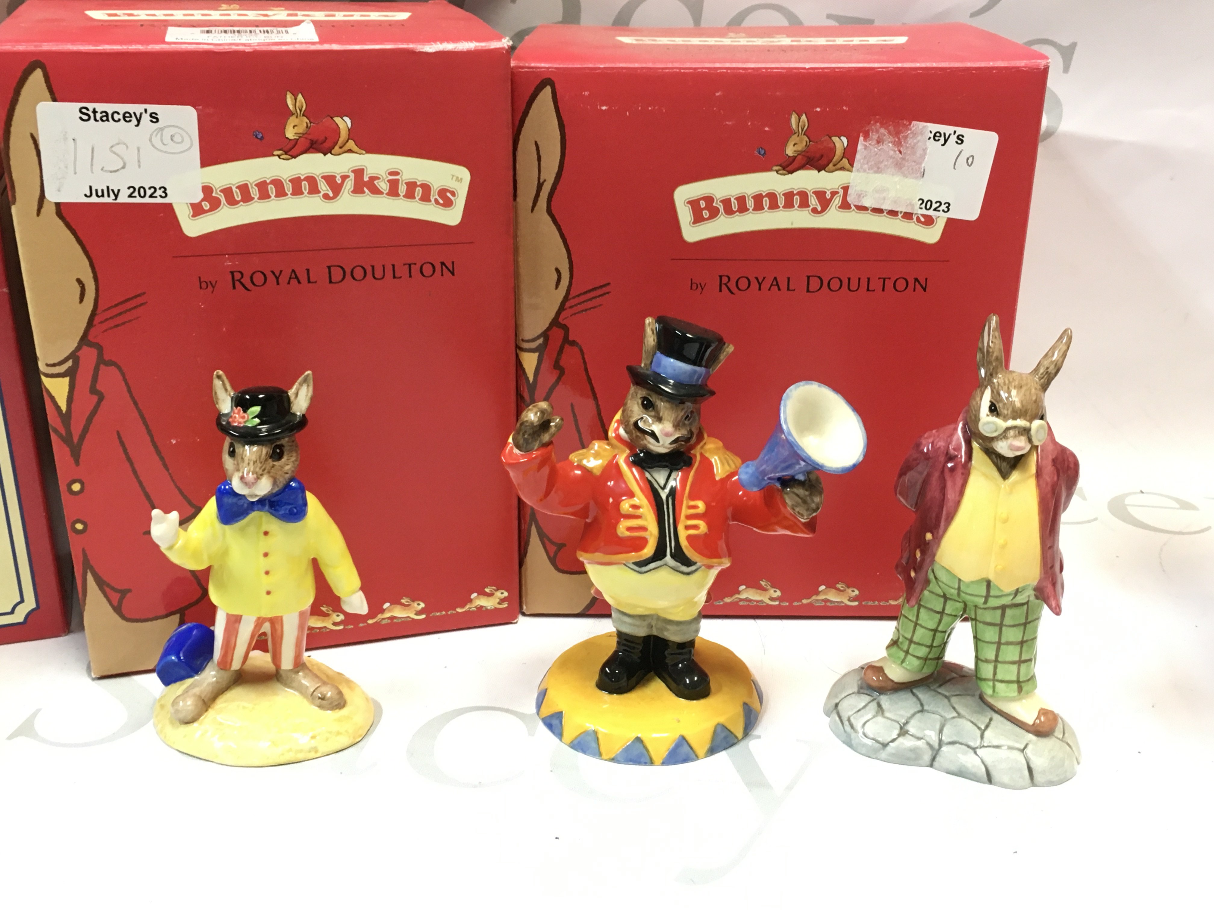 A large collection of boxed bunnykins figures including Joker Bunnykins, Father, Randolf the ringmaster etc