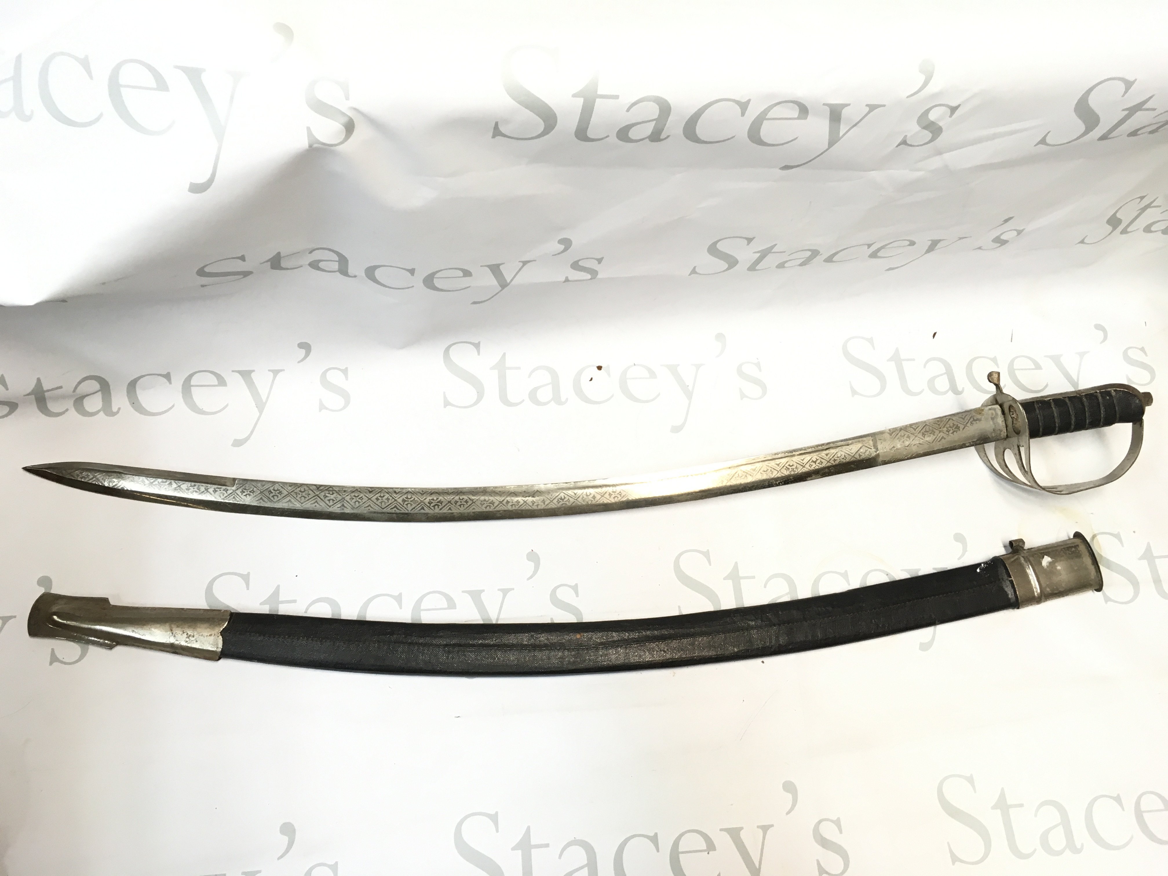 An Indian sword with scabbard and patterned blade design decoration. Blade 77 full length 90cm