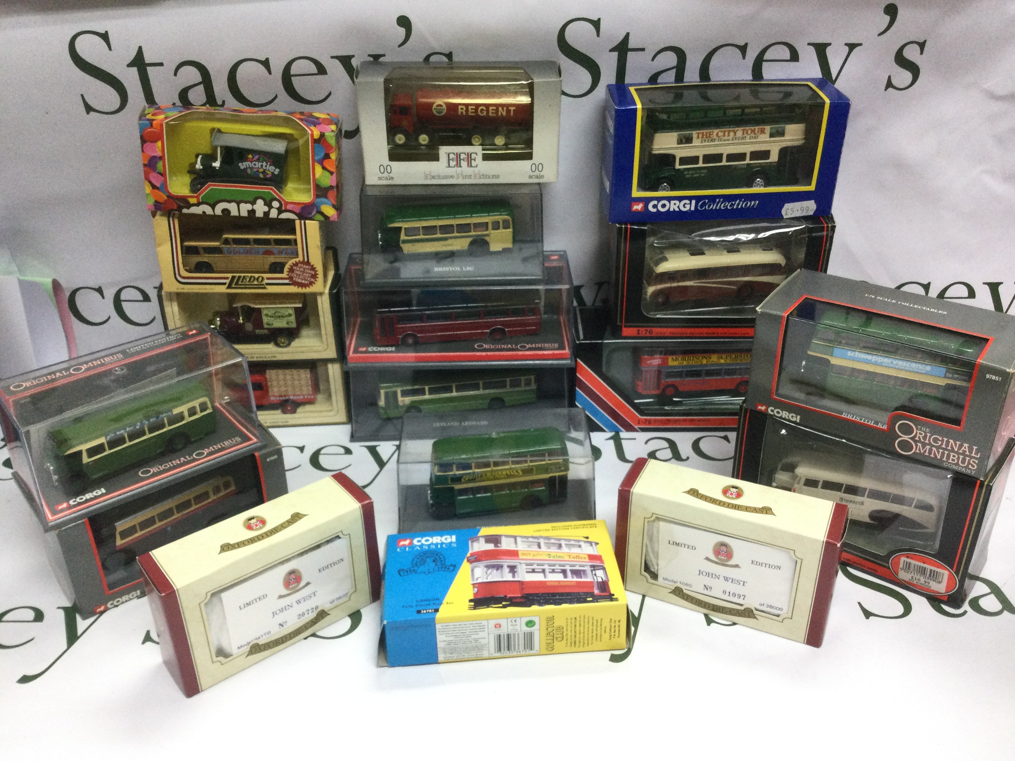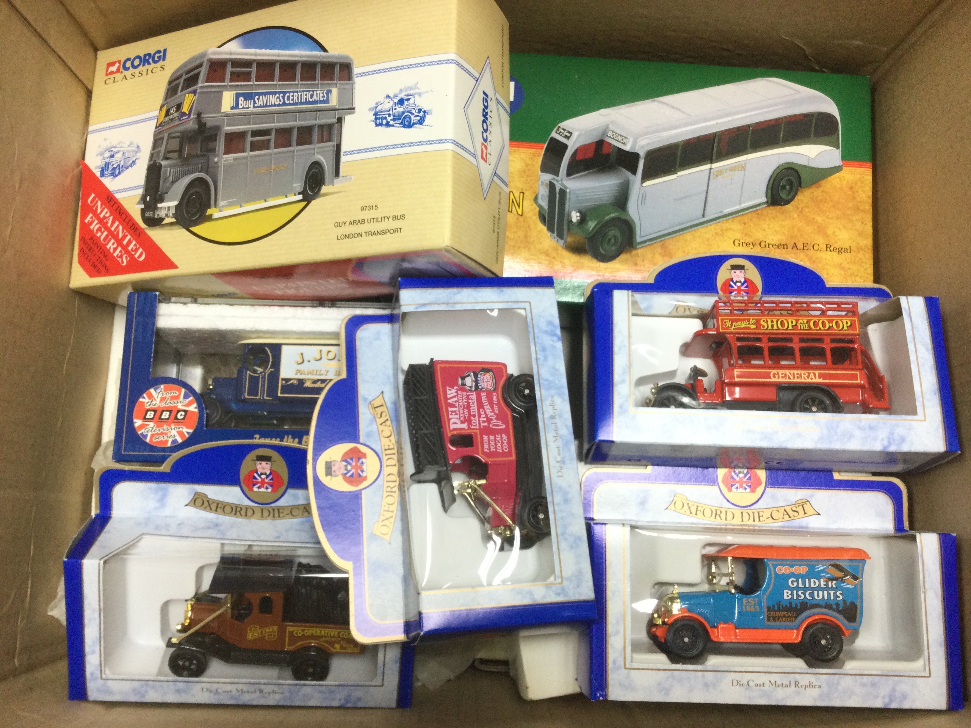 A box of die cast vehicles comprising mainly boxed buses.
