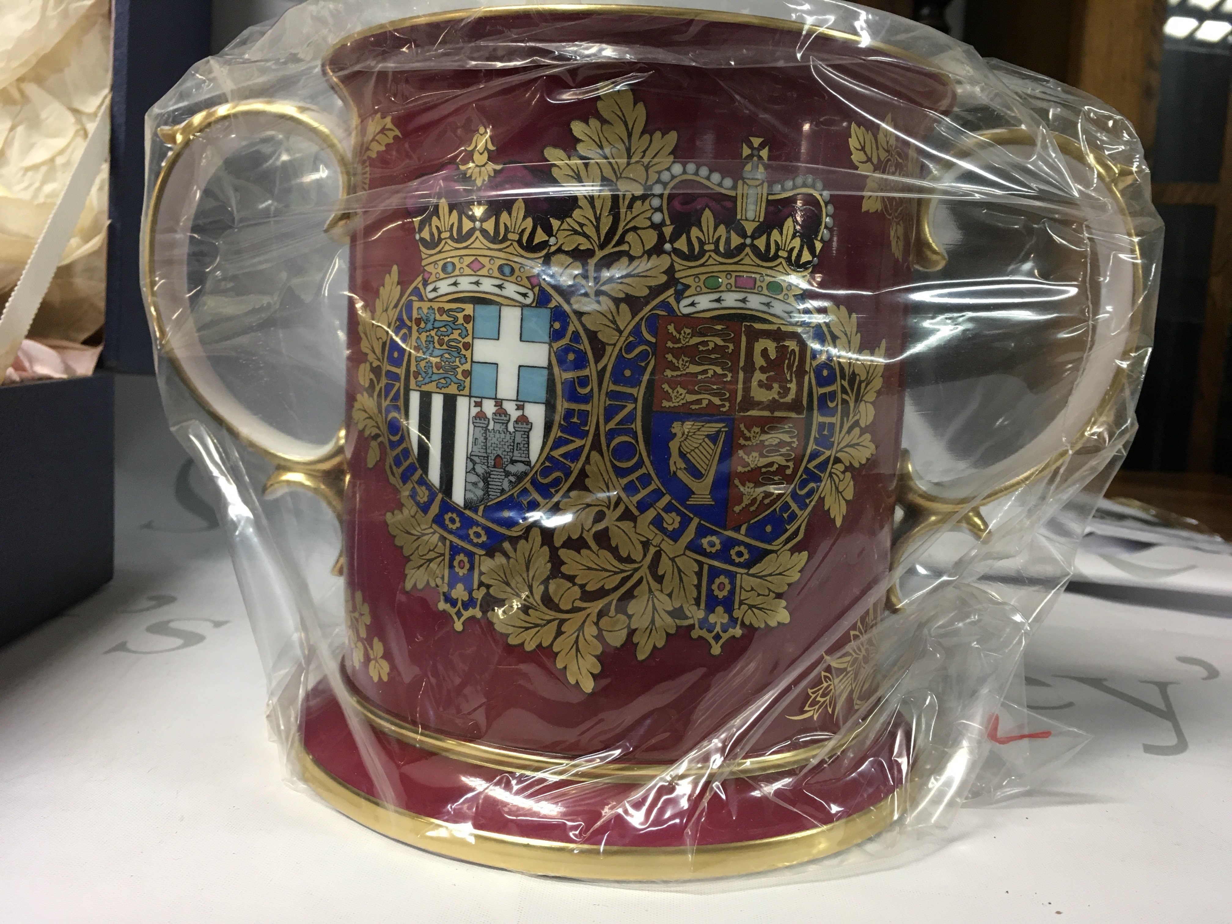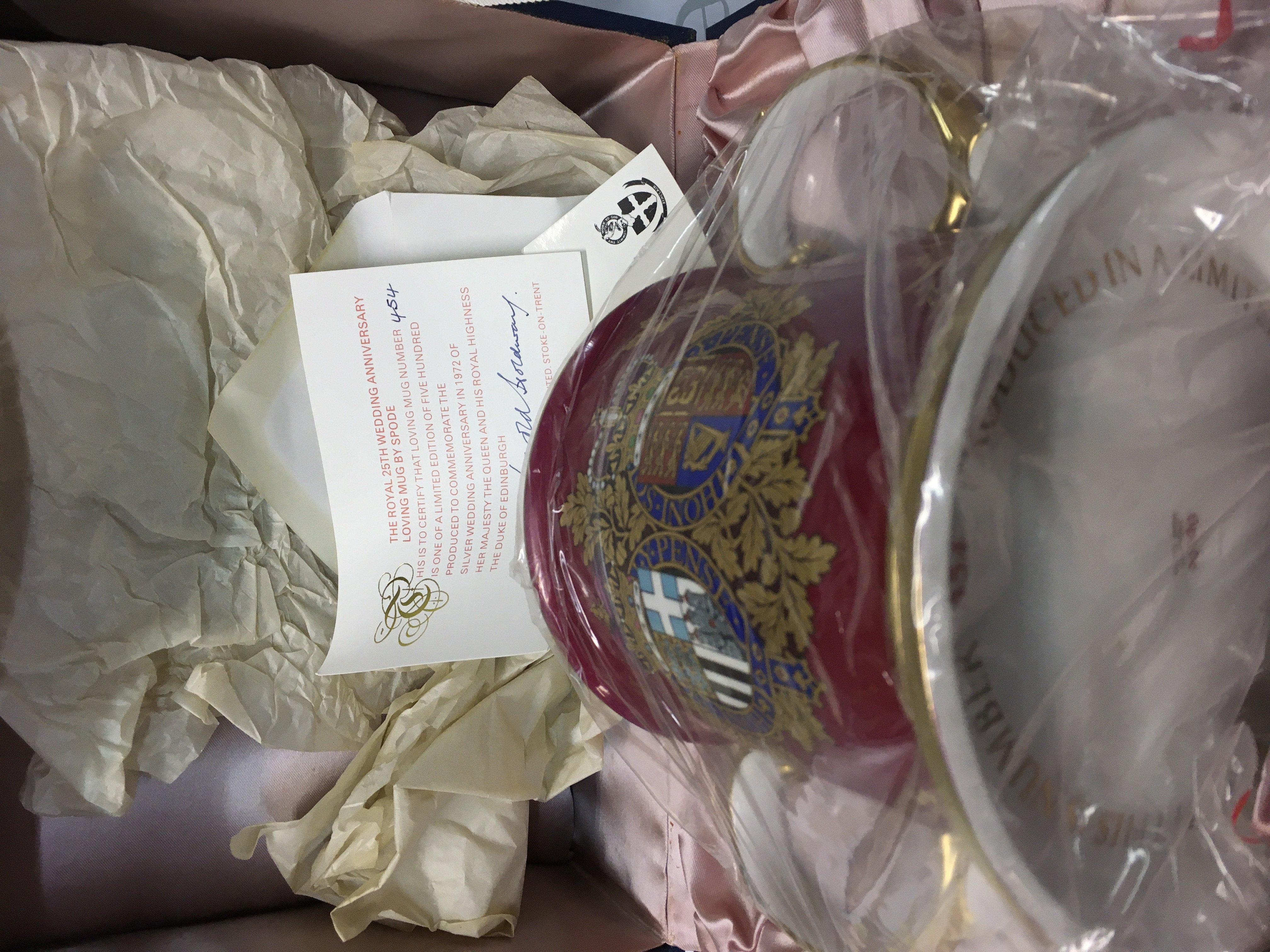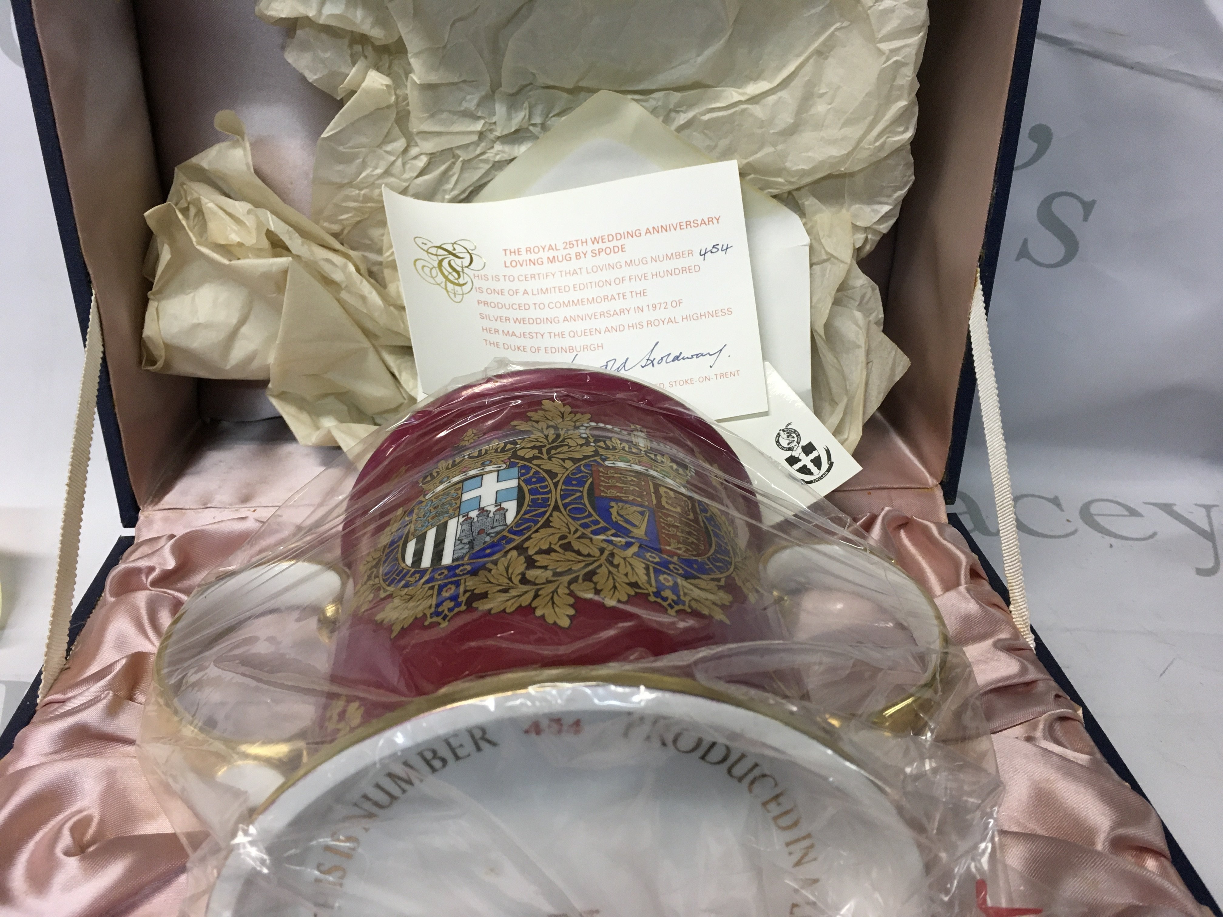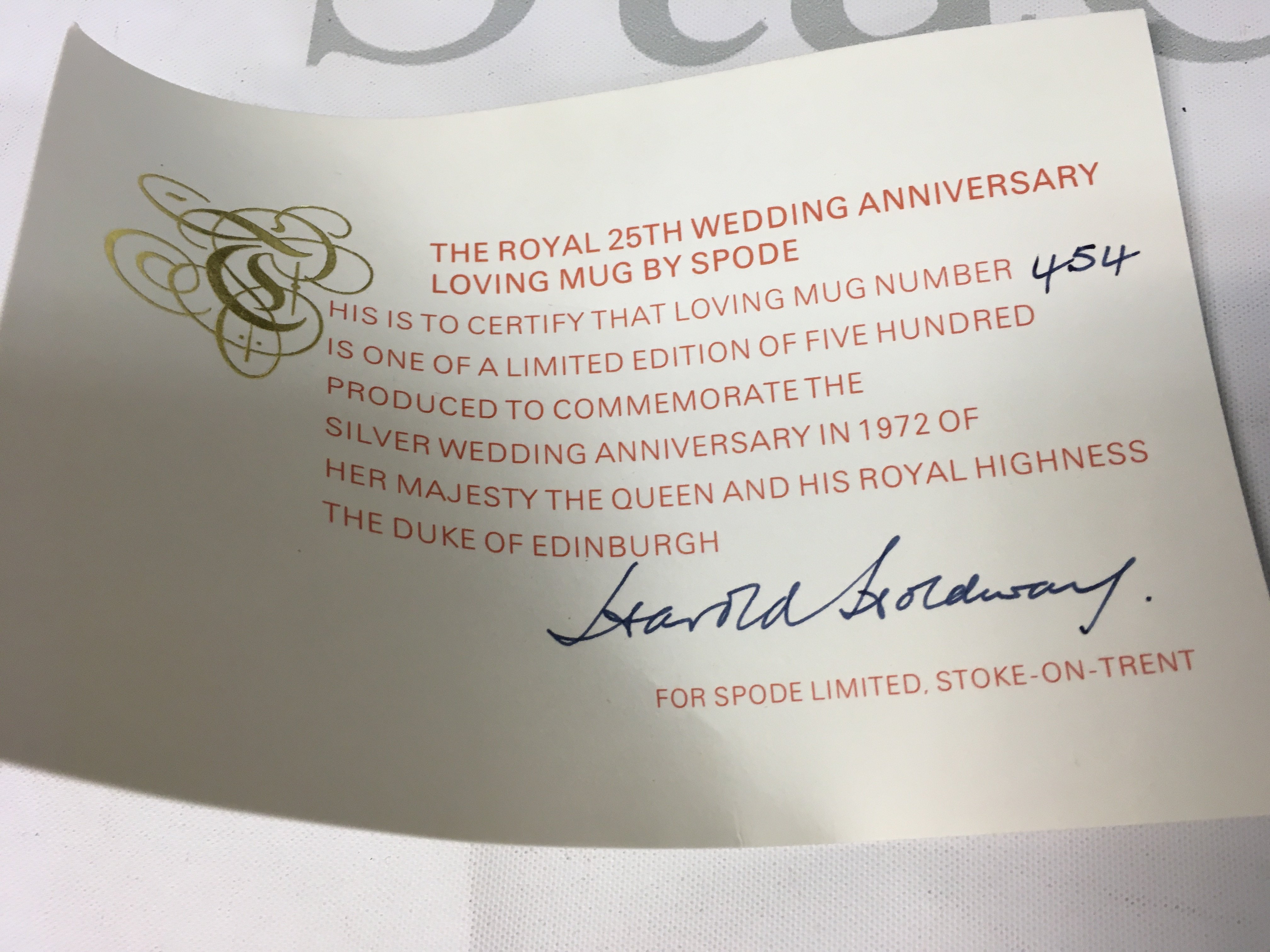 The Royal 25th Wedding Anniversary Loving Mug by Spode, number 454 of production out of 500 total, limited edition, measures roughly 16cm high and 26cm wide.