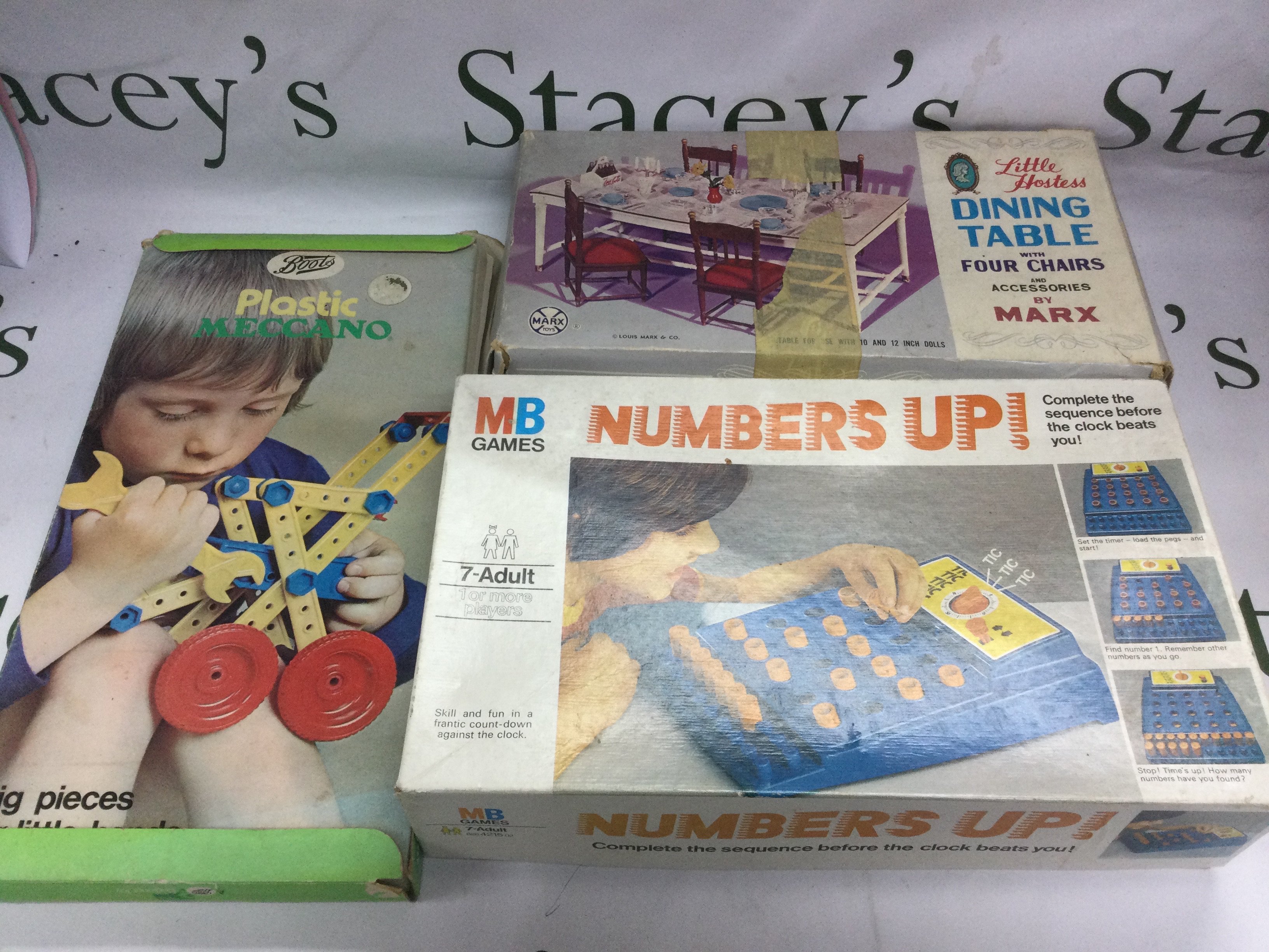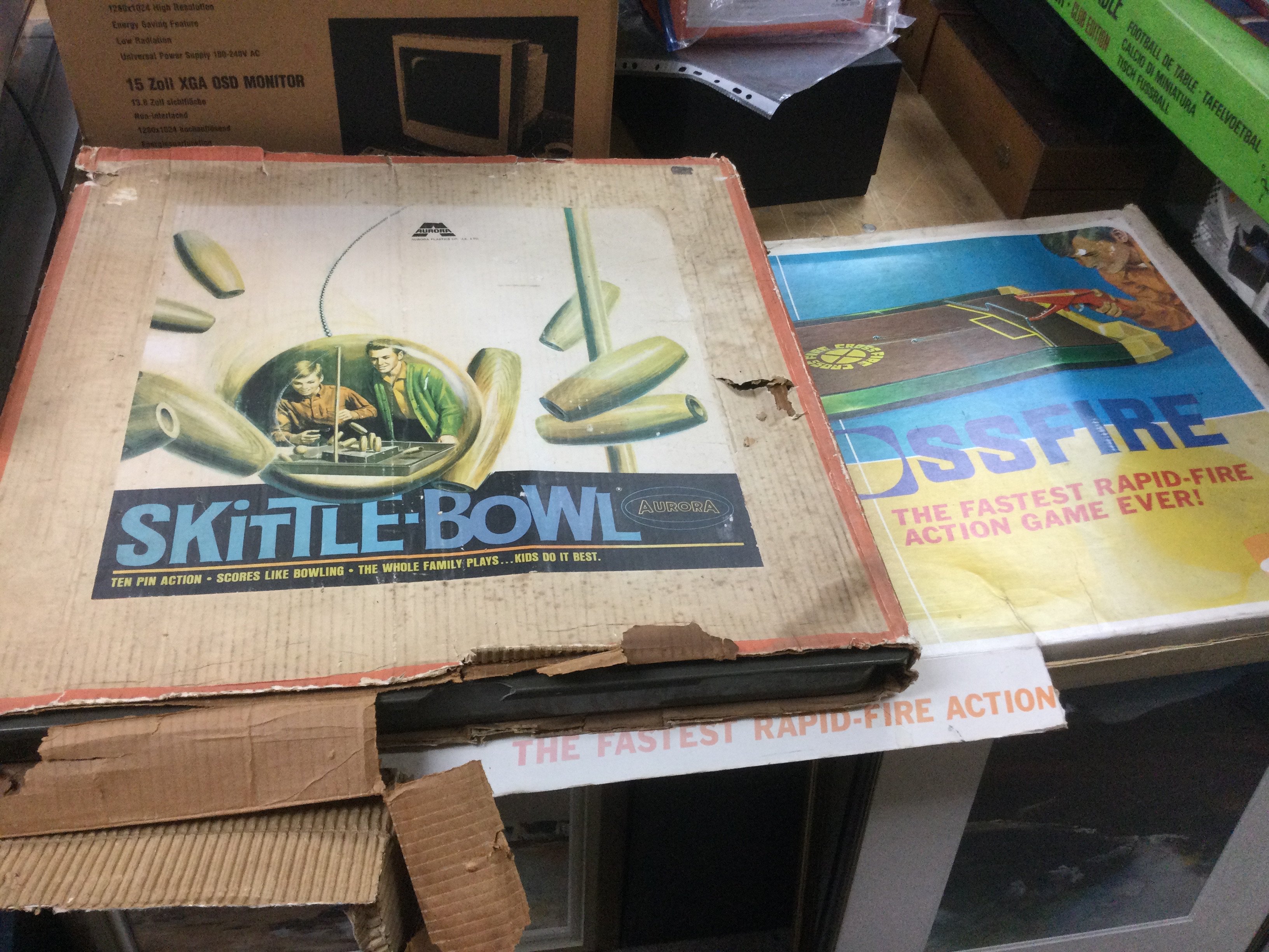 A collection of vintage board games including Crossfire, Skittle Bowl, Numbers Up and others.