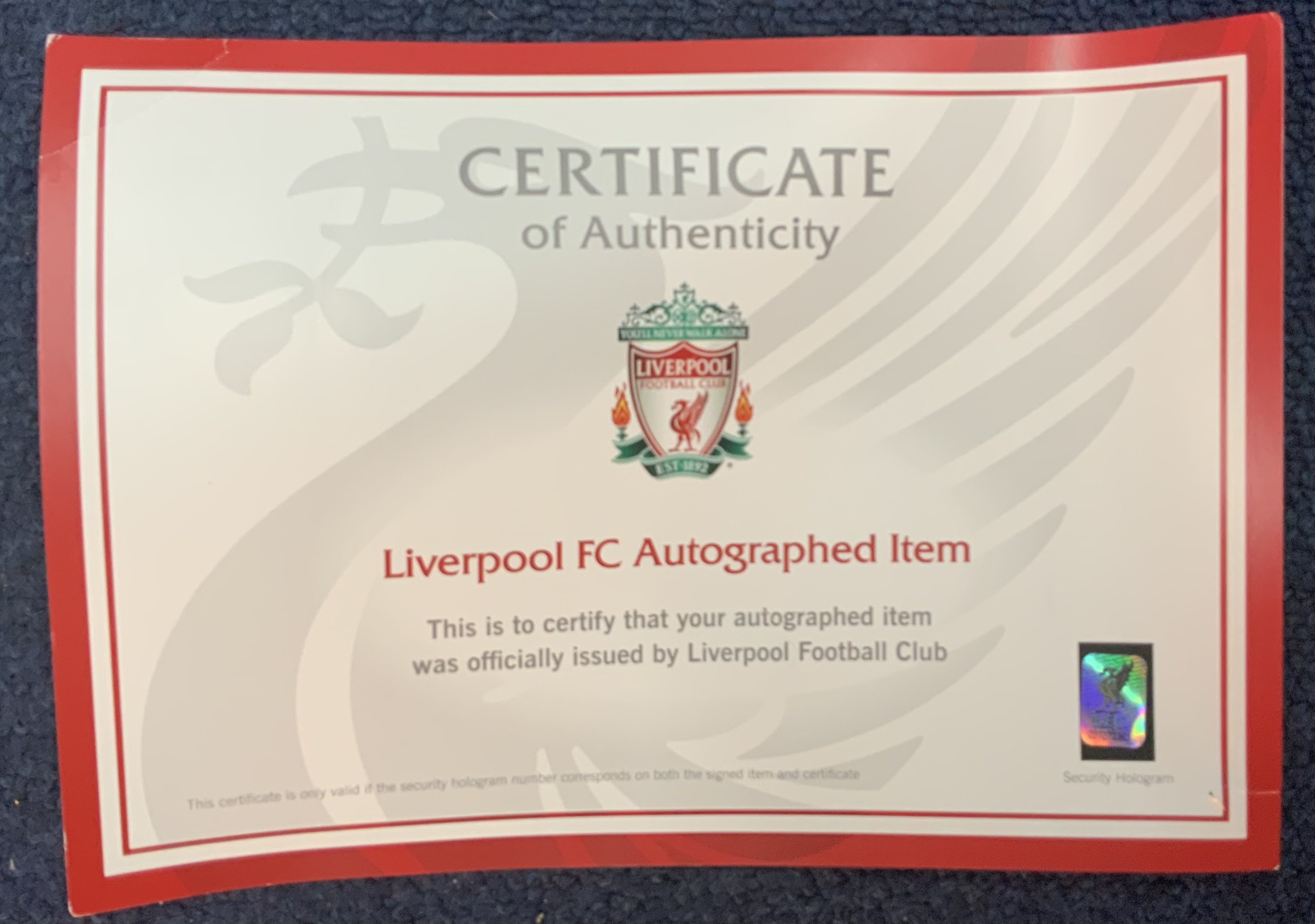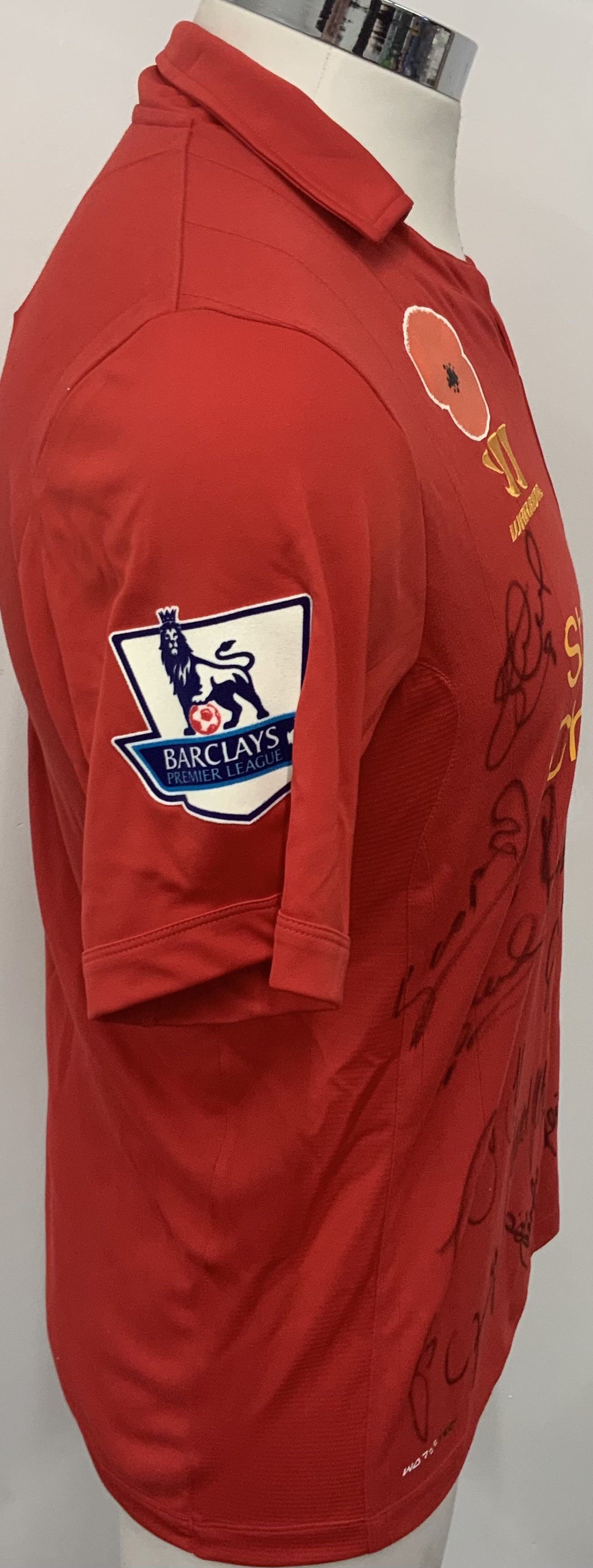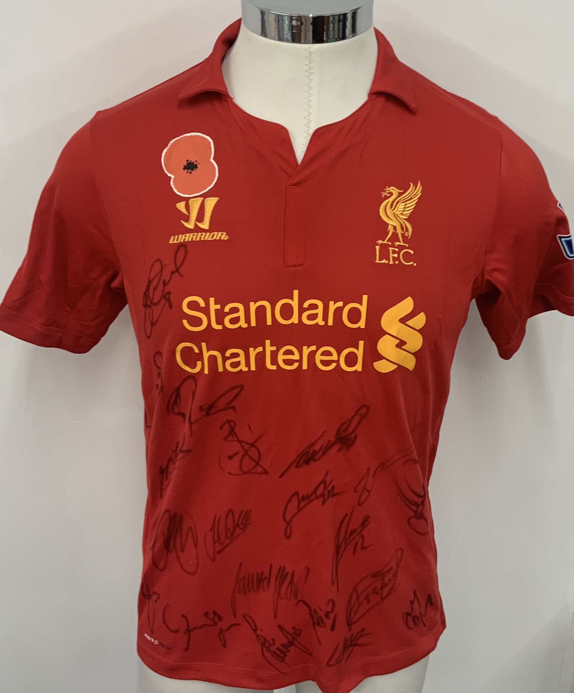 Liverpool 2012 - 2013 Match Worn Poppy Shirt. Red short sleeve shirt with Premier League badging to sleeves. Worn v Chelsea on 11 November 2012 by Sahin 4. Shirt is squad signed to the front and comes with COA from Liverpool FC to cover autographs.