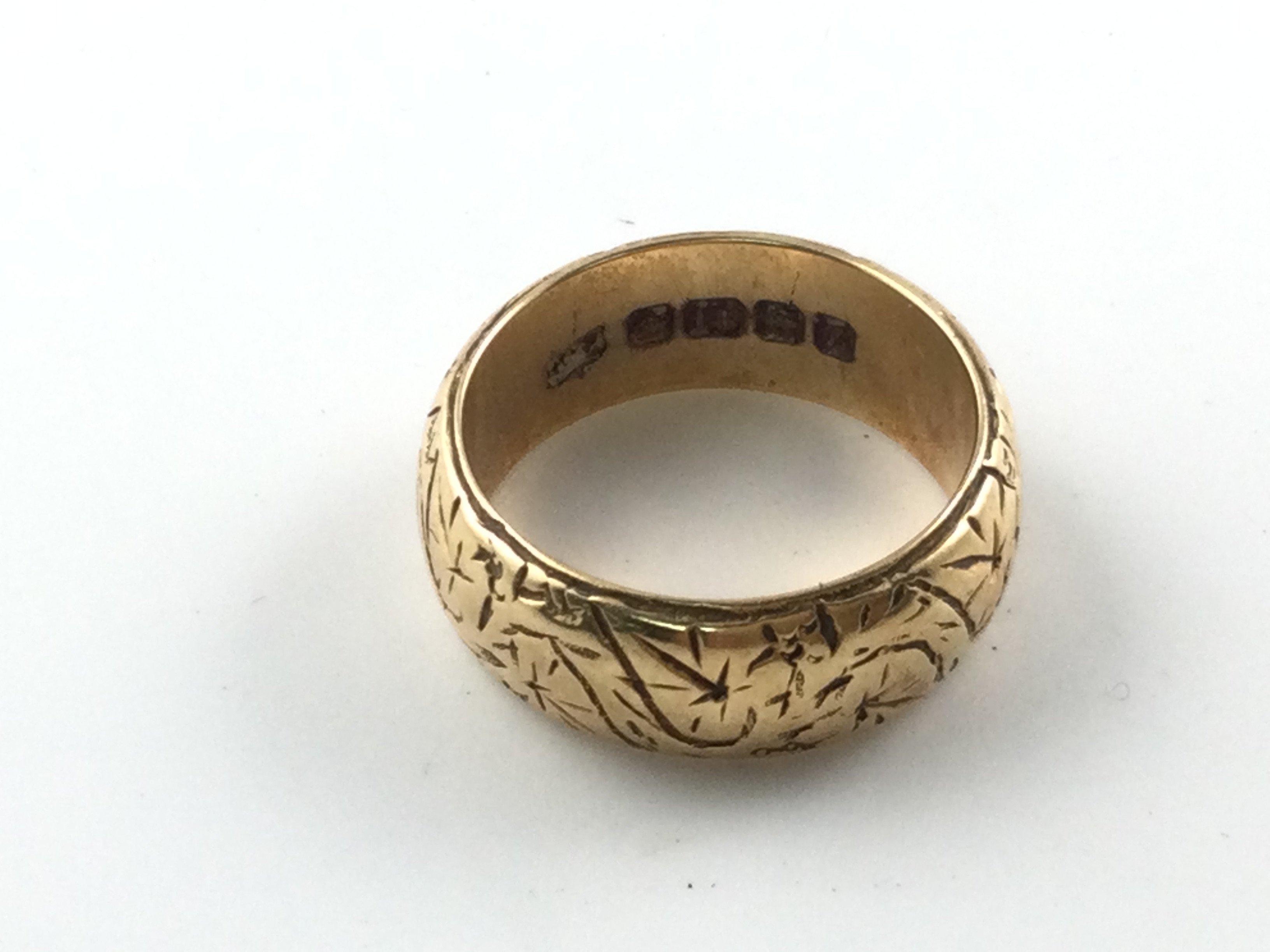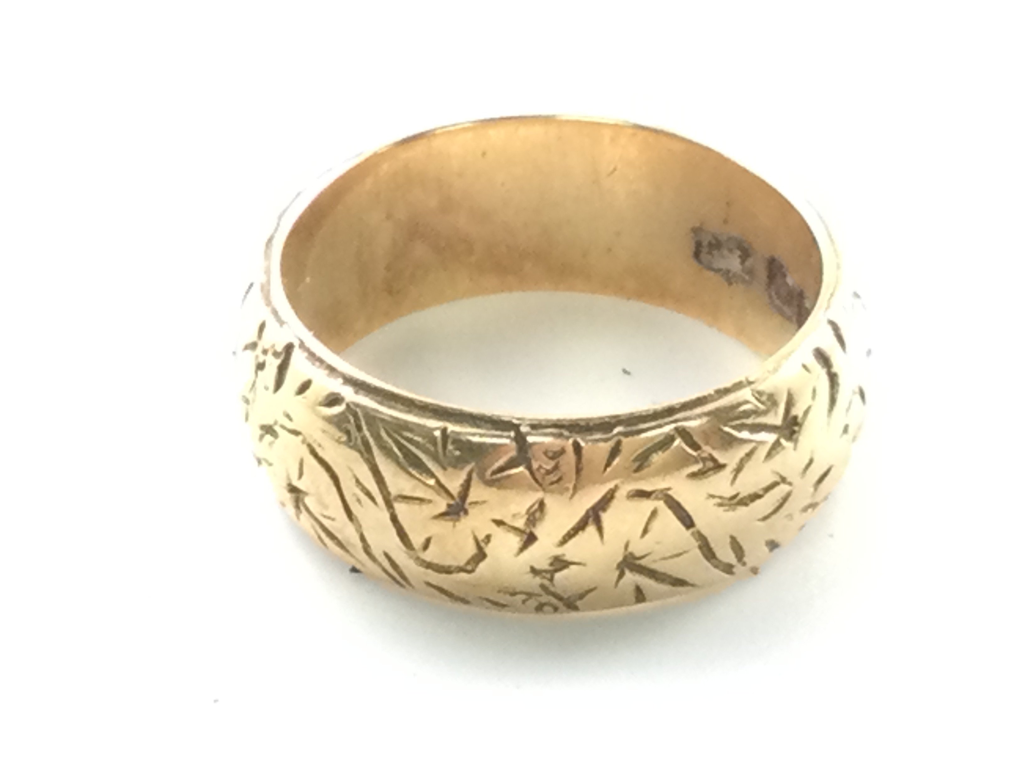 An 18ct gold wedding band with decorative engraving. 10.27g and size NPostage A