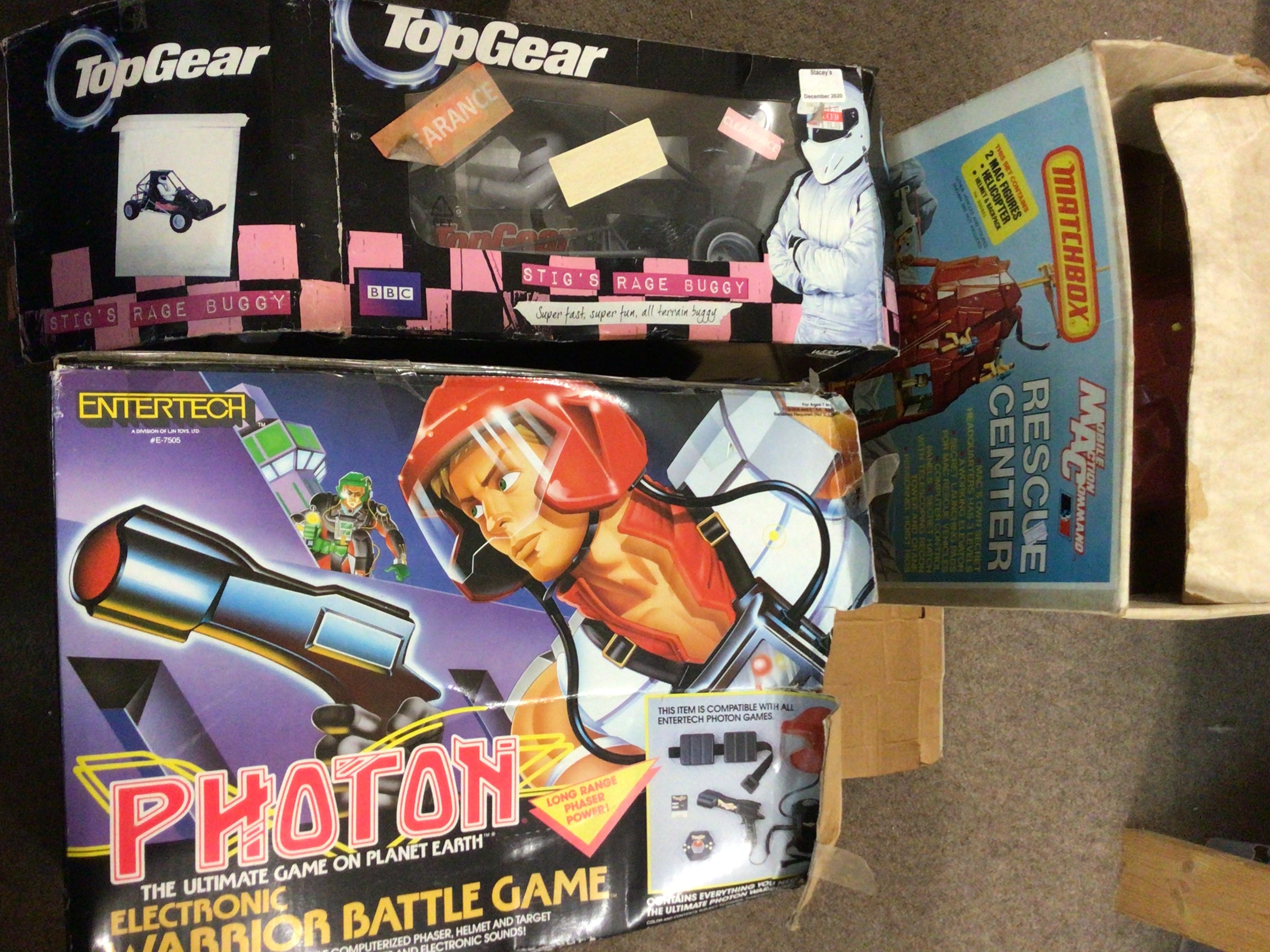 A collection of boxed vintage toys including a Matchbox MAC Rescue center play set, Top Gear stigs race buggy, Photon electronic warrior battle game