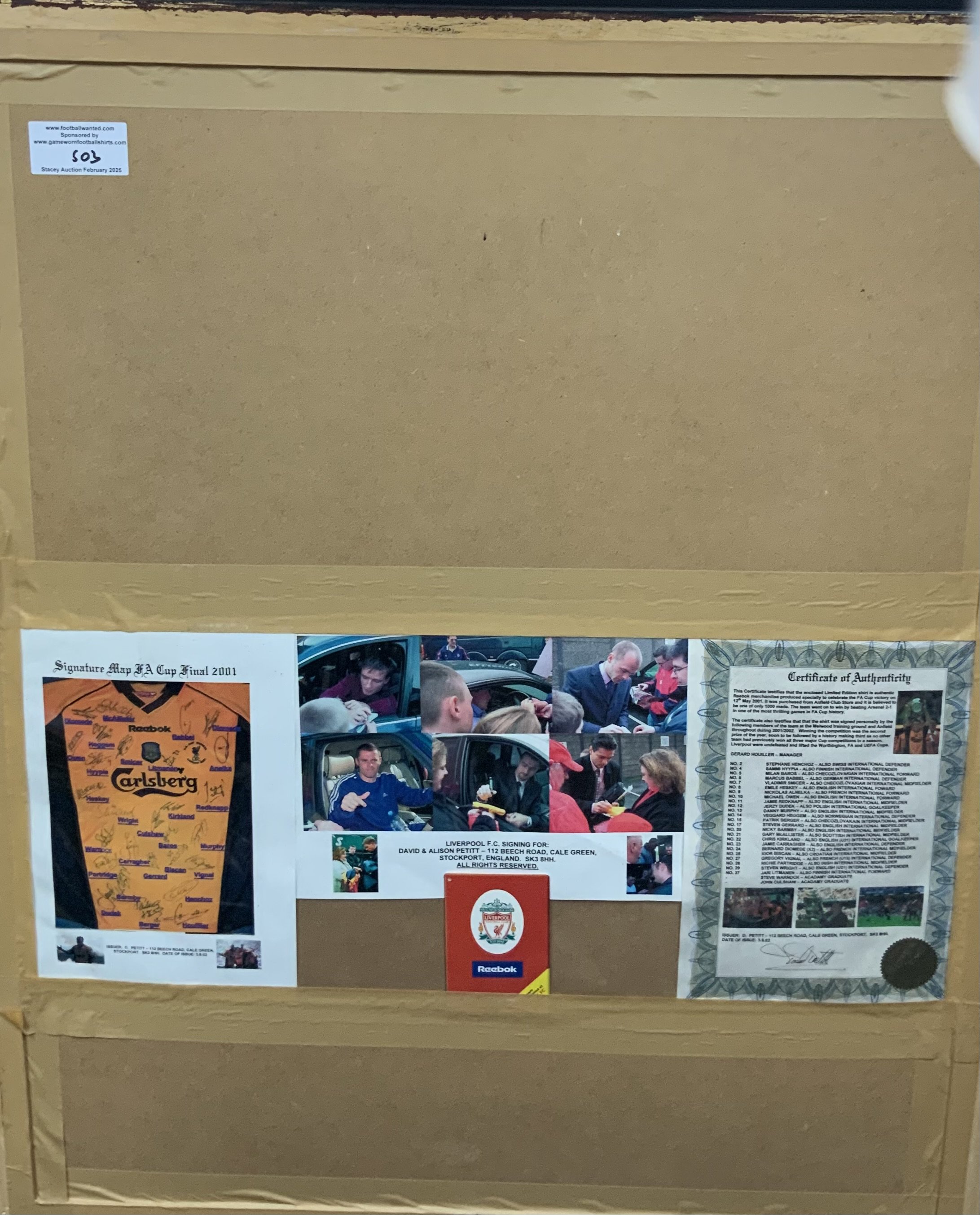 Liverpool 2001 FA Cup Winners Squad Signed Framed Football Shirt: Comes with COA and signature map. Frame measures approximately 38 x 31 inches. Shirt is embossed with FA Cup winners Cardiff 2001. Not for posting.