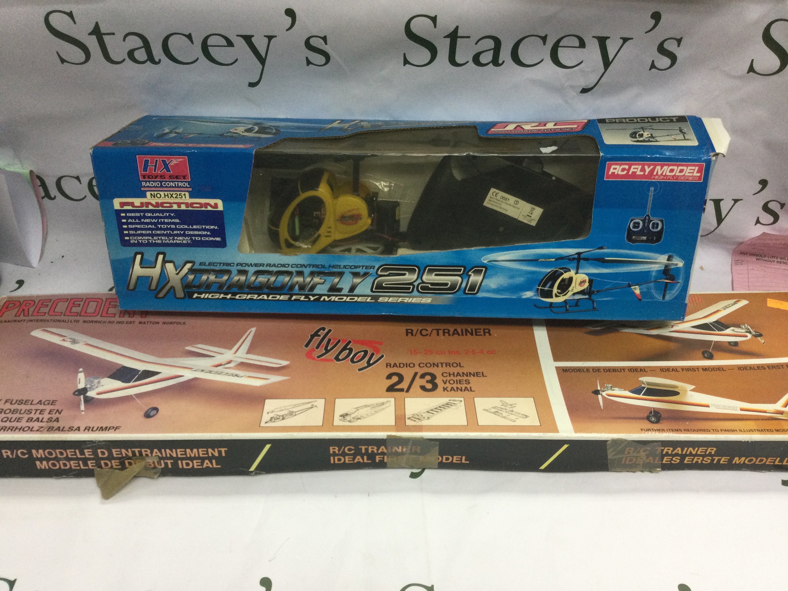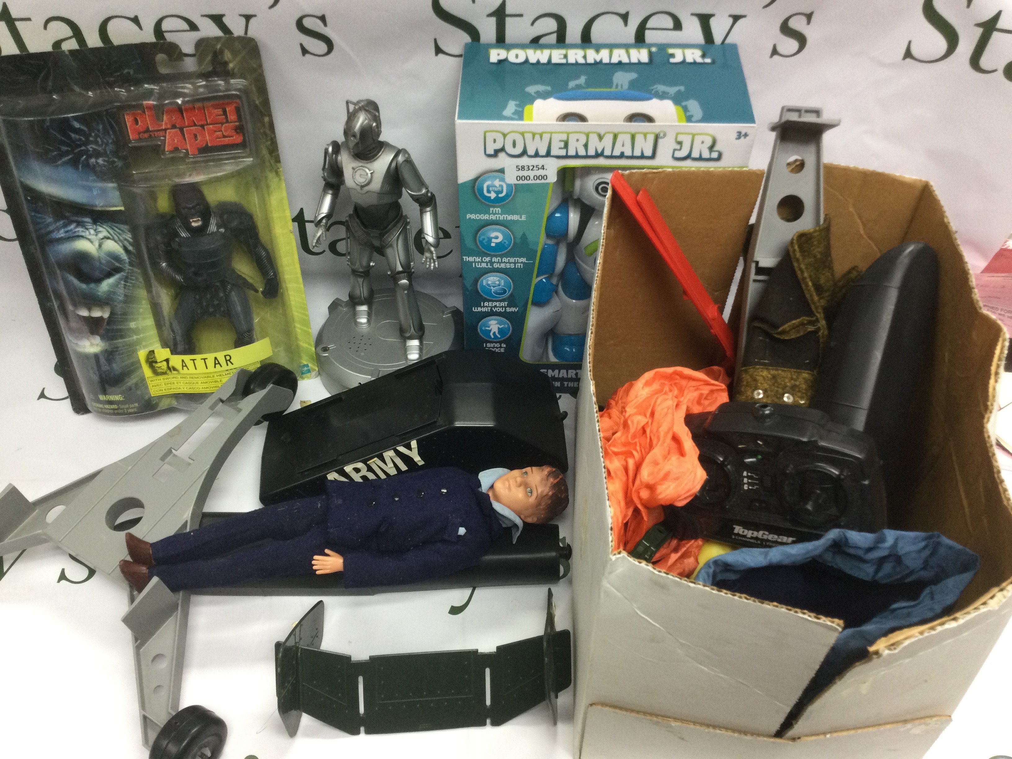 A box of toys and models comprising Action Man outfits, a remote control Helicopter and other items.