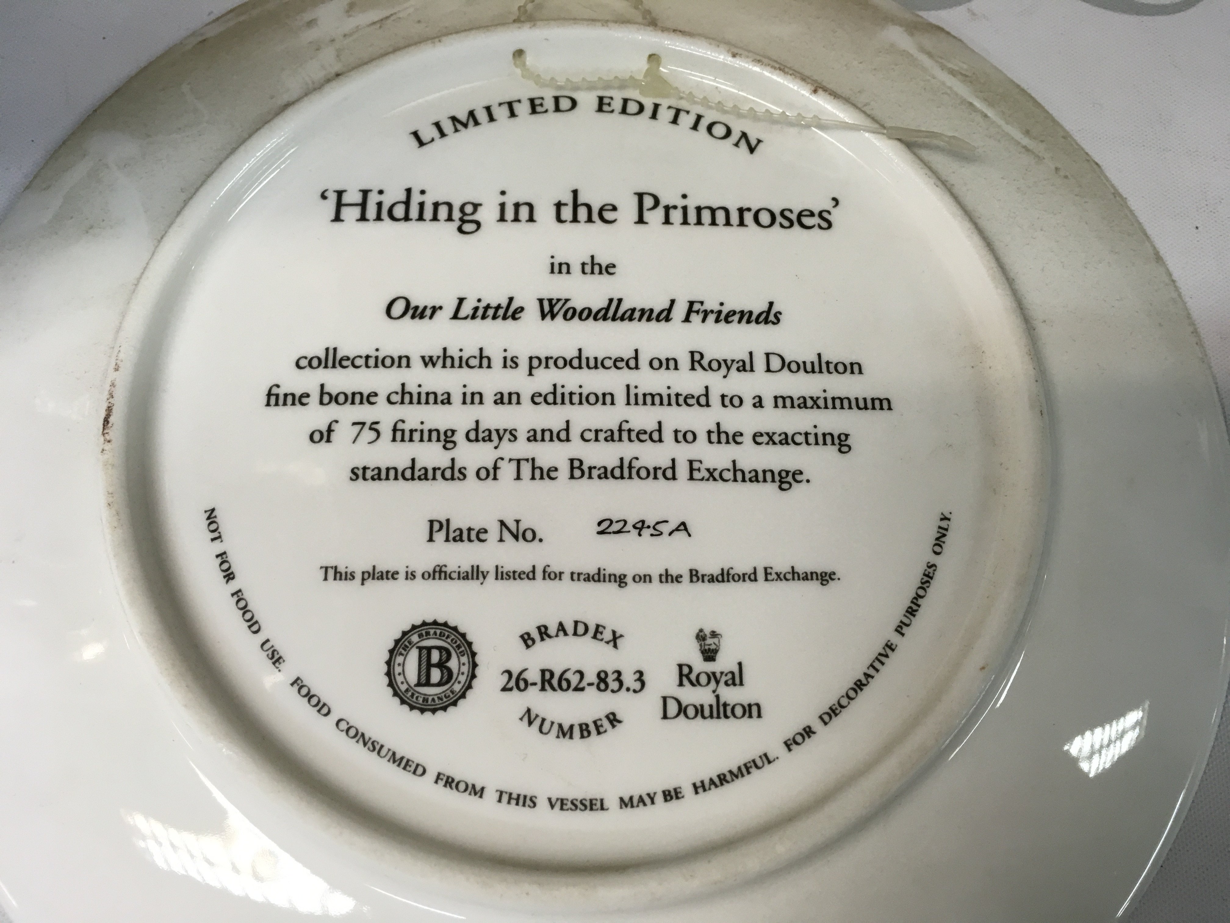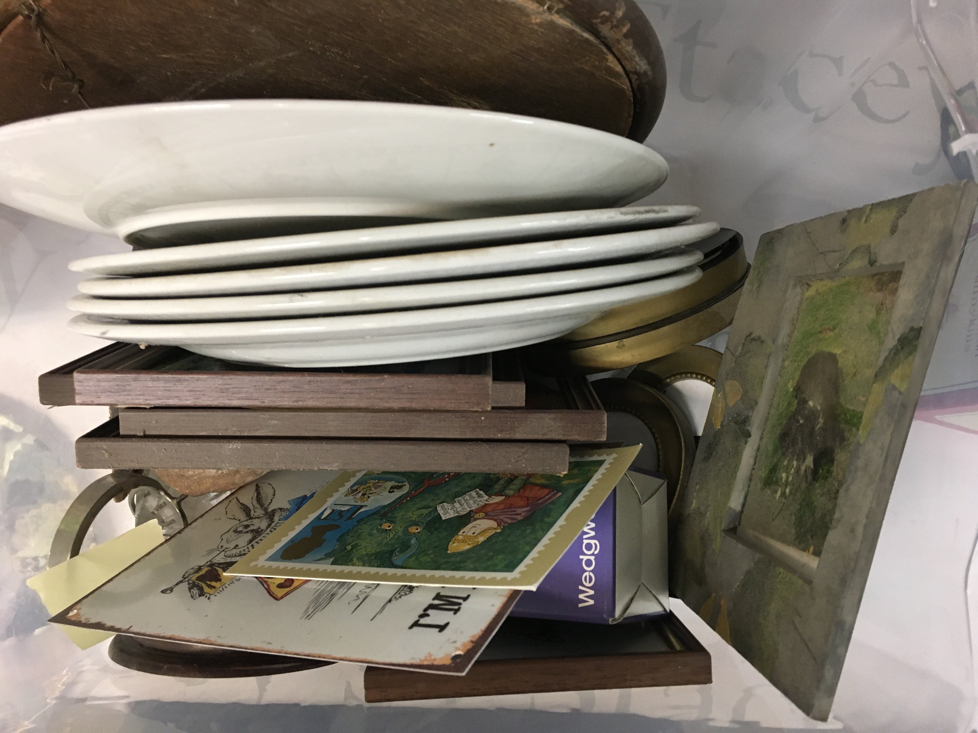 A large collection of items including mostly Royal Doulton items, like plates and Royal Doulton bunnykins. However, there are also items like an antique mirror, a zodiac wall ornament, smal, pictures and frames, a large antique jug and more.
