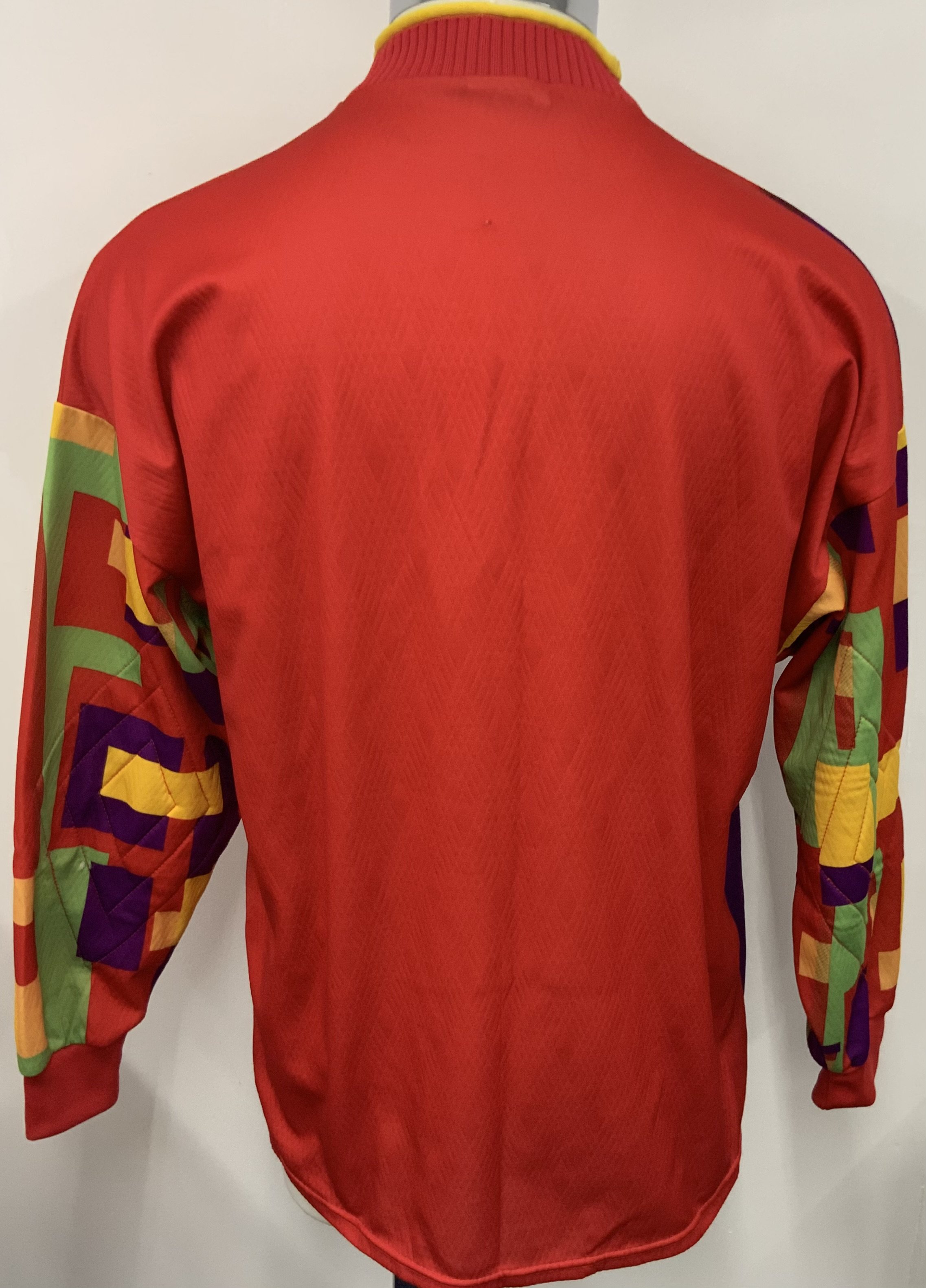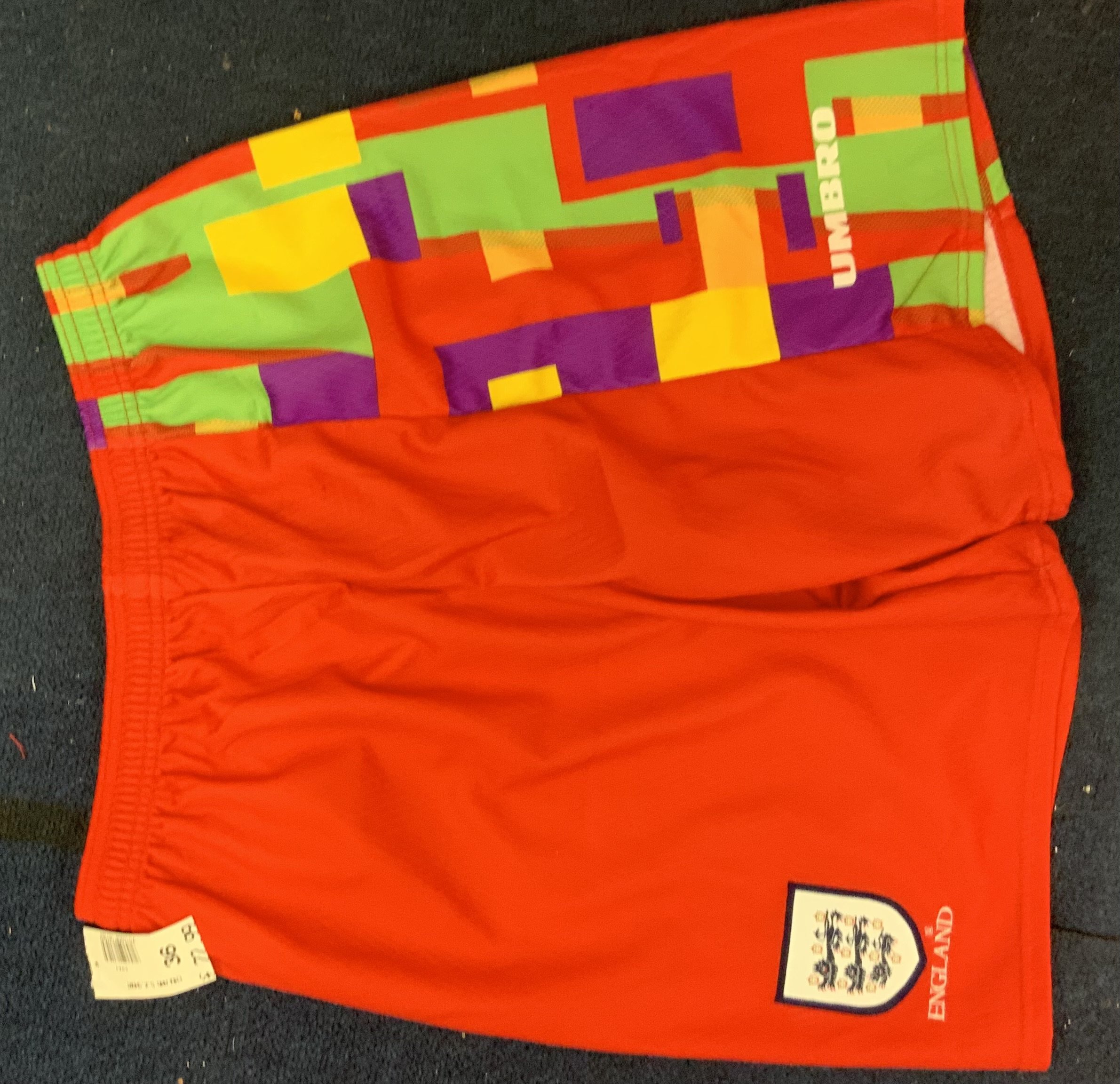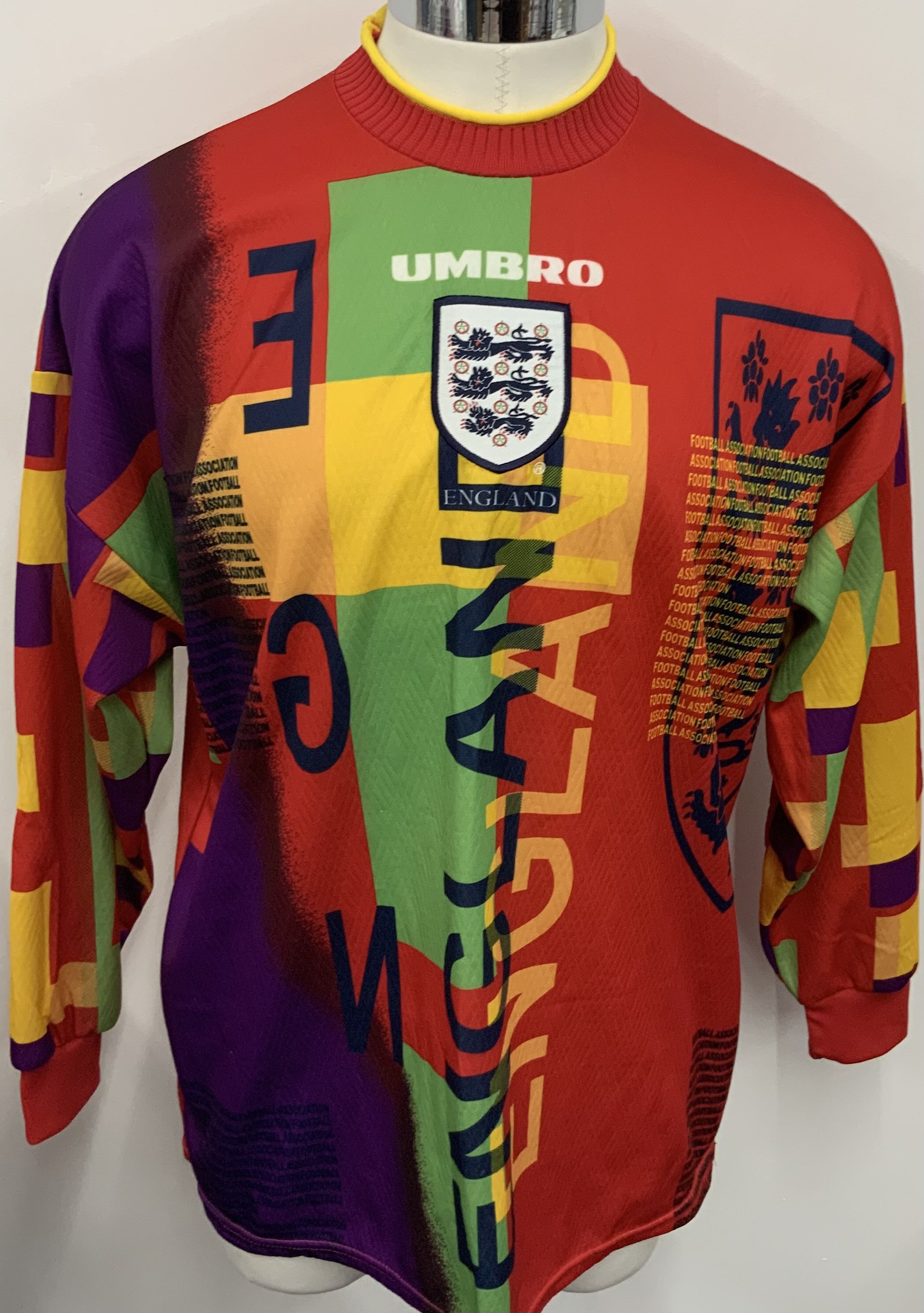 England 1996 Original Replica Goalkeepers Football Kit: Shirt is very good with a few small pulls, shorts size 38 are unused with tag still attached and socks look unworn. Multi Coloured kit is still very bright and original from the mid 90s.