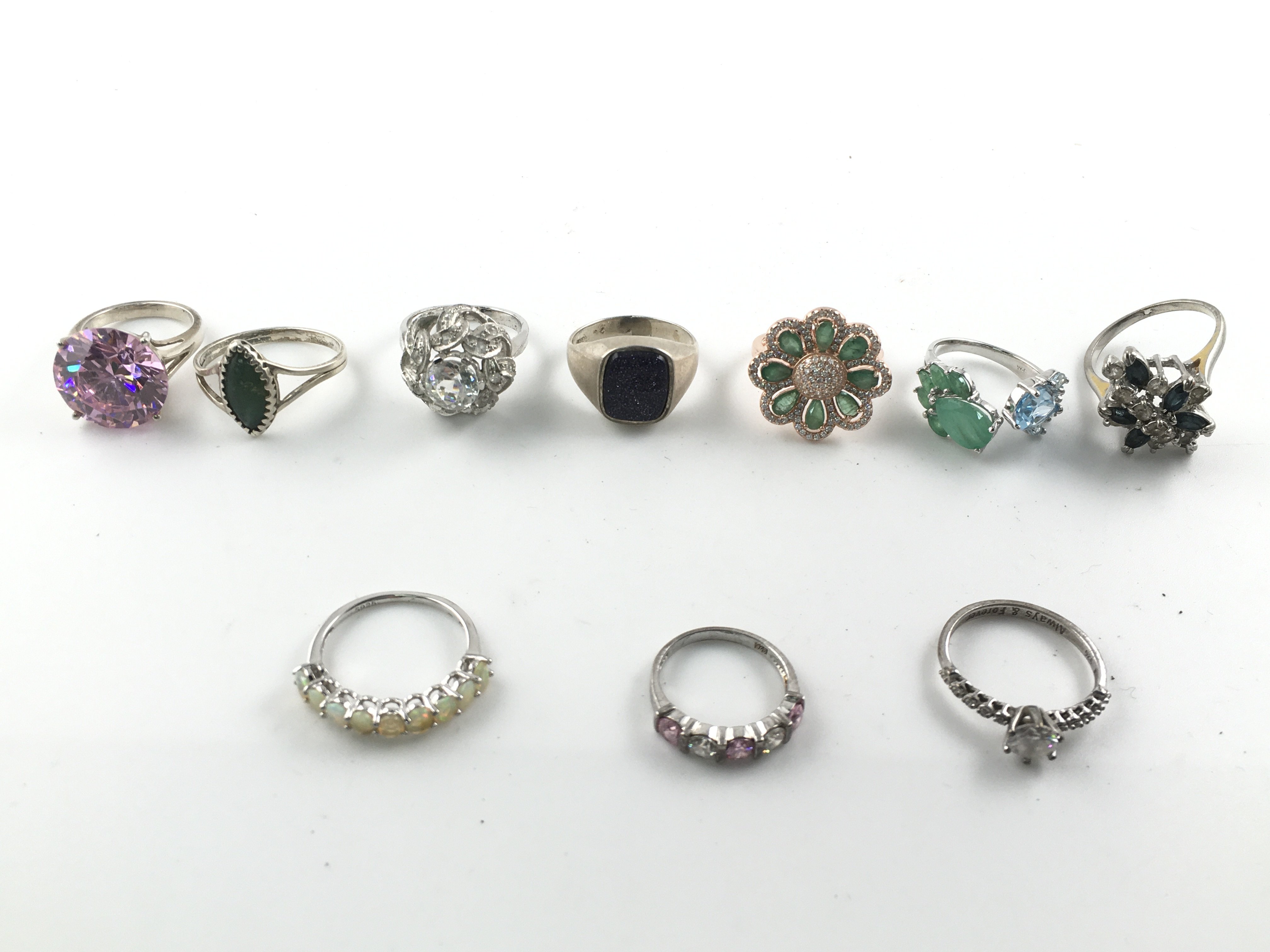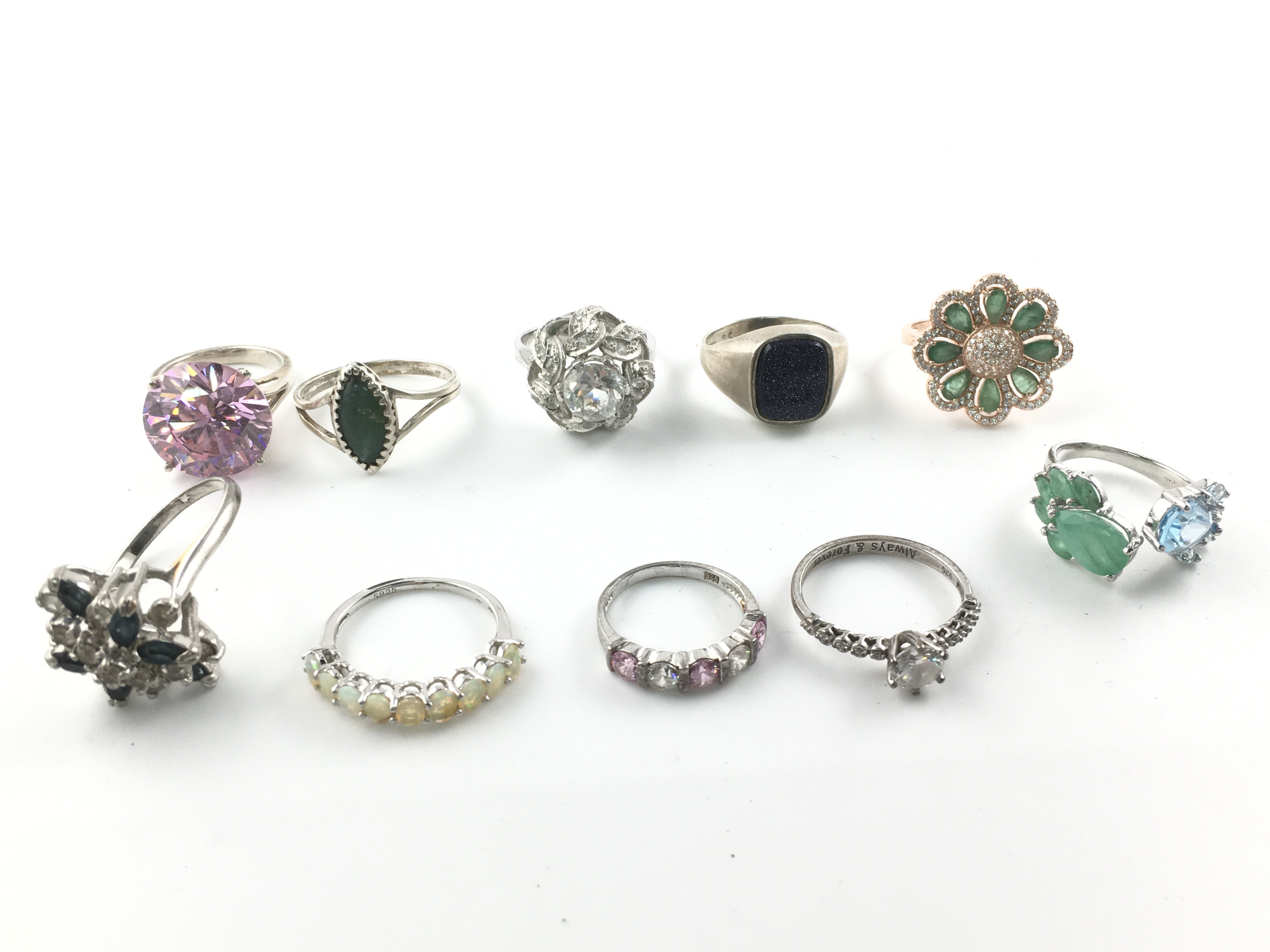 A collection of 10 silver rings set with assorted stones including opal. Postage B