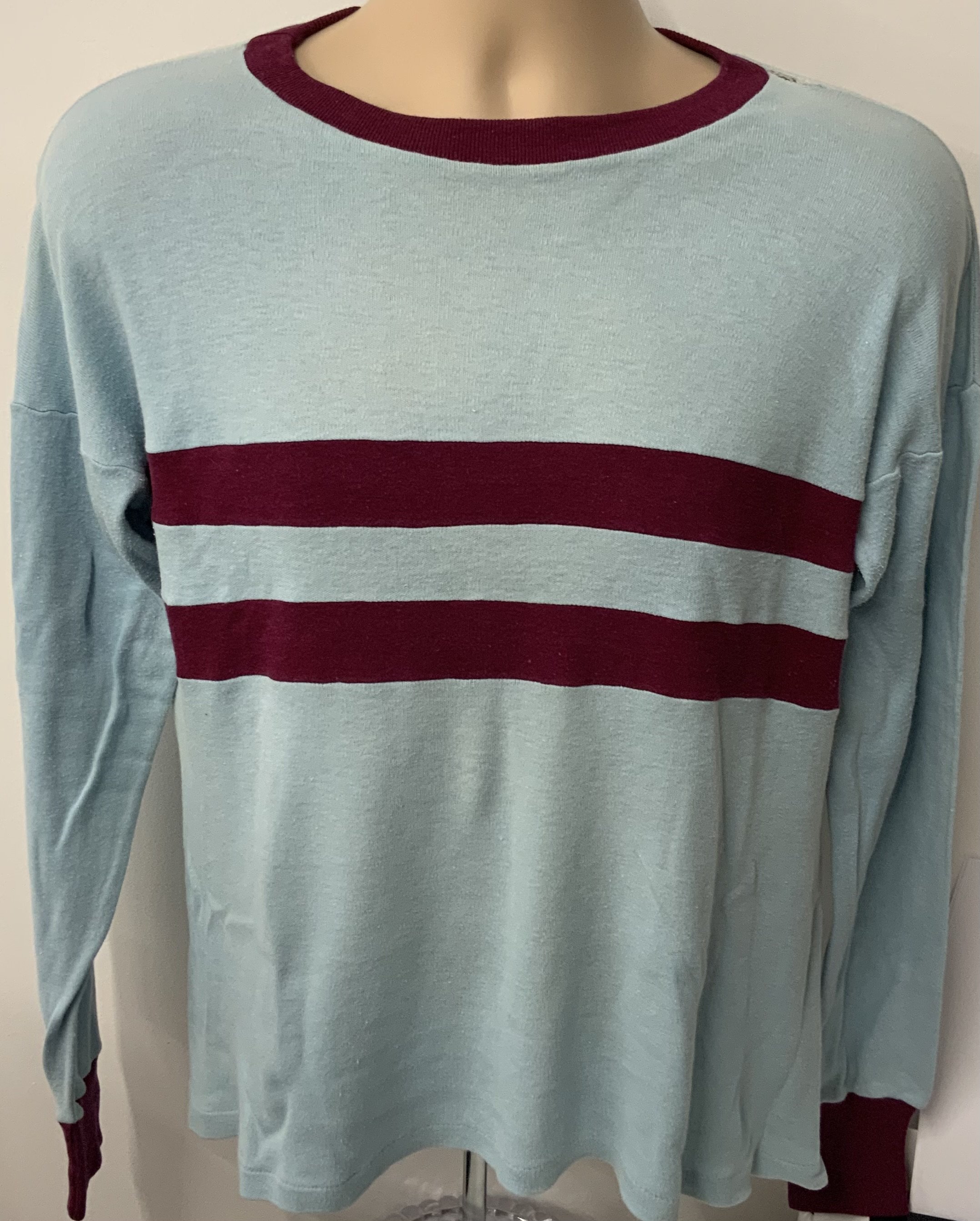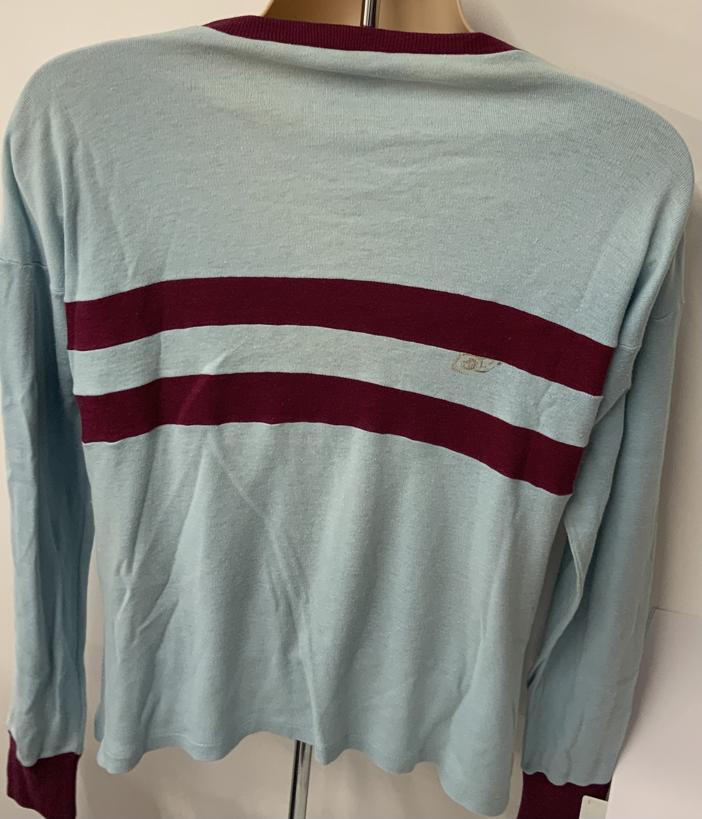West Ham Original 1960s Football Shirt: Light blue with claret hoops. Tear near neck and marks near the shoulder. Original gold Bukta label washed out and small mark to rear. Genuine replica shirt nearly 60s years old.