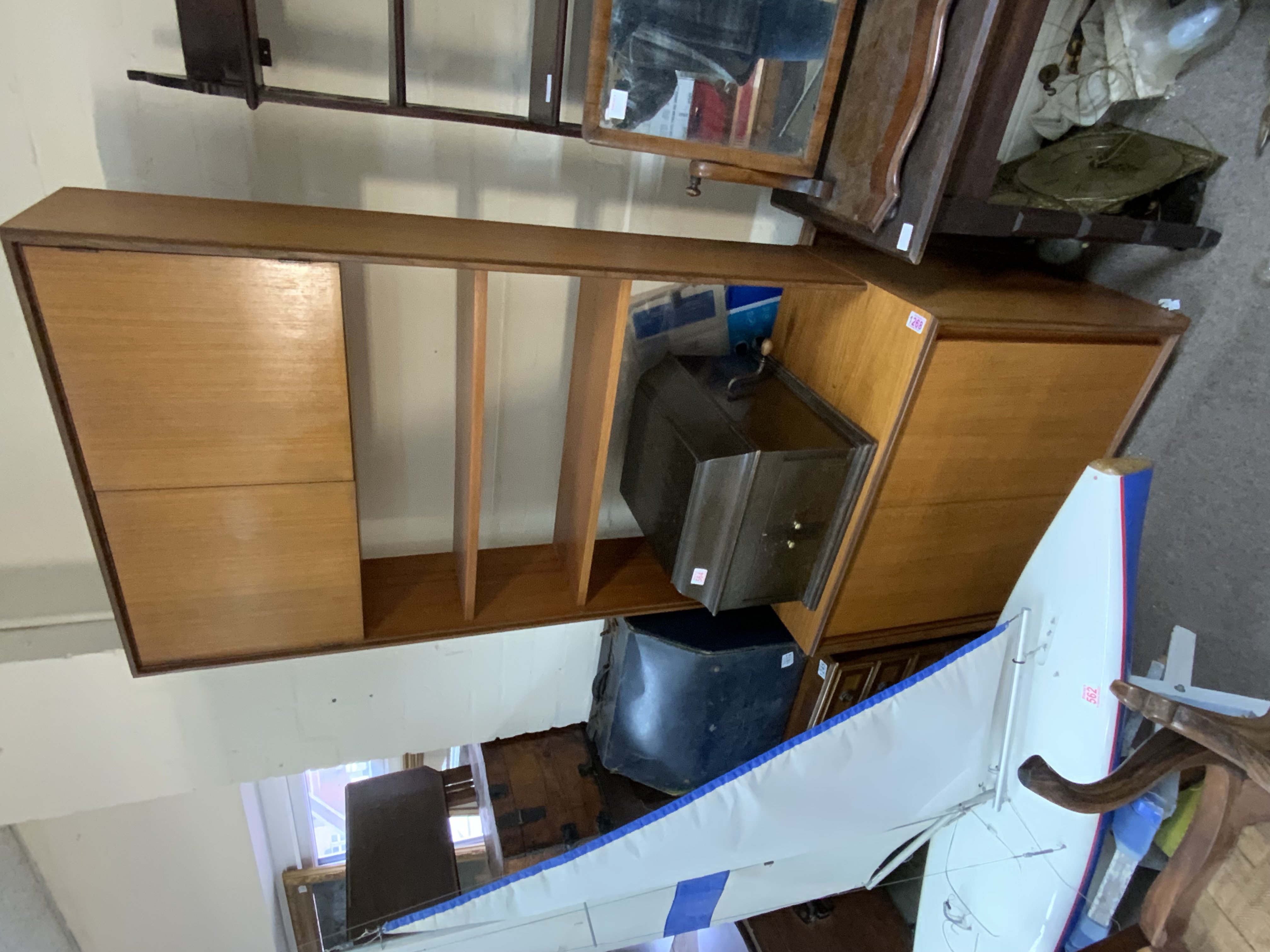 a modern G-PLan style open bookshelf with upper and lower cupboard sections. (D)