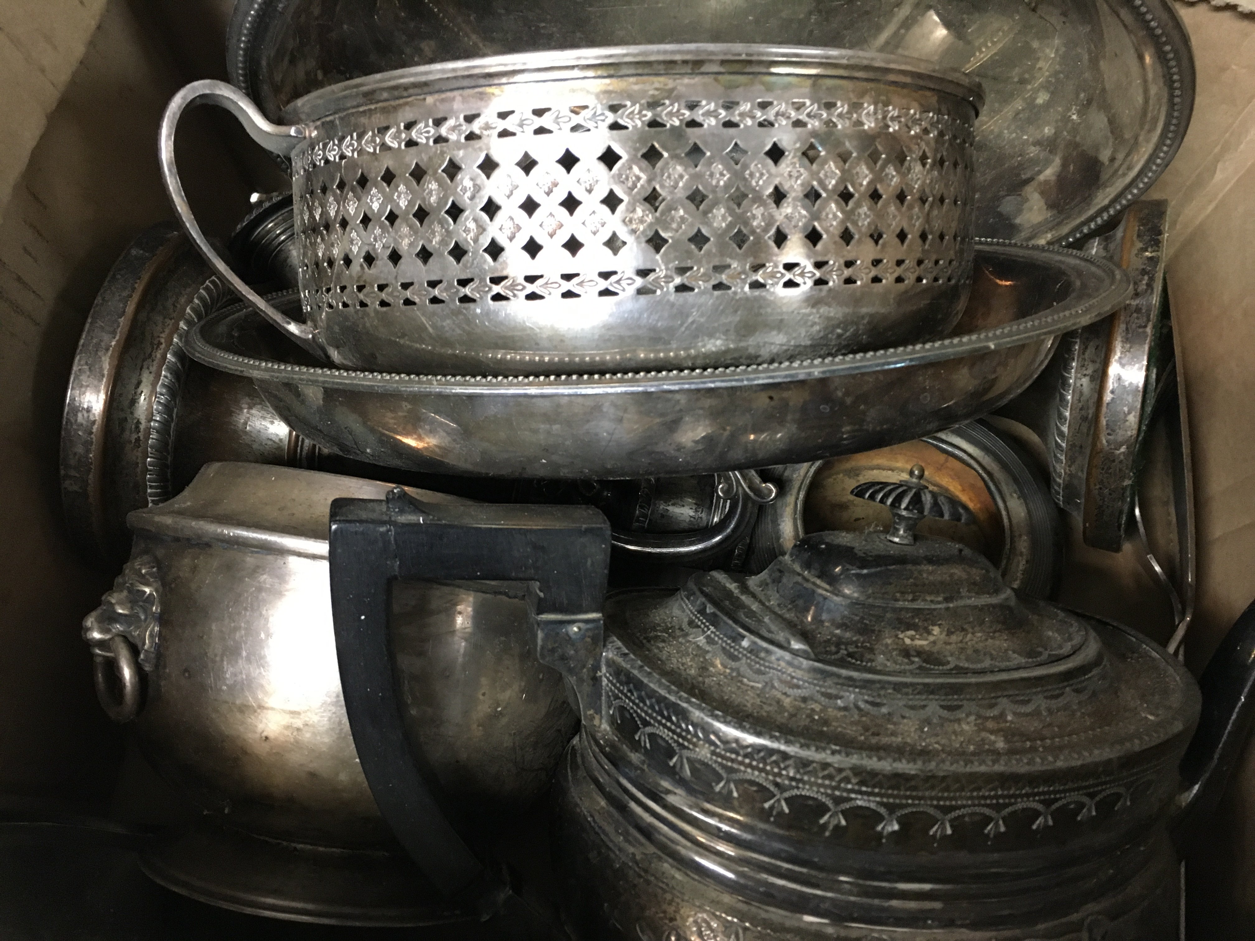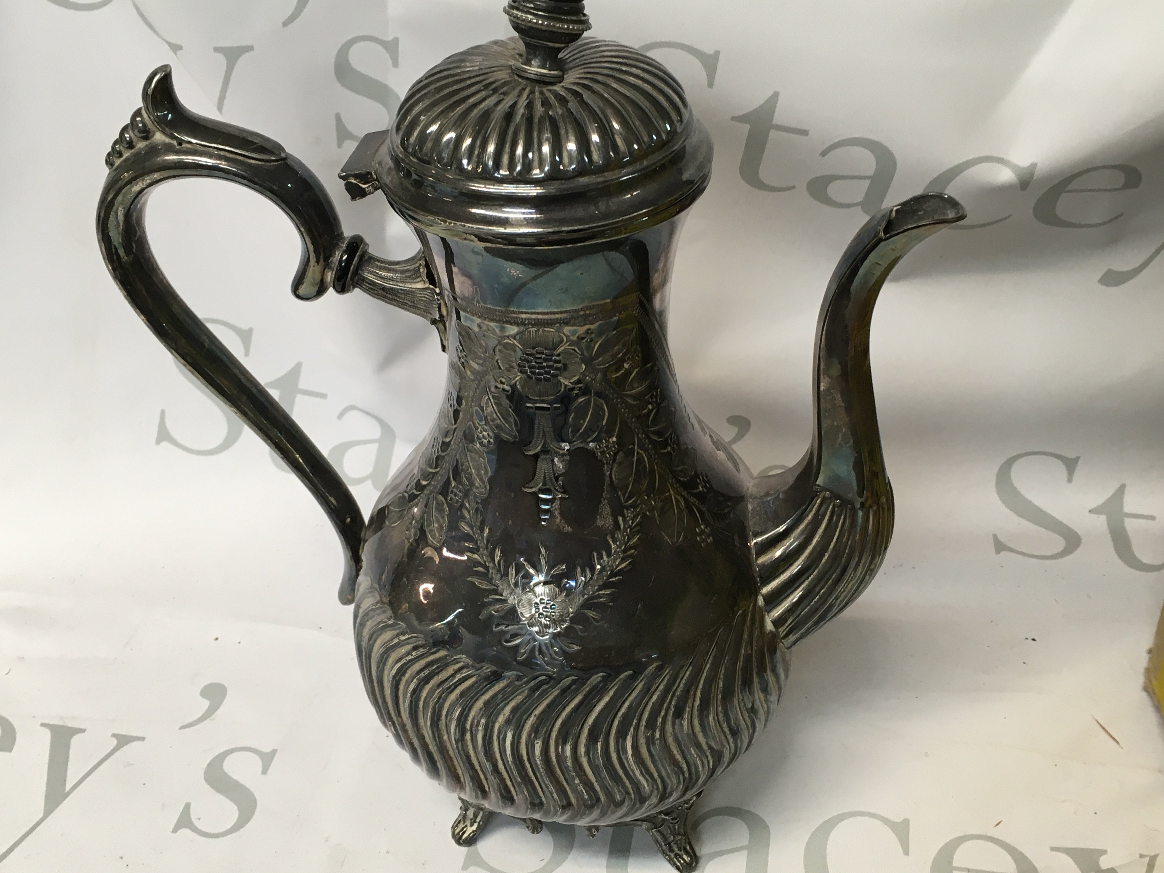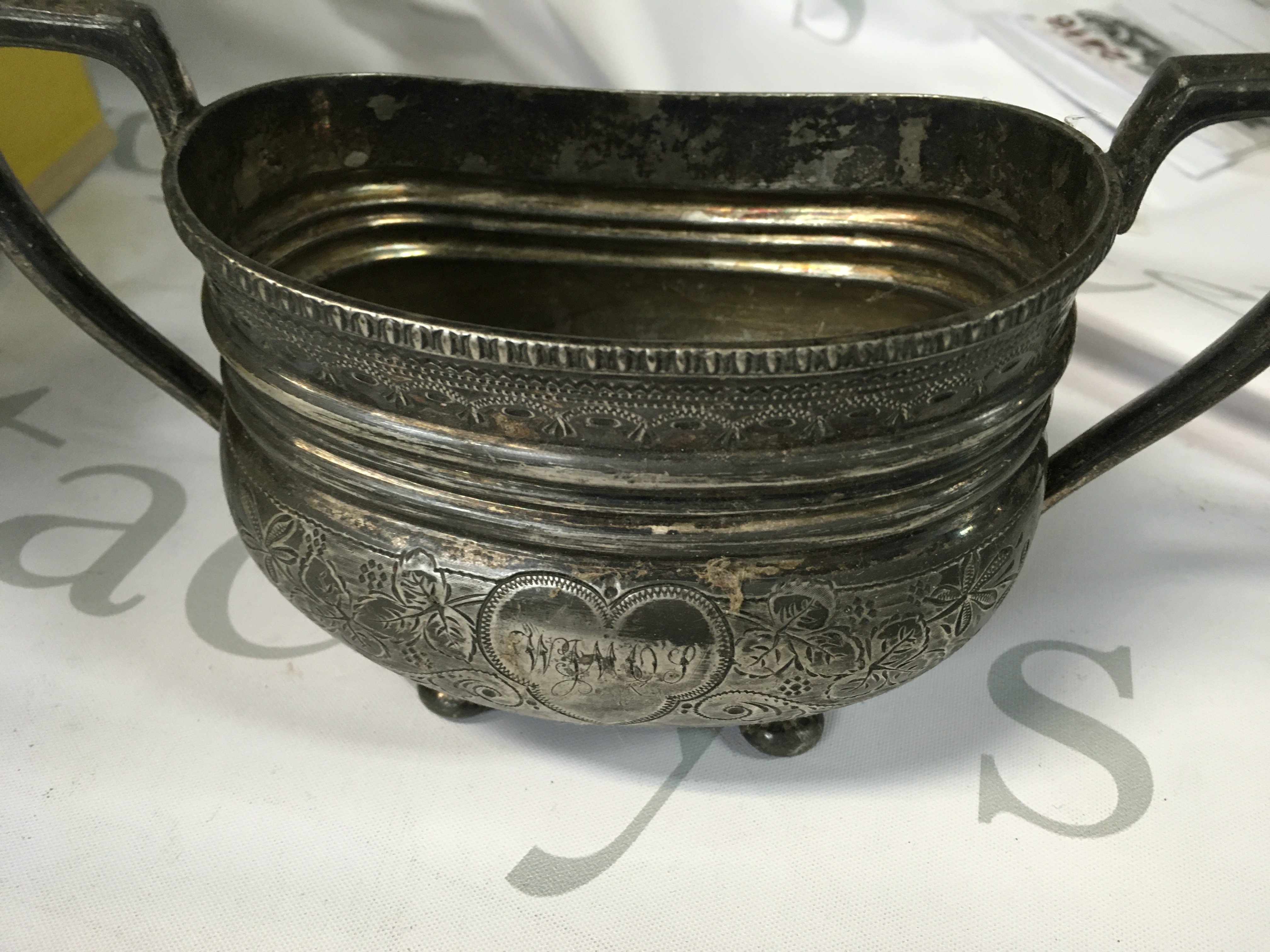 A collection of silver plate including dishes, candlestick and and antique Victorian pot.