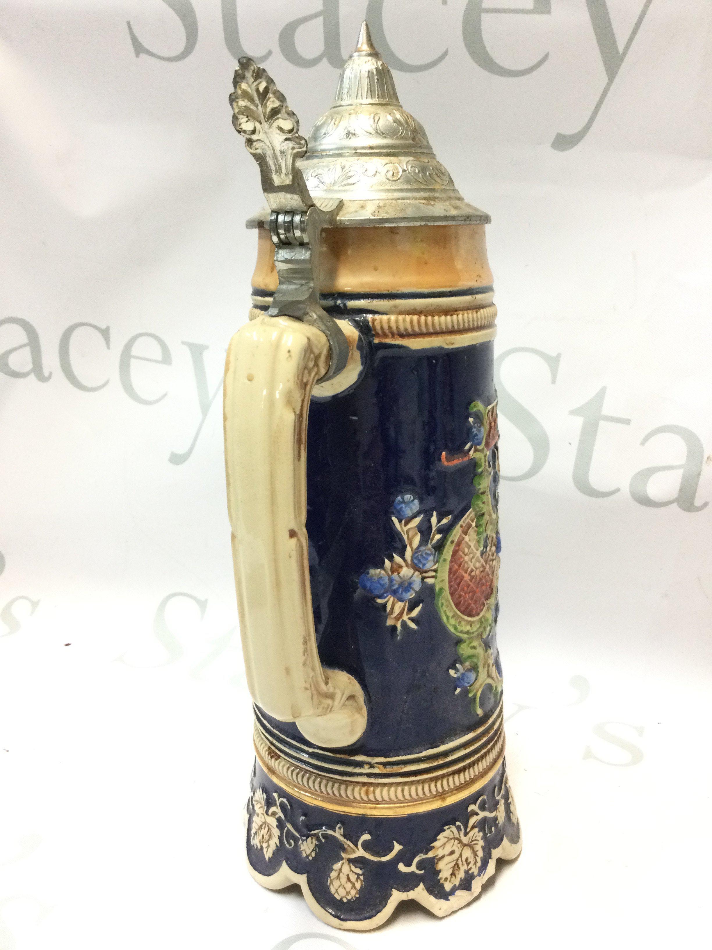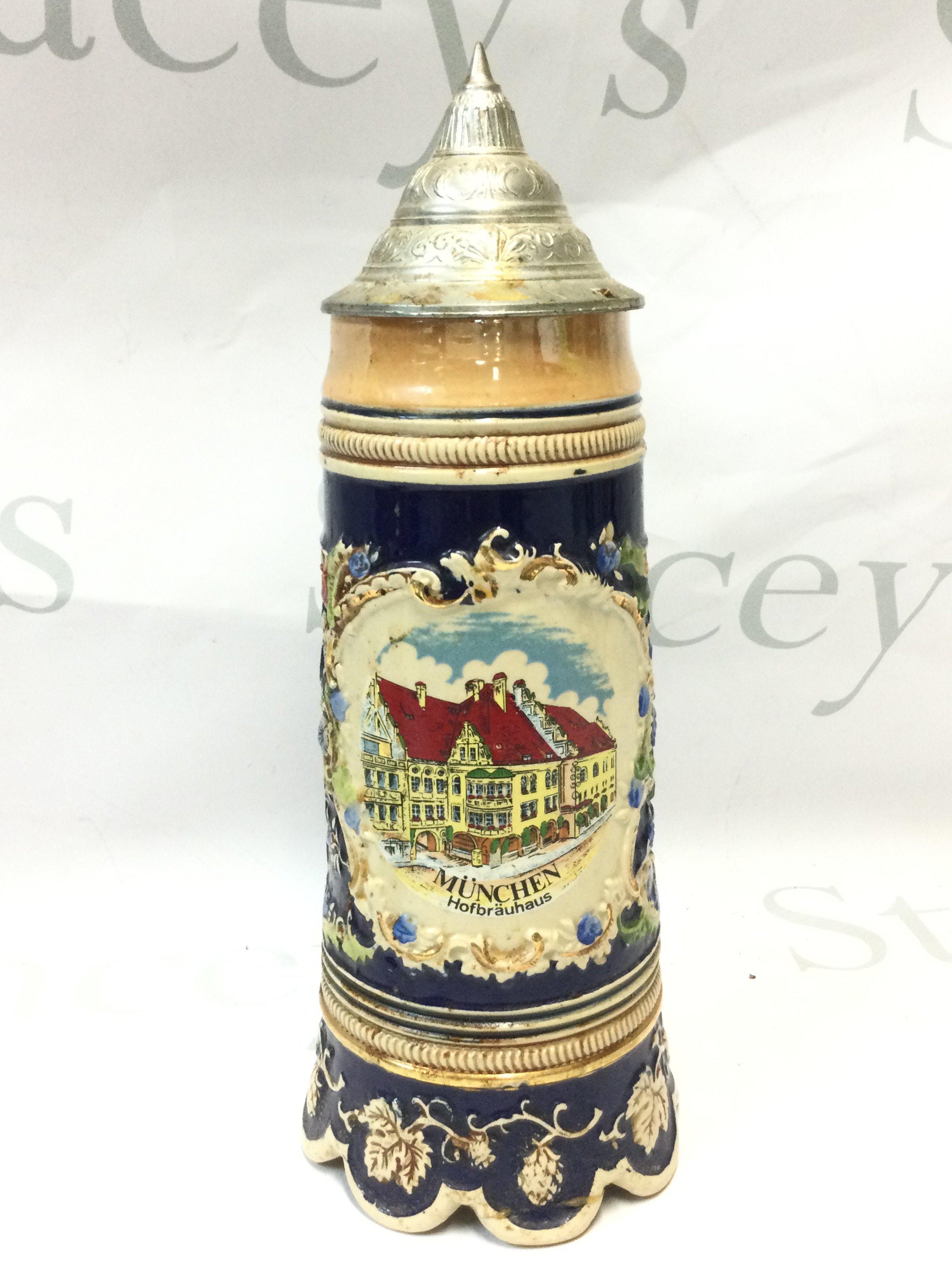 A German musical Porcelain tankard with painted design of famous Beer Hall, Muchnen Hofbrauhaus. 29cm tall