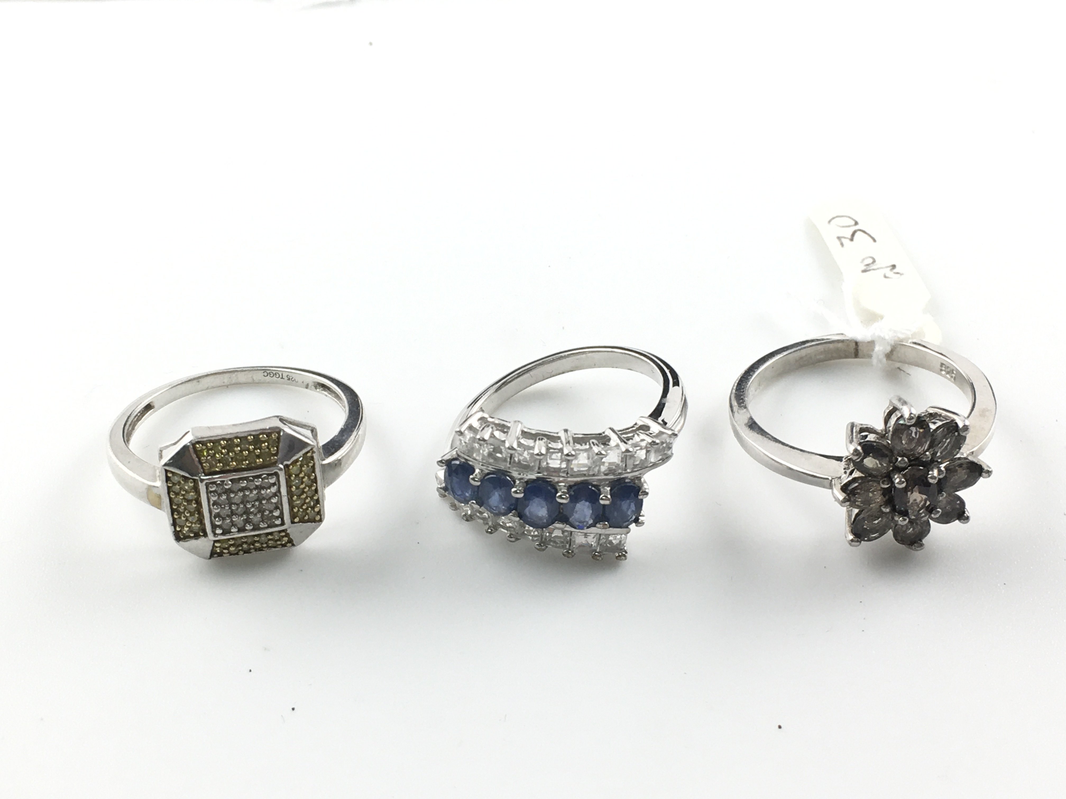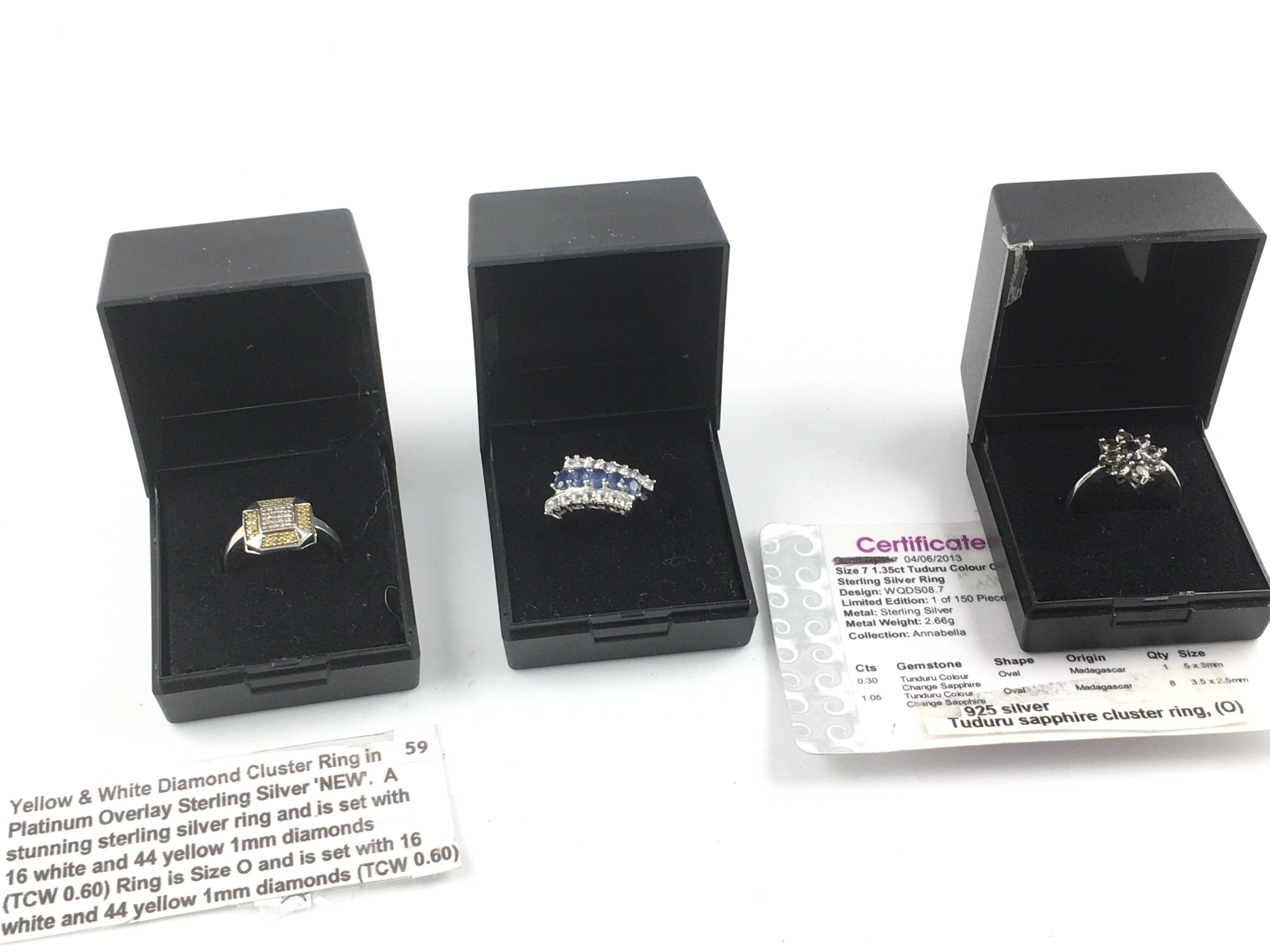 WITHDRAWN - Three silver rings including a lovely silver with platinum overlay yellow and white diamond cluster ring. Postage B