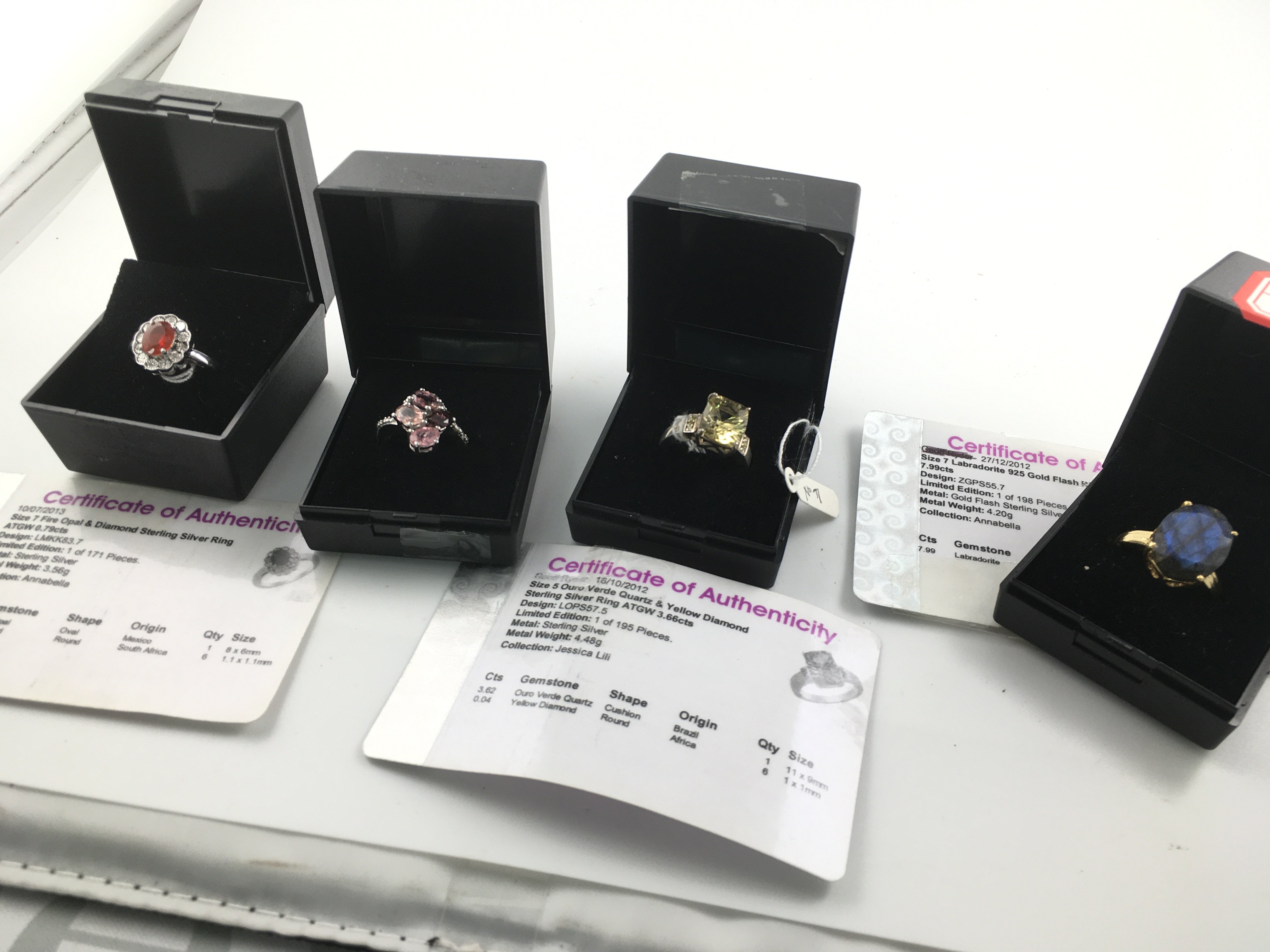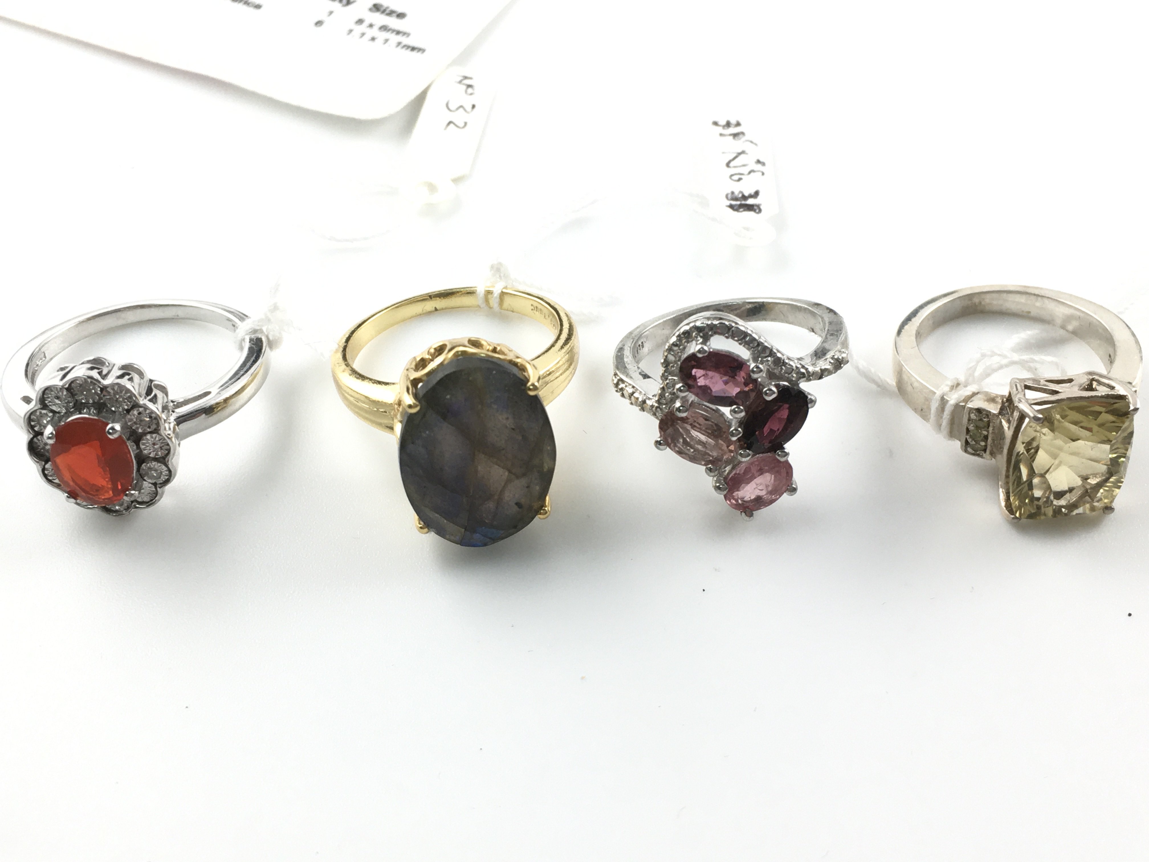 Four silver rings set with assorted gems including fire opal and yellow diamonds. Postage B