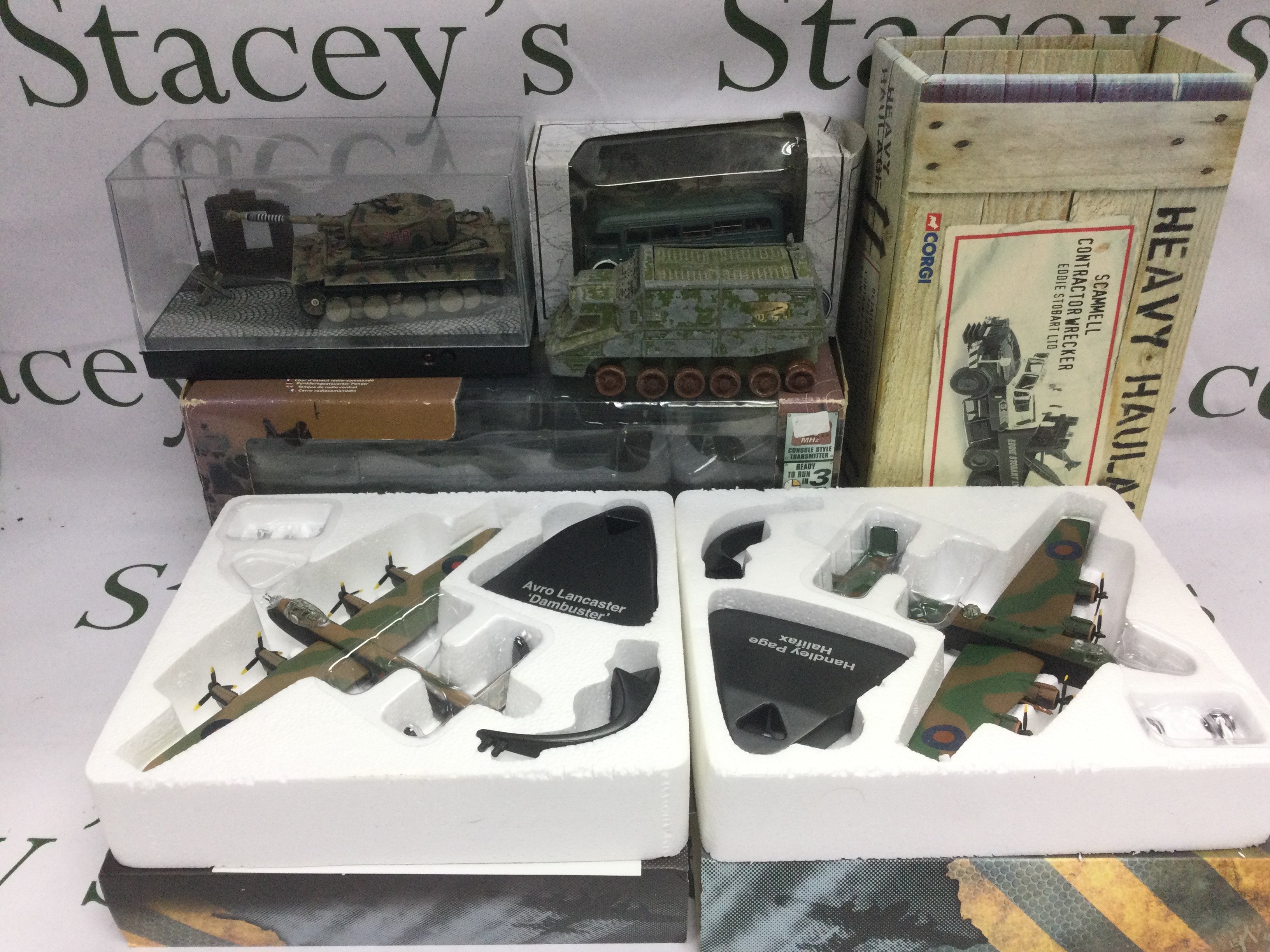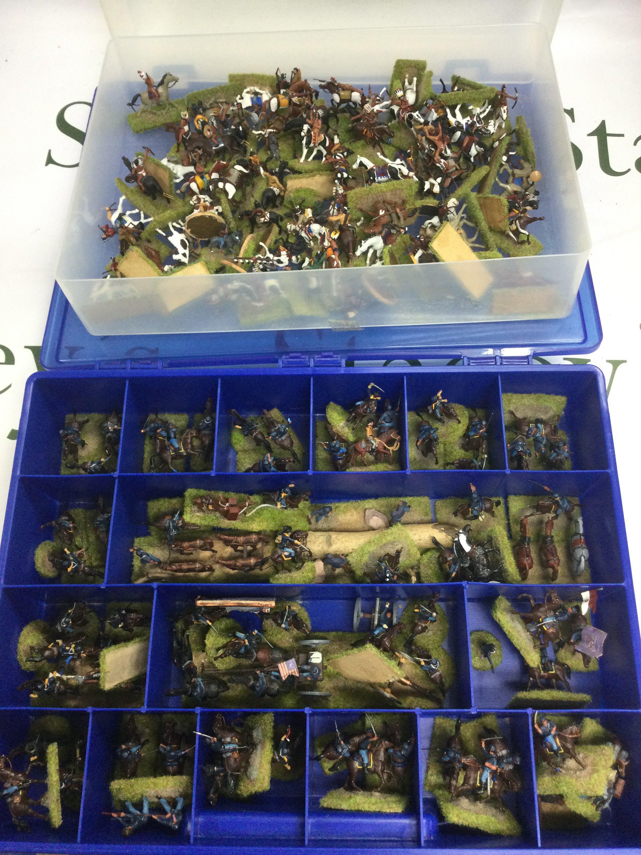 A collection of die cast military vehicles and two trays of American civil war miniature figures.