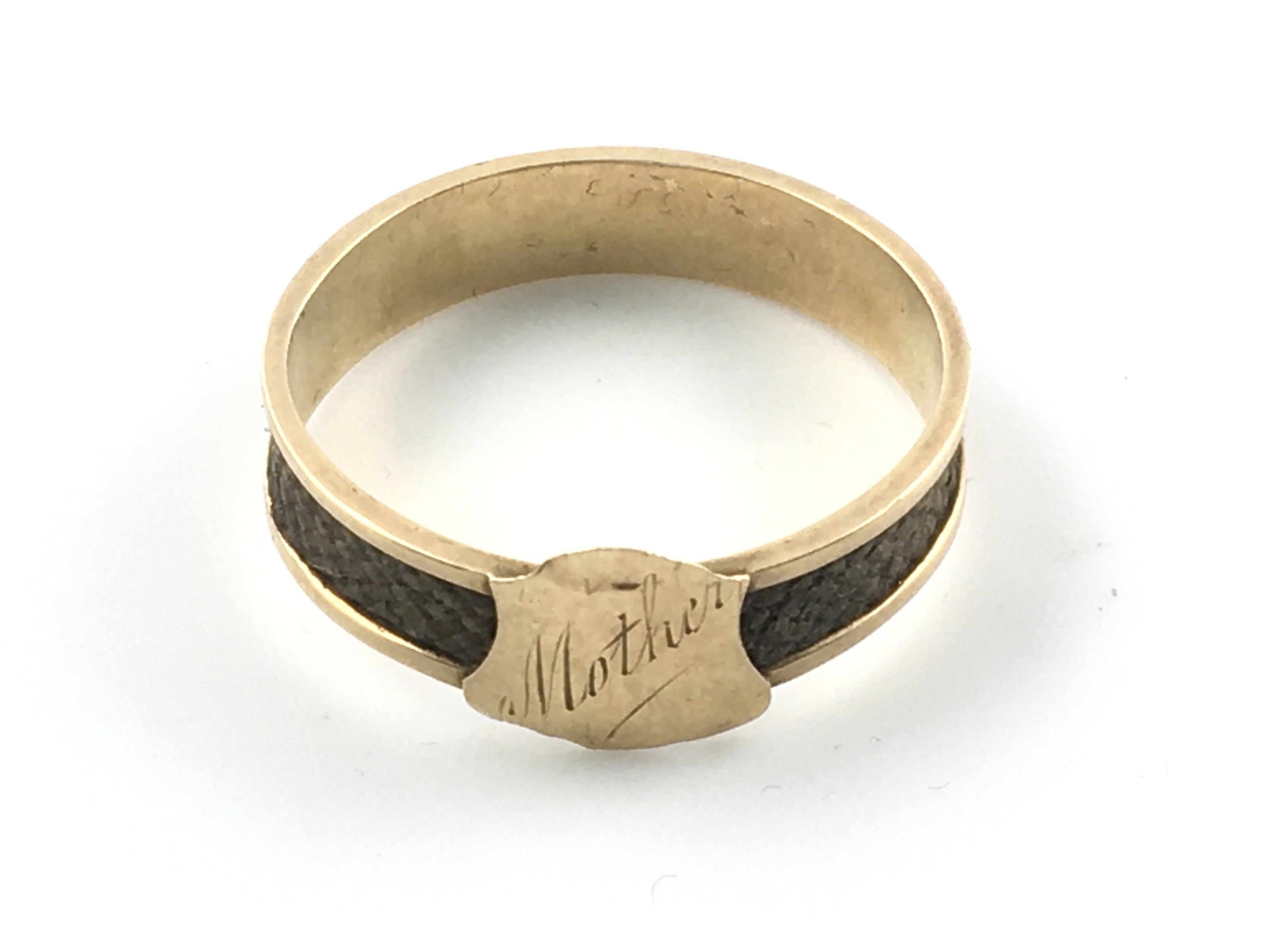 A 15ct gold Victorian memorial ring with plated hair. Size S and 2.21g.