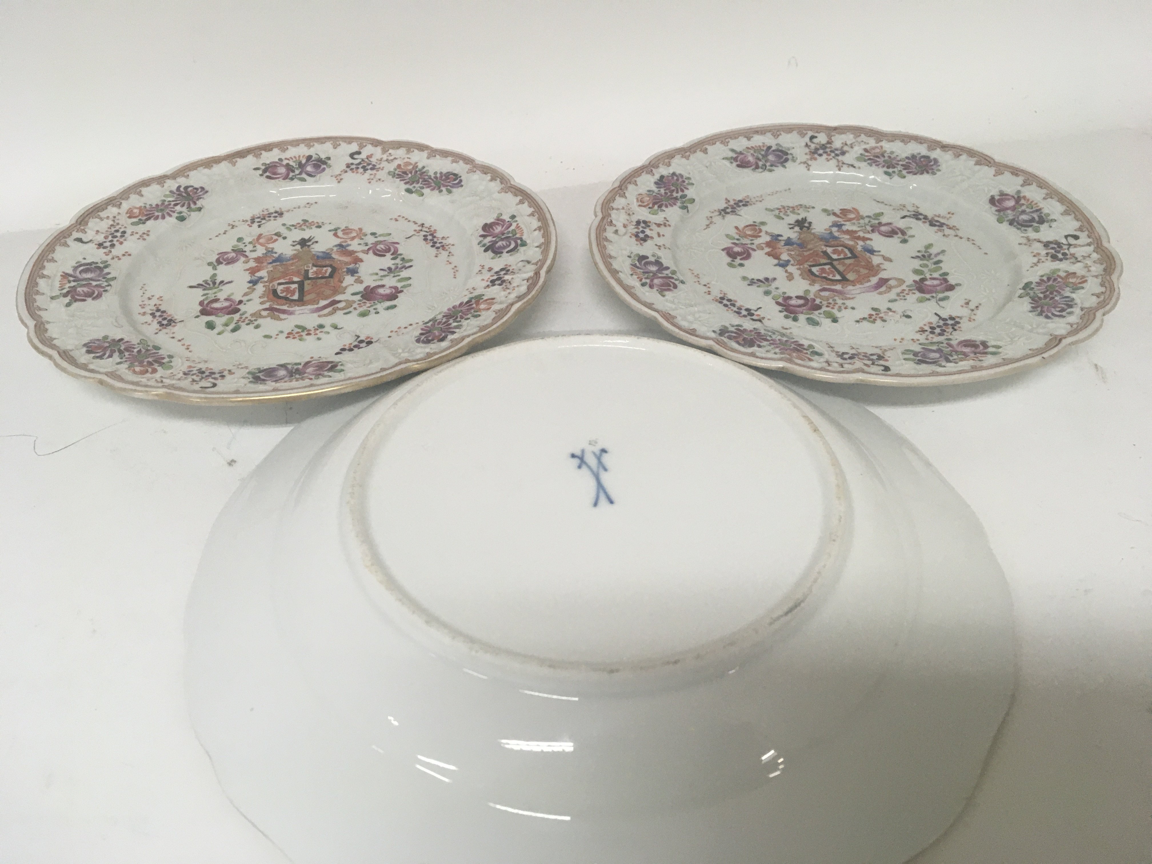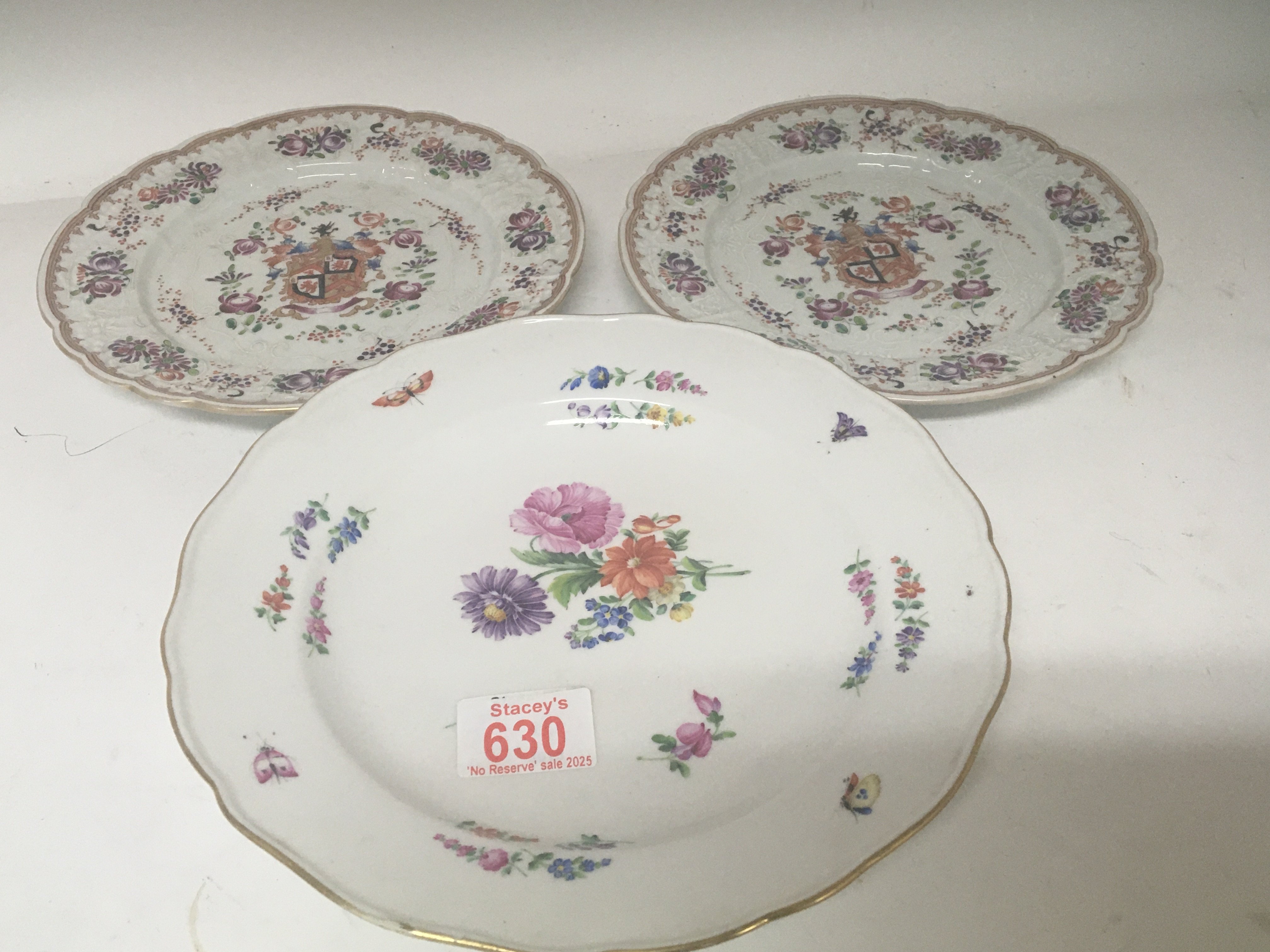A Meissen porcelain plate hand painted with sprays of flowers and a pair of Sampson Armorial plates (3)