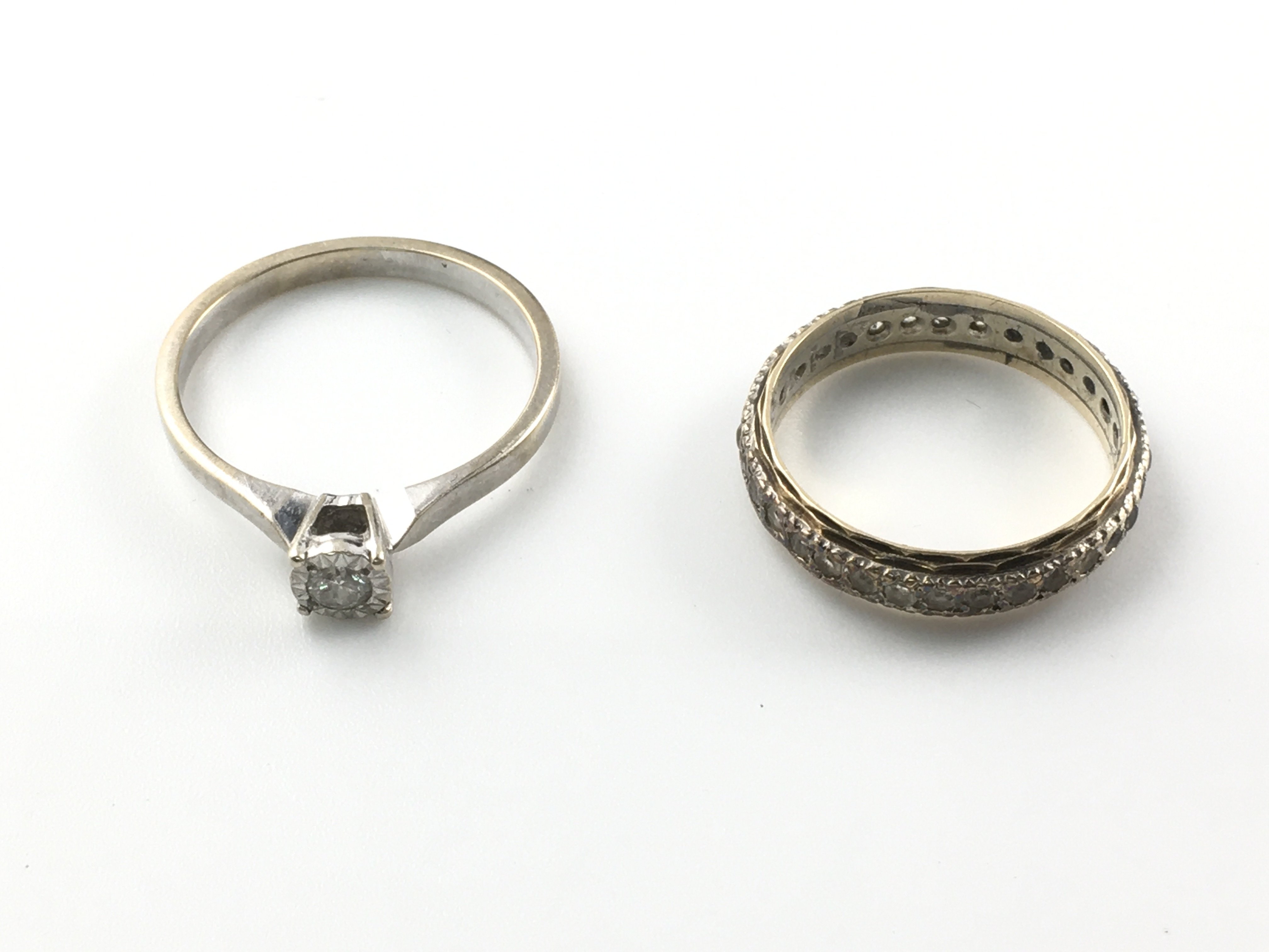 9ct white gold ring set with 0.10ct diamond Size N and a 9ct white and yellow gold eternity ring size L 4g total
