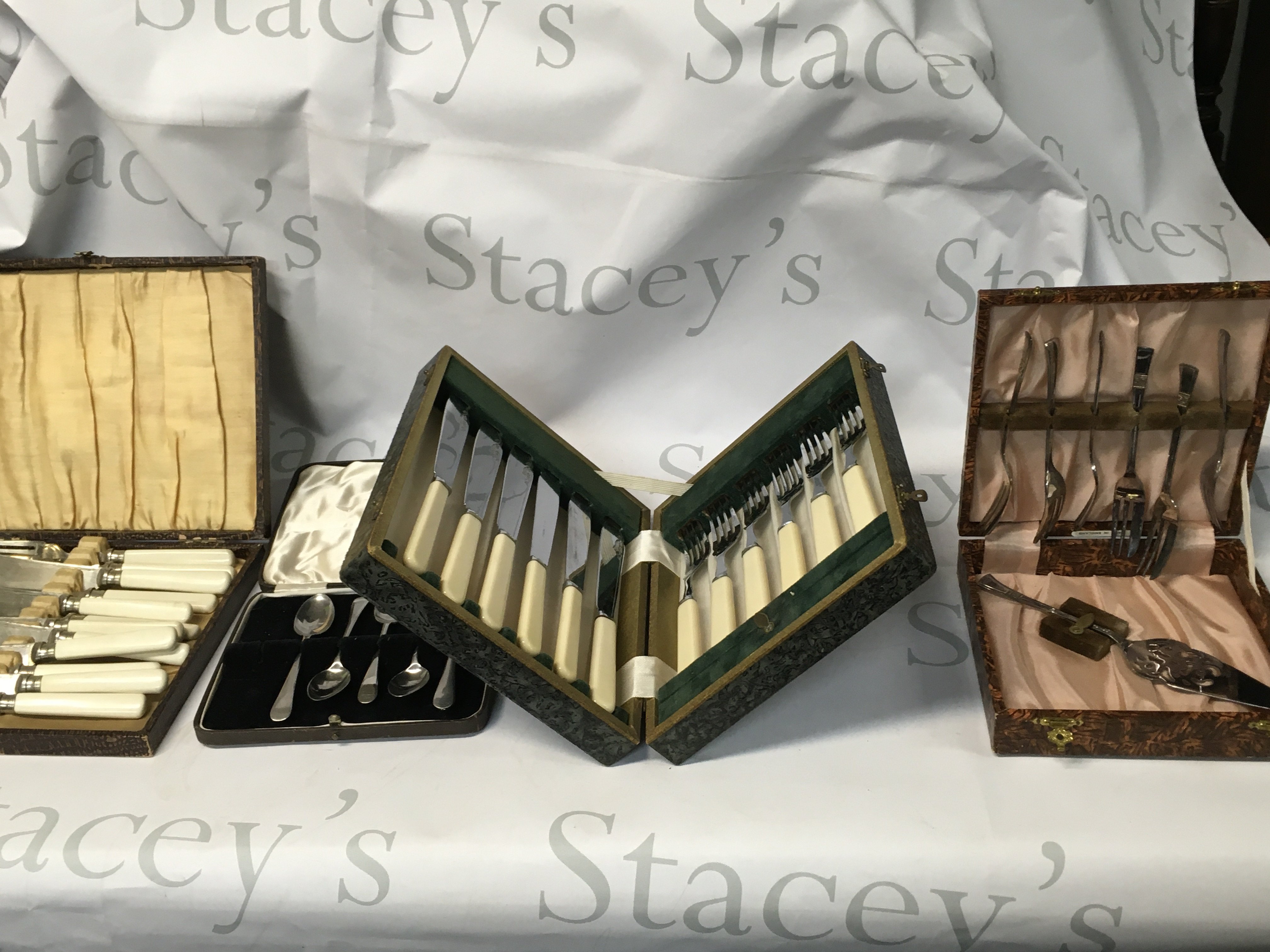 A collection of 4 small antique cutlery sets, including knives, forks, spoons and a large knife.