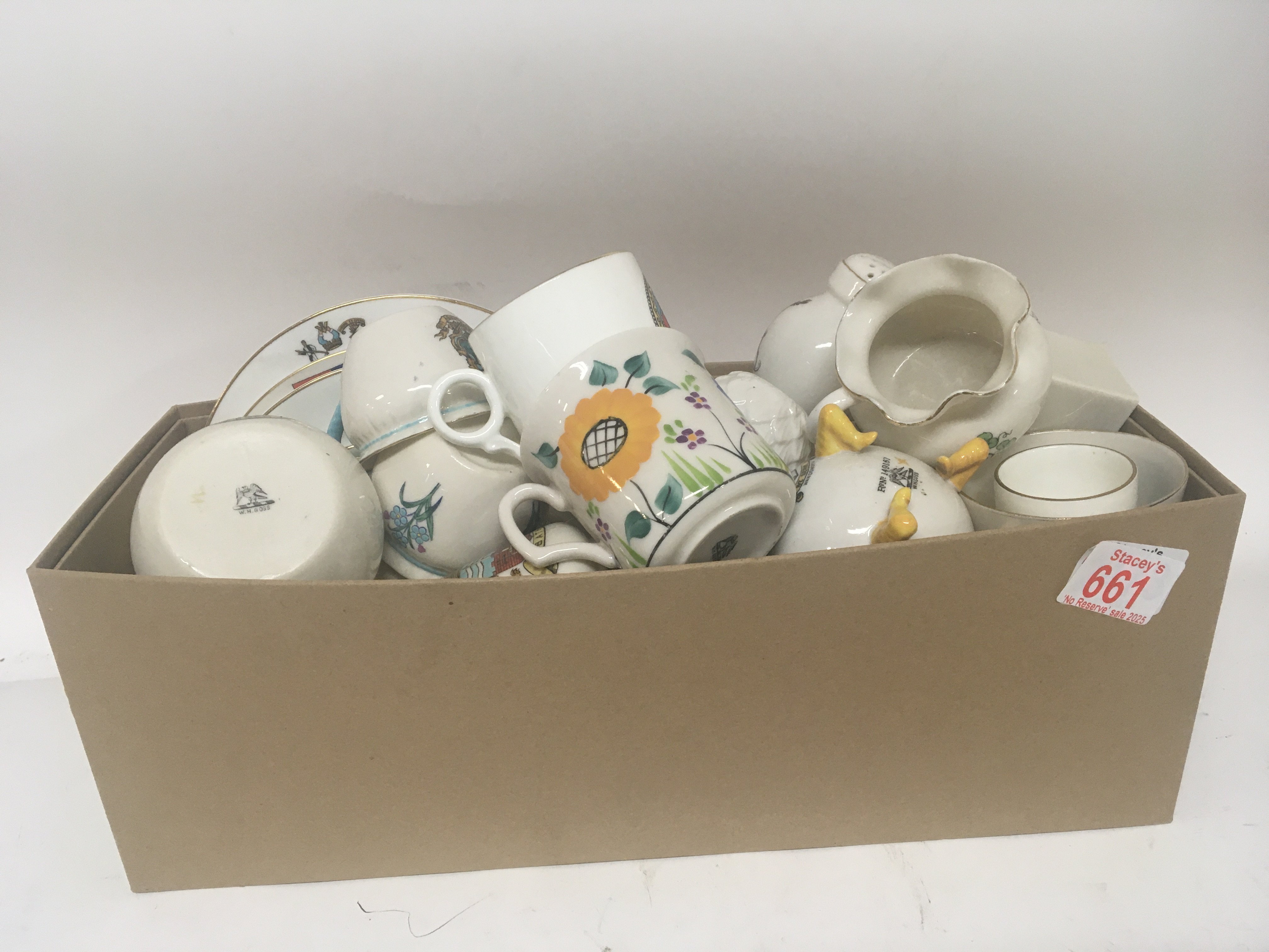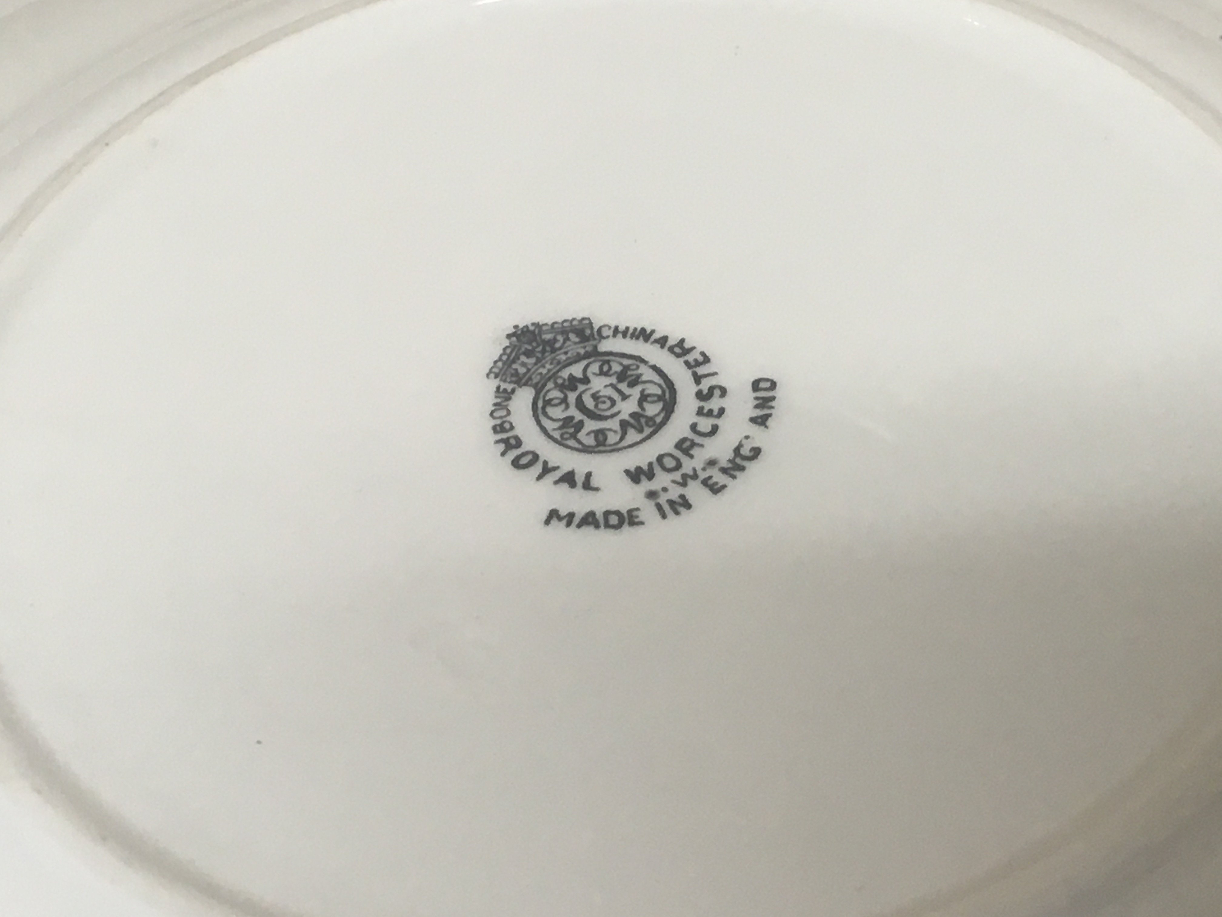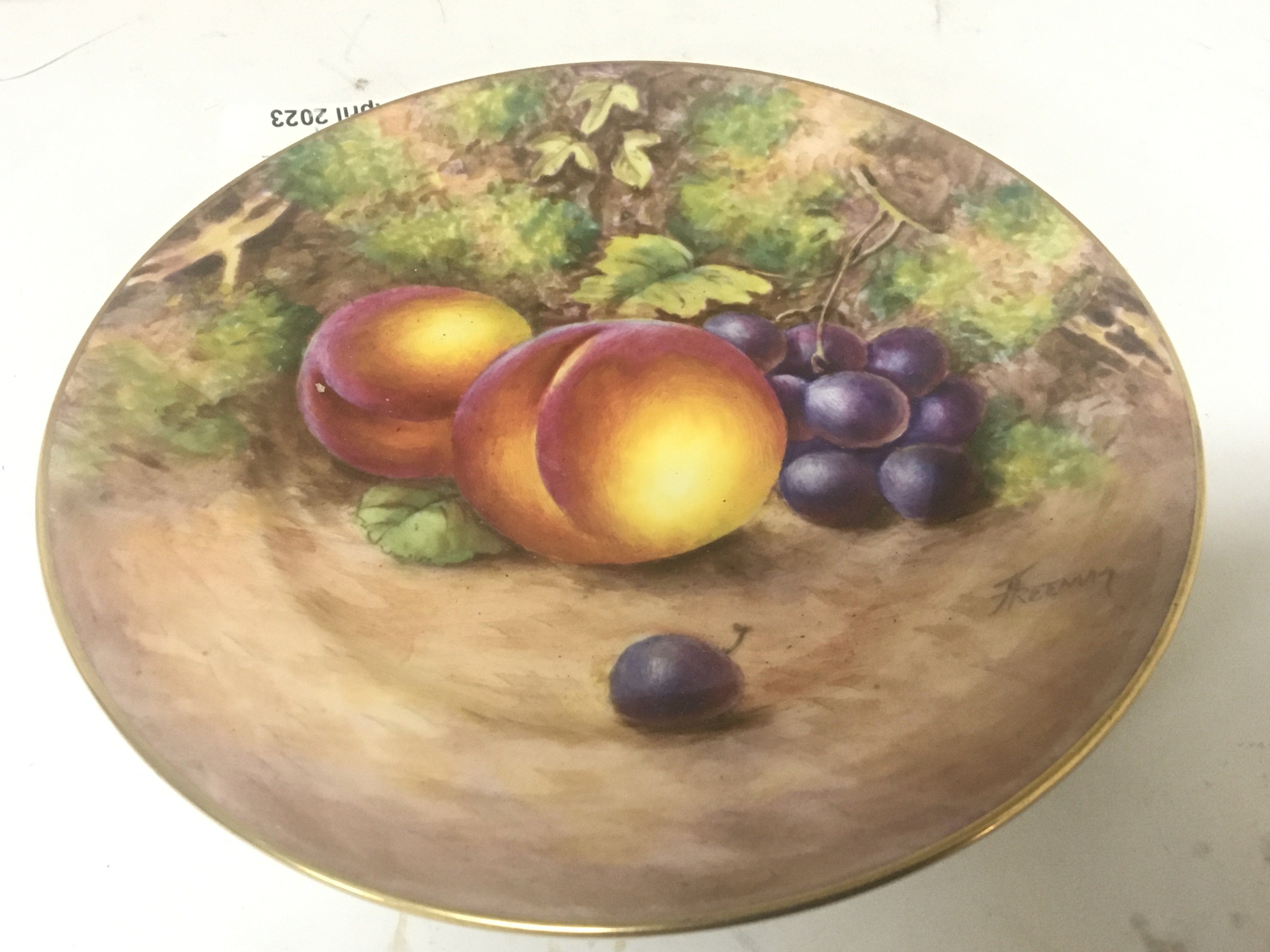 A Royal Worcester hand painted porcelain plate study of fruit and foliage signed Freeman and a box containing WH Goss china. (2)