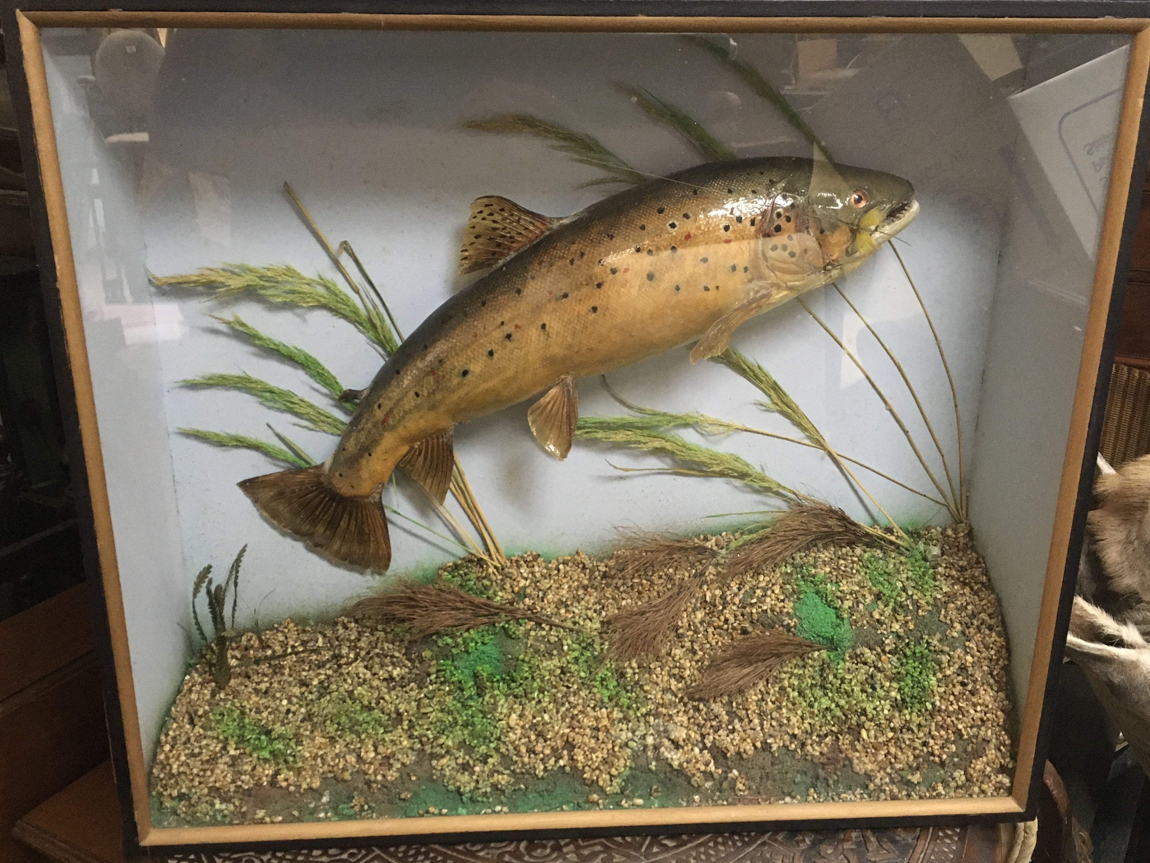 A cased taxidermy trout with fly in mouth. Case dimensions 14x56x49cm. This lot cannot be posted