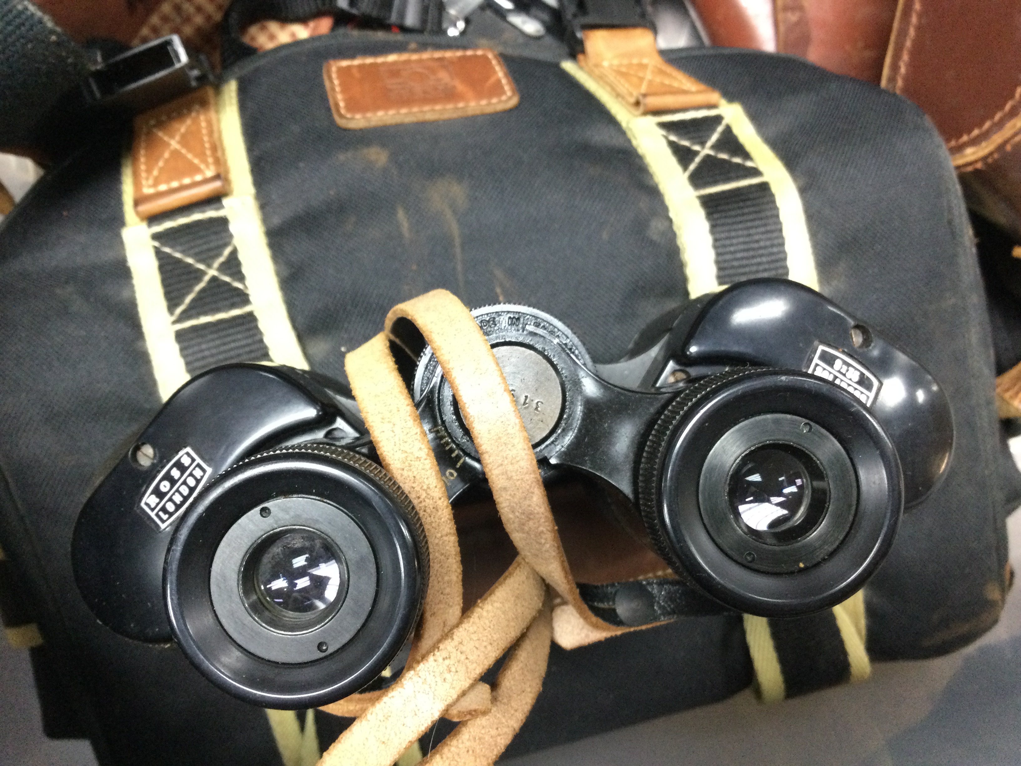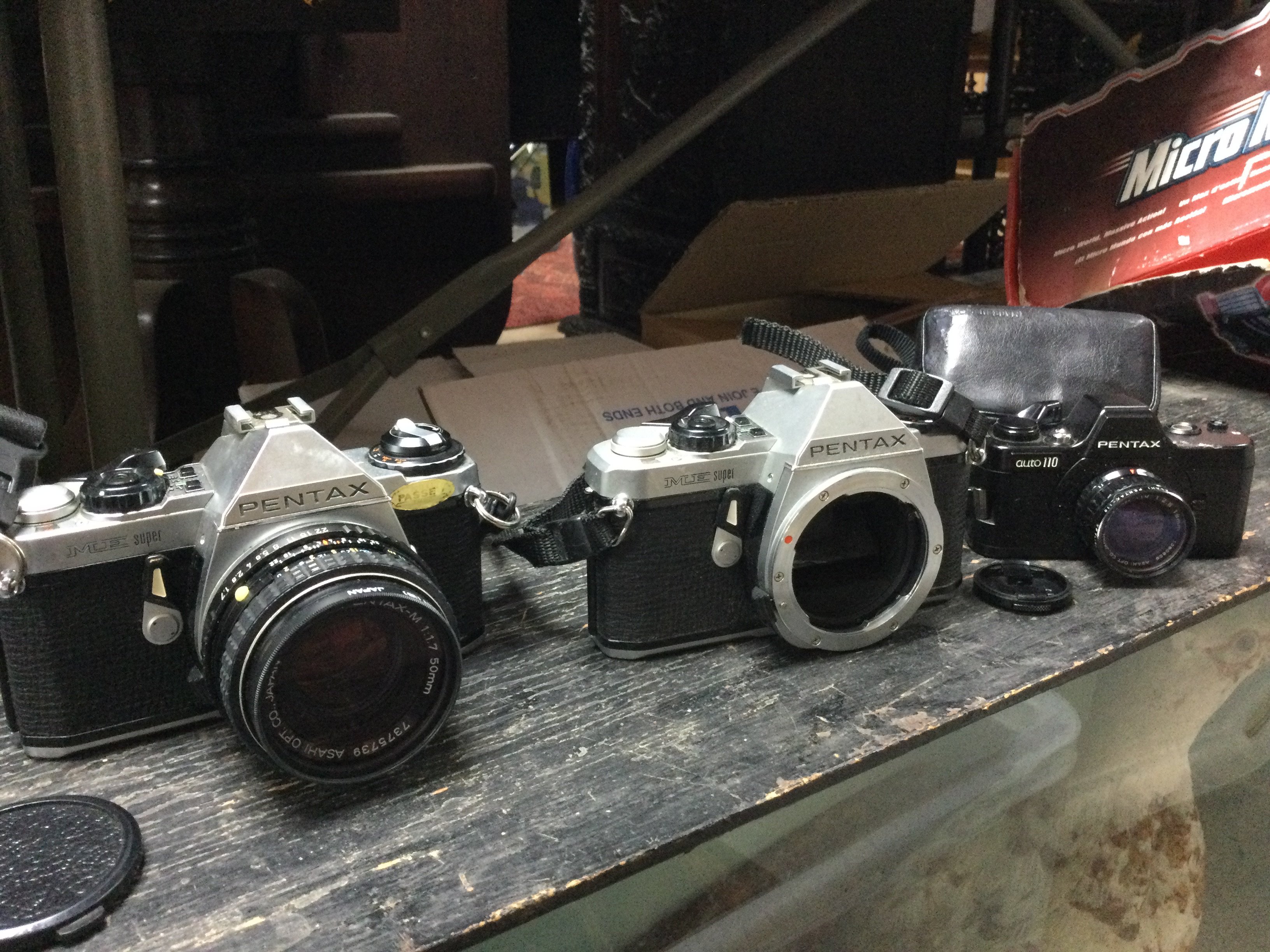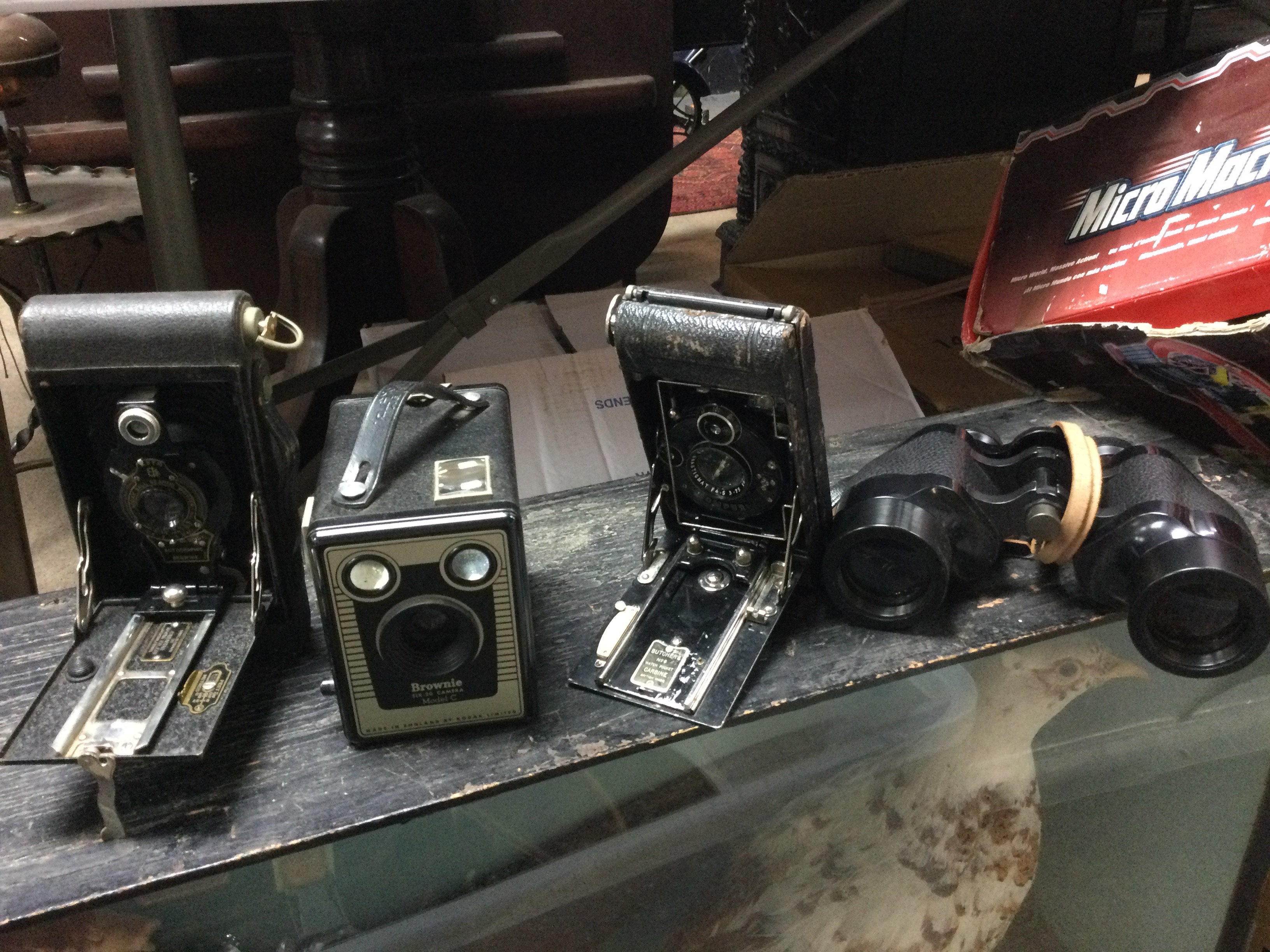 A collection of vintage cameras including Pentax ME Super, Auto 10, box cameras Autographic Brownie, Brownie six 20 model c, Compur, and equipment. Ross London 9x35 solaross binoculars