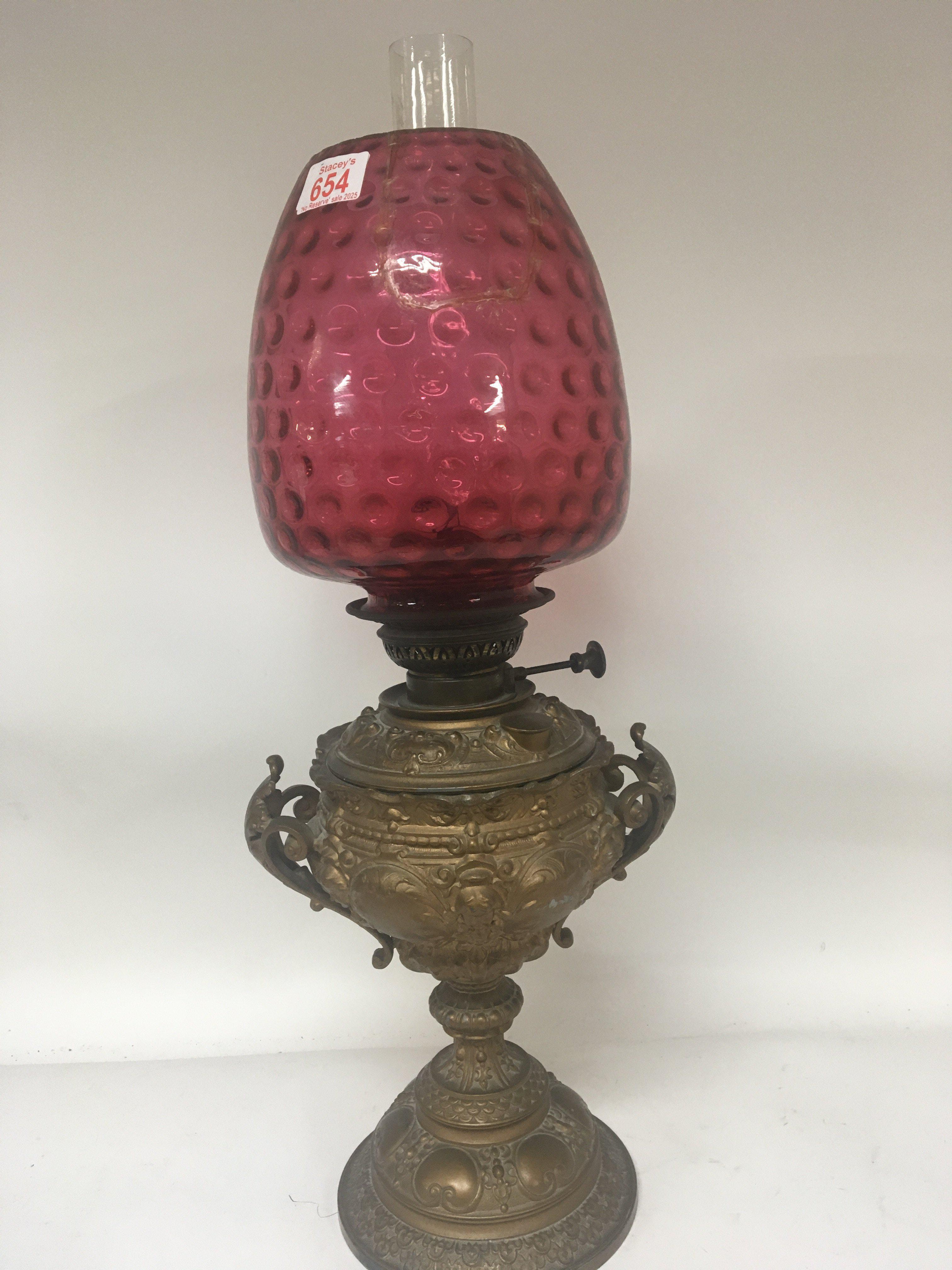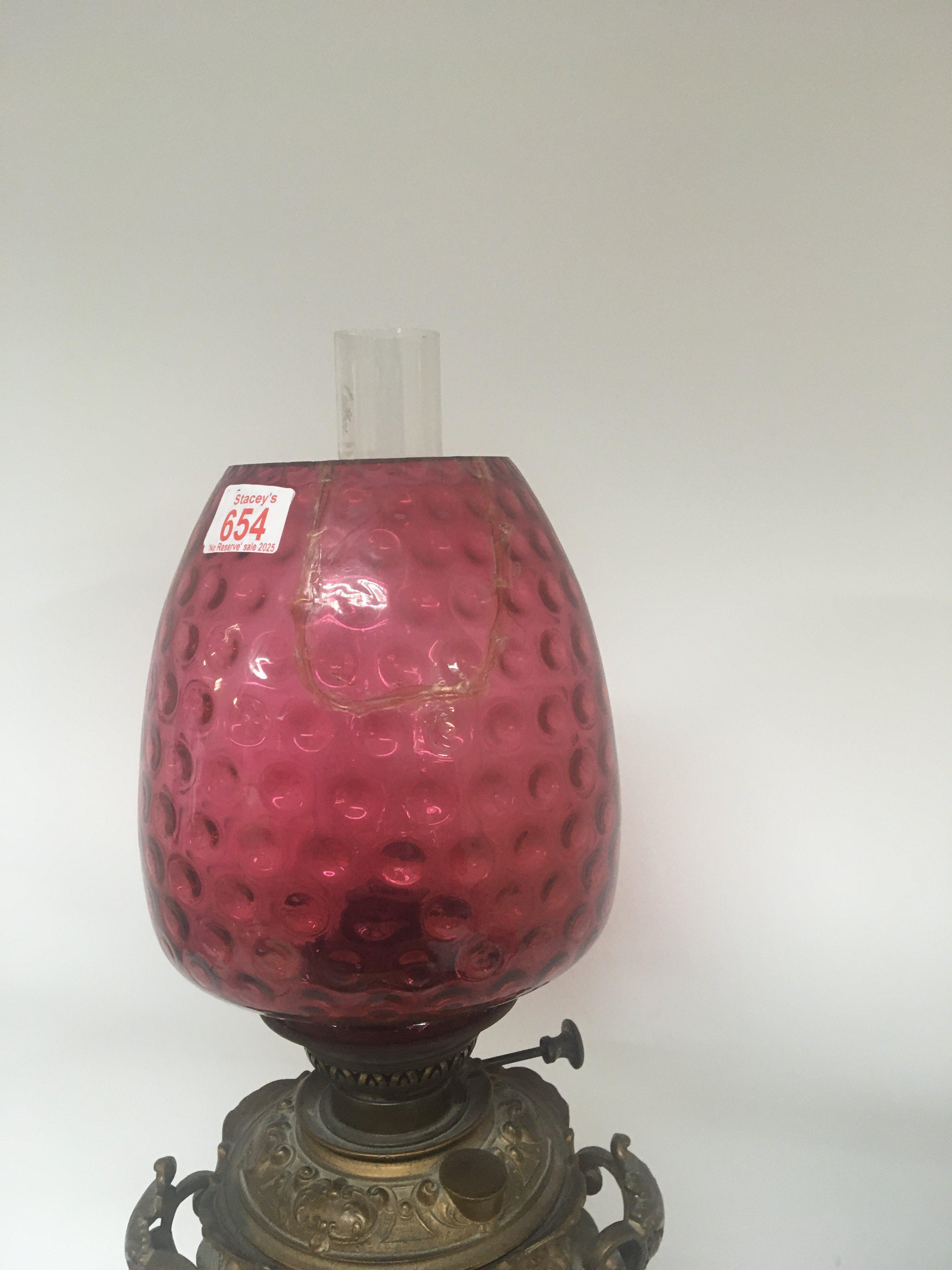 A Victorian oil lamp with an elaborate Spelter base and cranberry shade damaged.