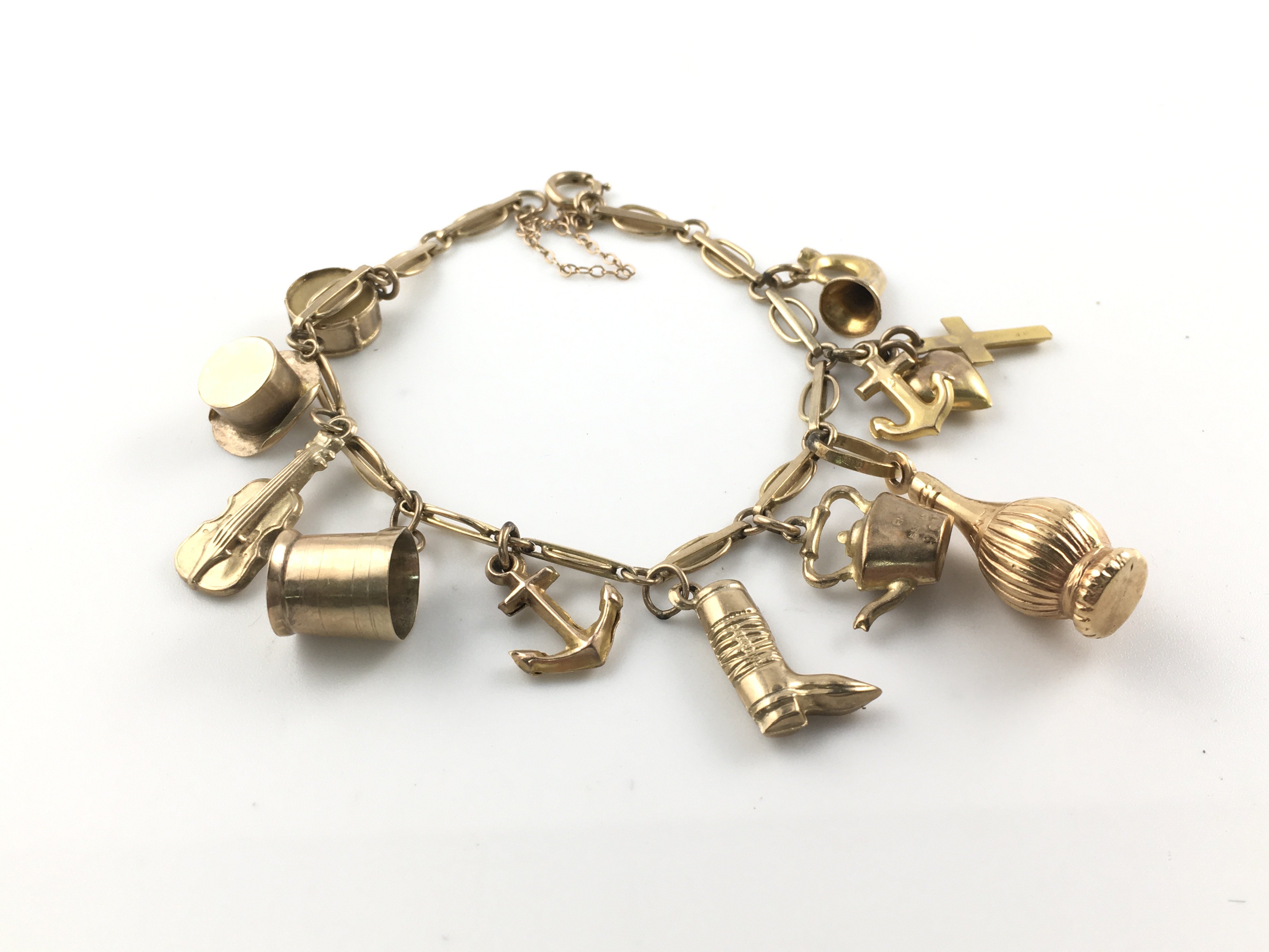 A 9ct gold charm bracelet with assorted charms. 12.67g Postage B