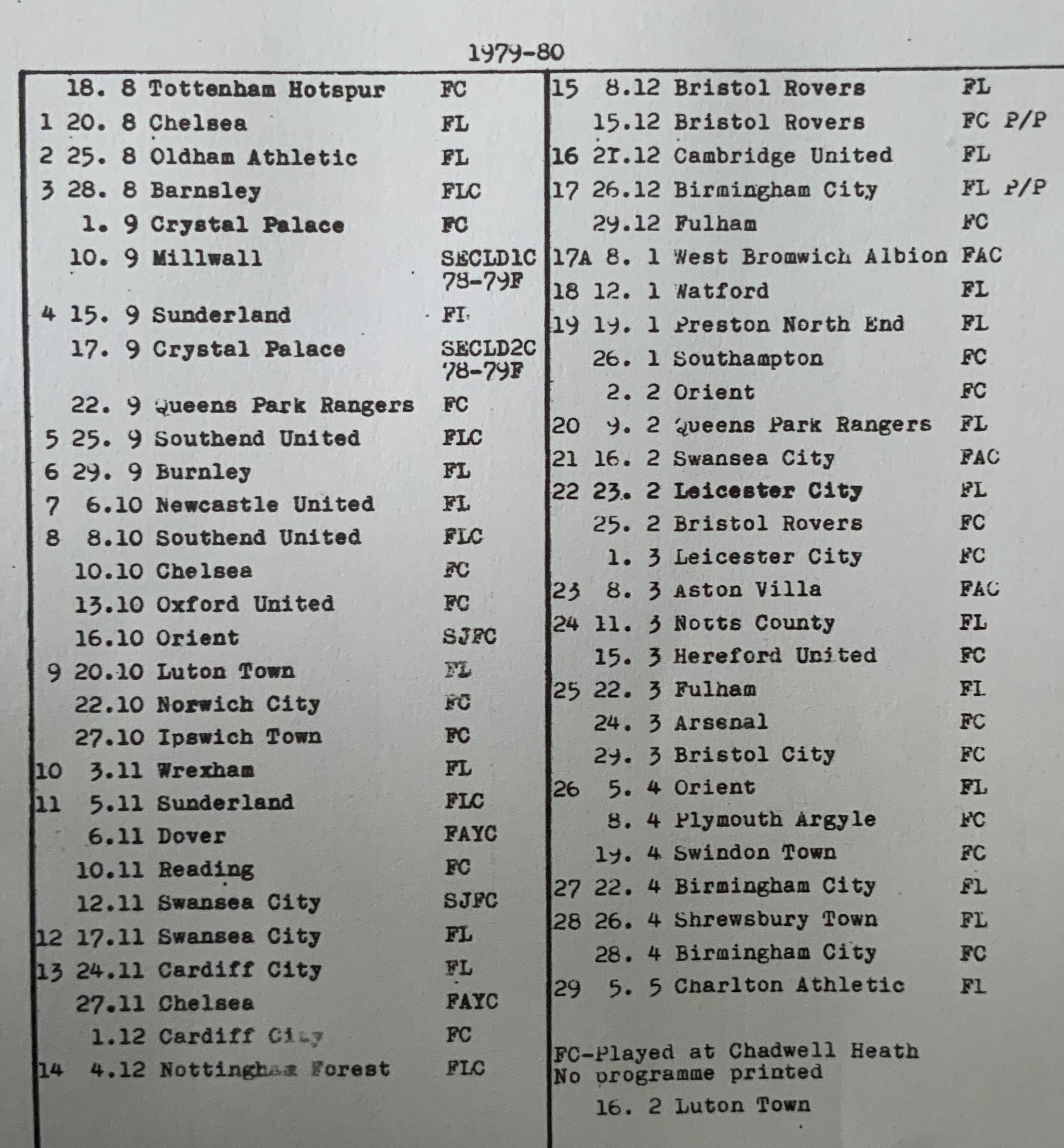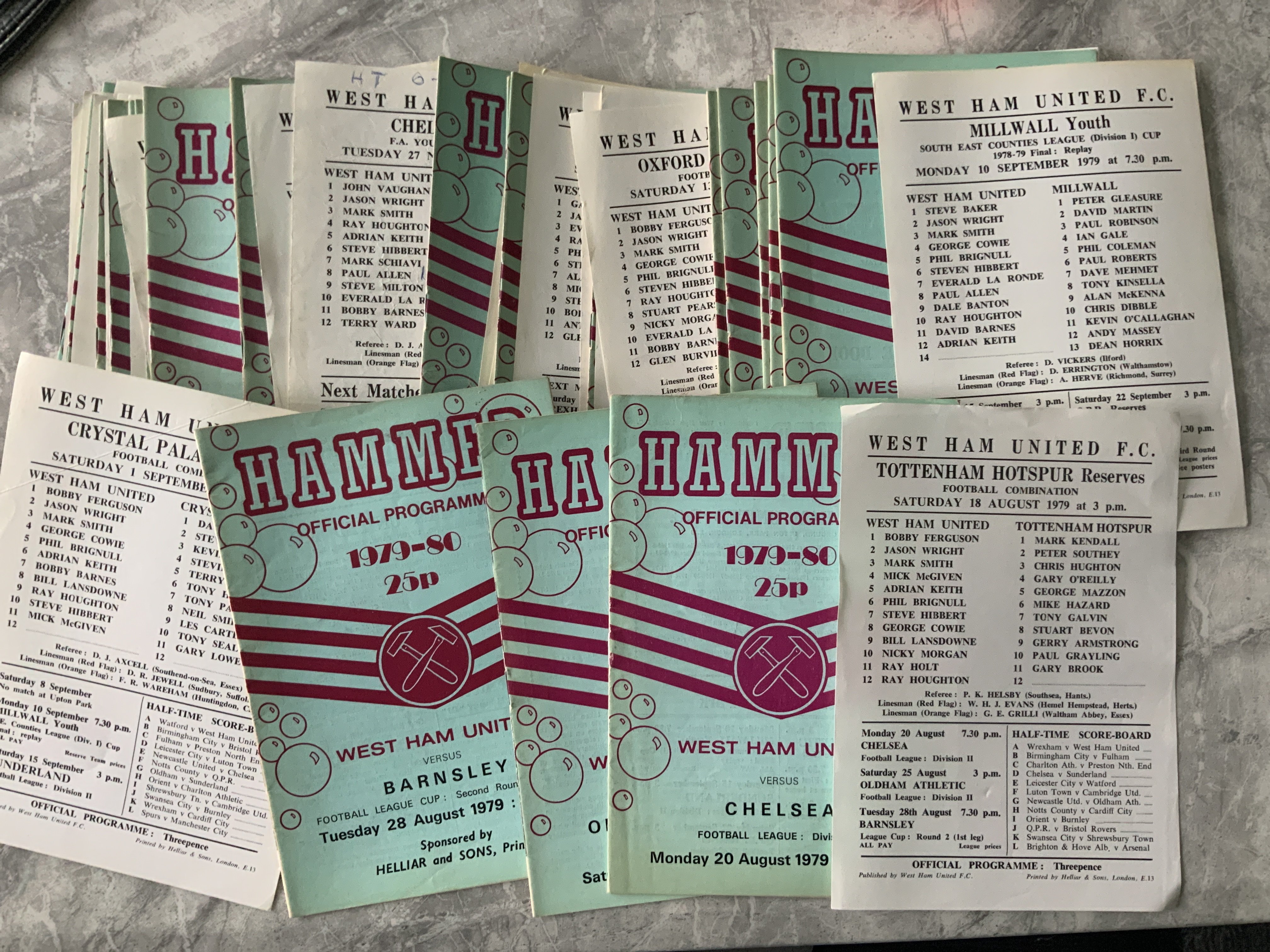 West Ham 79/80 Set Of Home Football Programmes: Full set of 57 programmes issued by Helliars from the FA Cup winning season. Full list online including both postponed, previous seasons carried over South East Counties finals and all Youth Cup matches to include Chelsea and Dover. Excellent. (57)