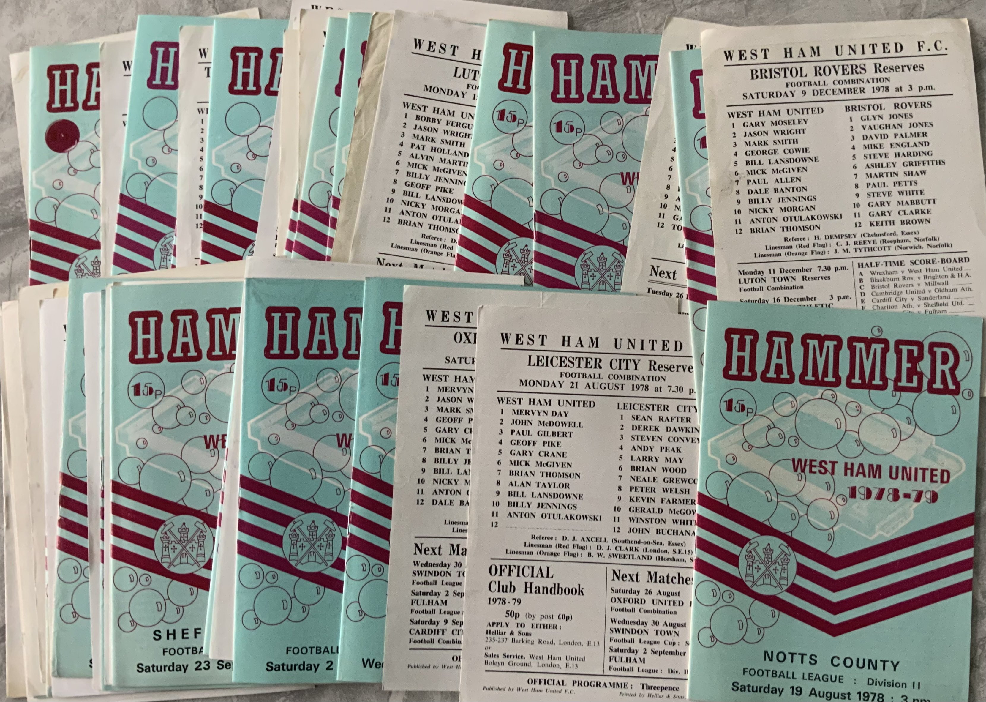 West Ham 78/79 Set Of Home Football Programmes: 47 from the set of 50 programmes issued by Helliars. Full list online including postponed reserves v Bristol Rovers but missing South East Counties v Millwall and Ipswich. Excellent. (50)