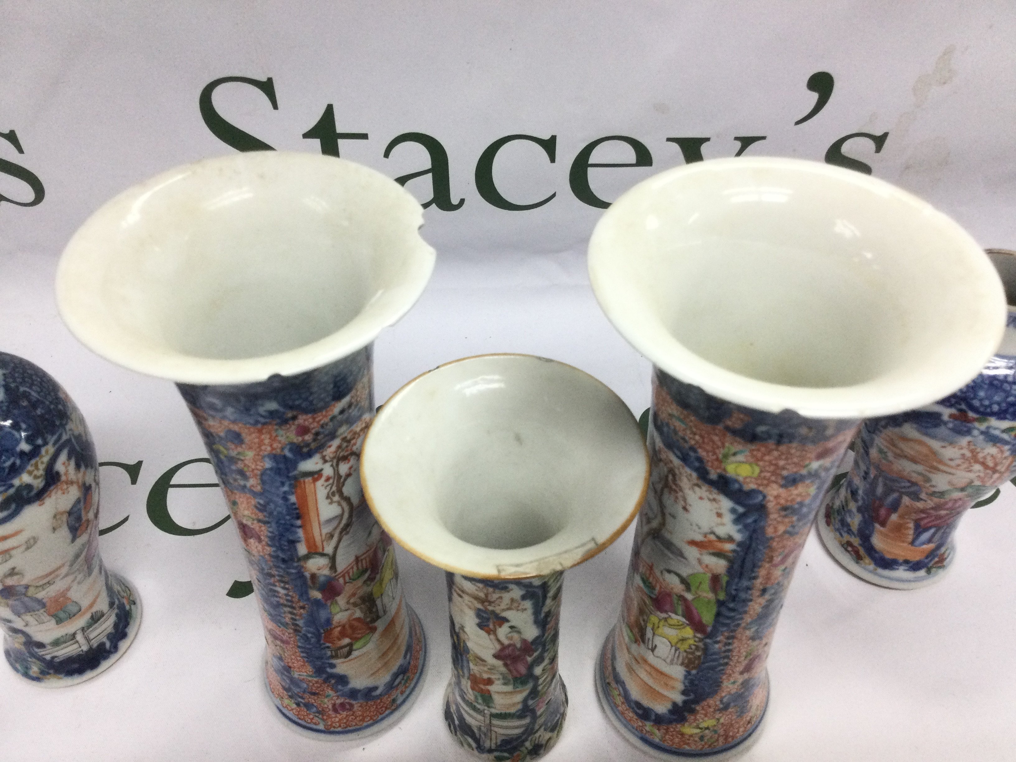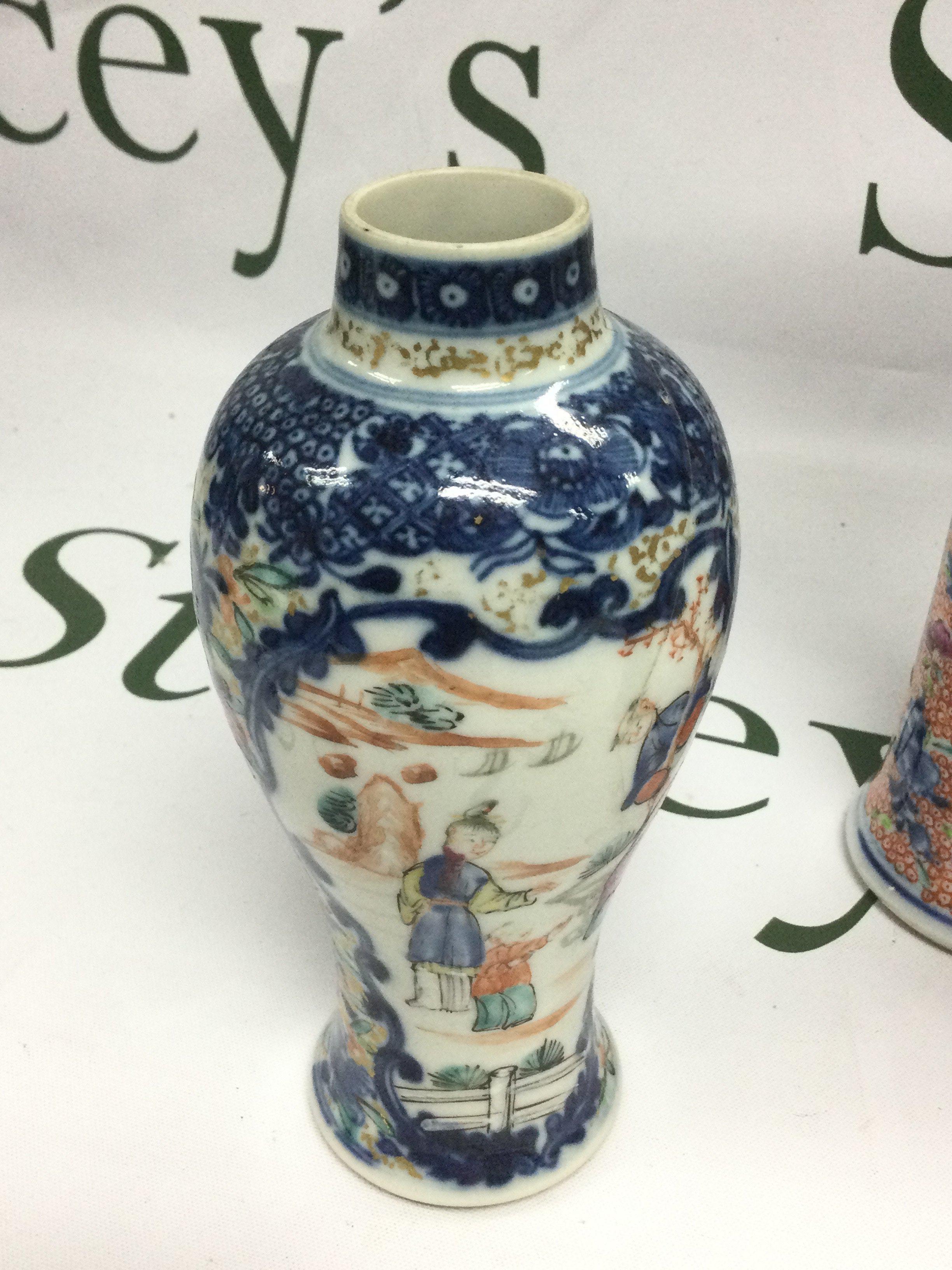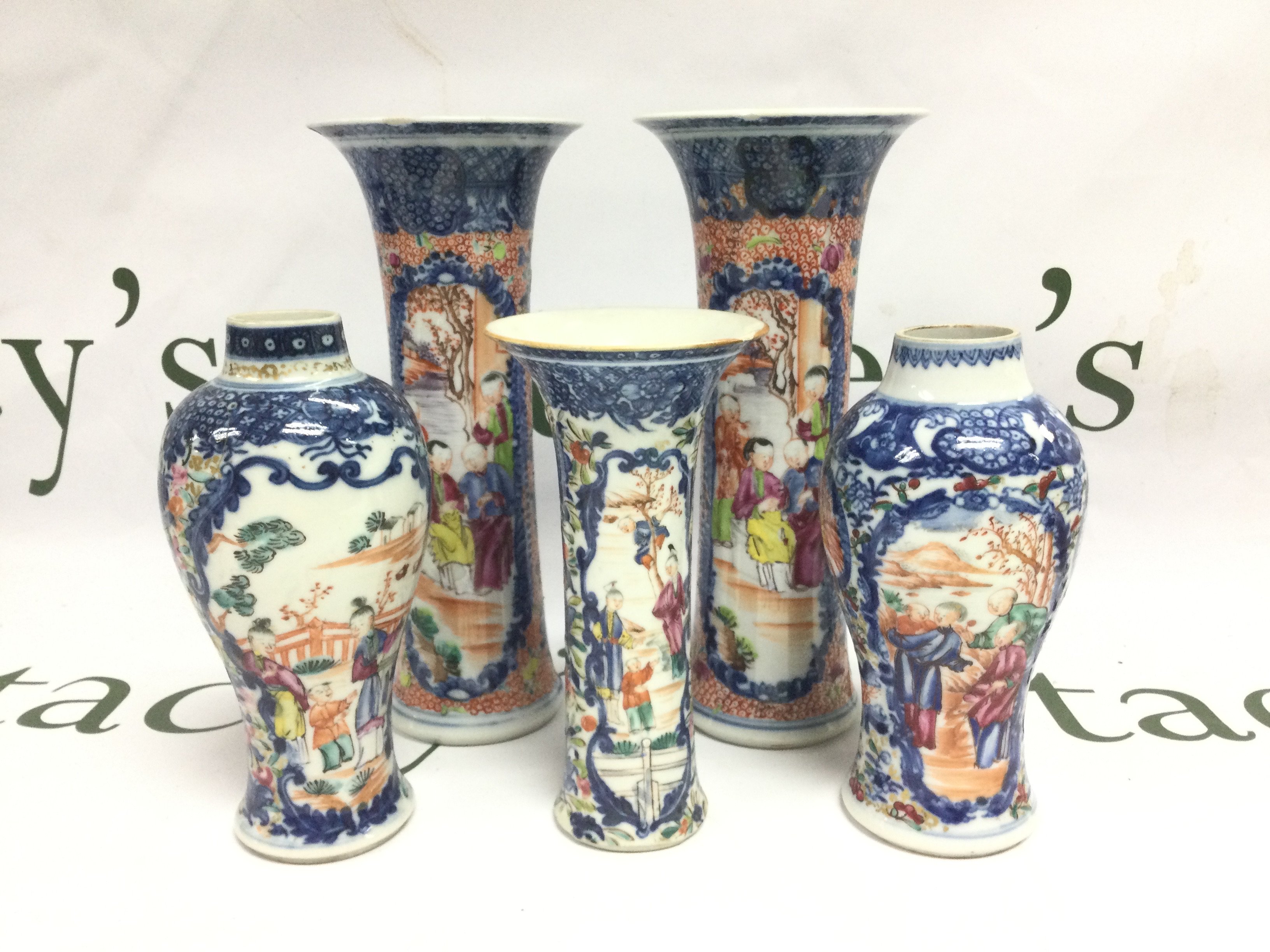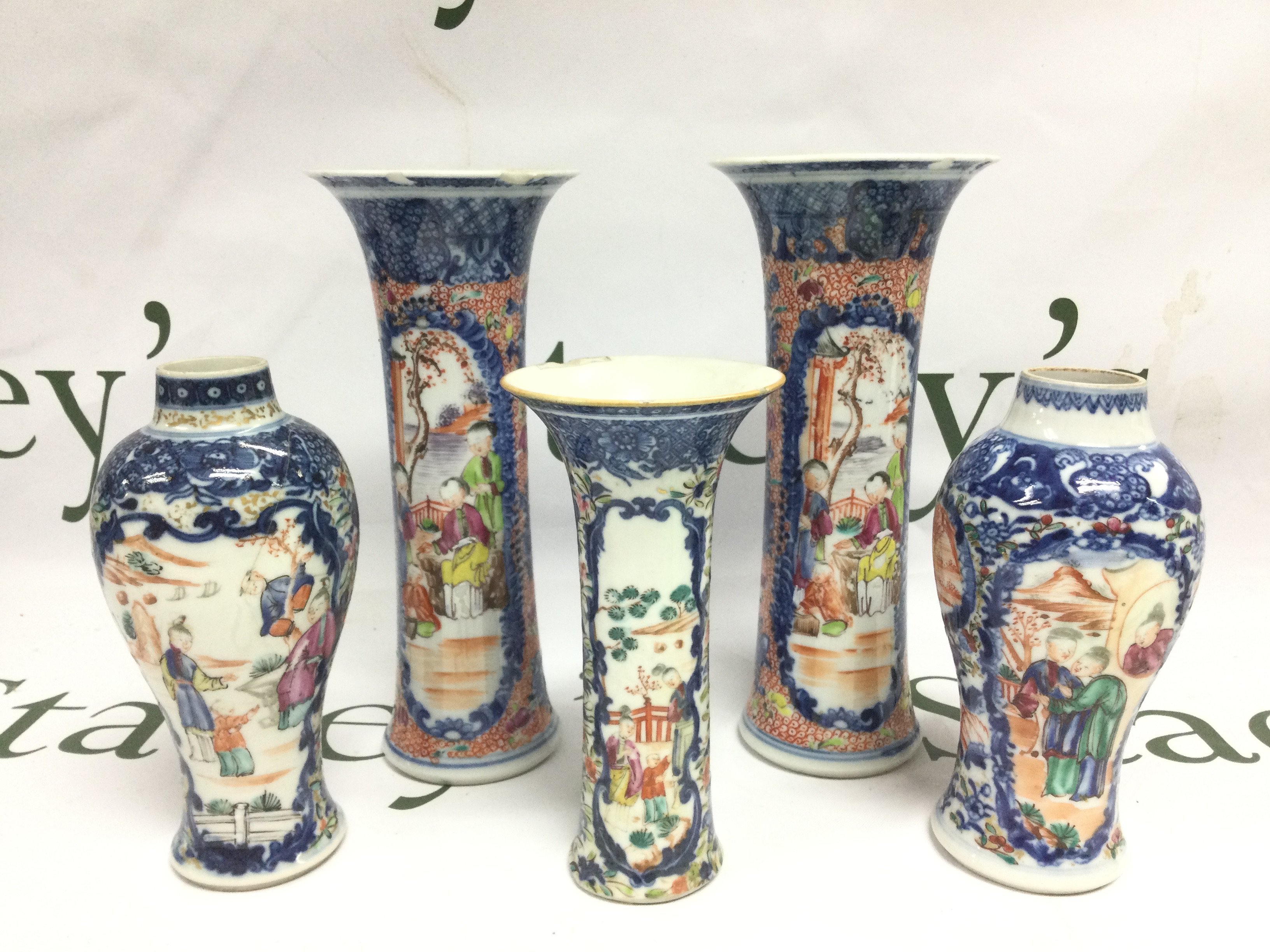 Five famille rose vases with handpainted decoration, tallest approx 19cm. Shipping category D.