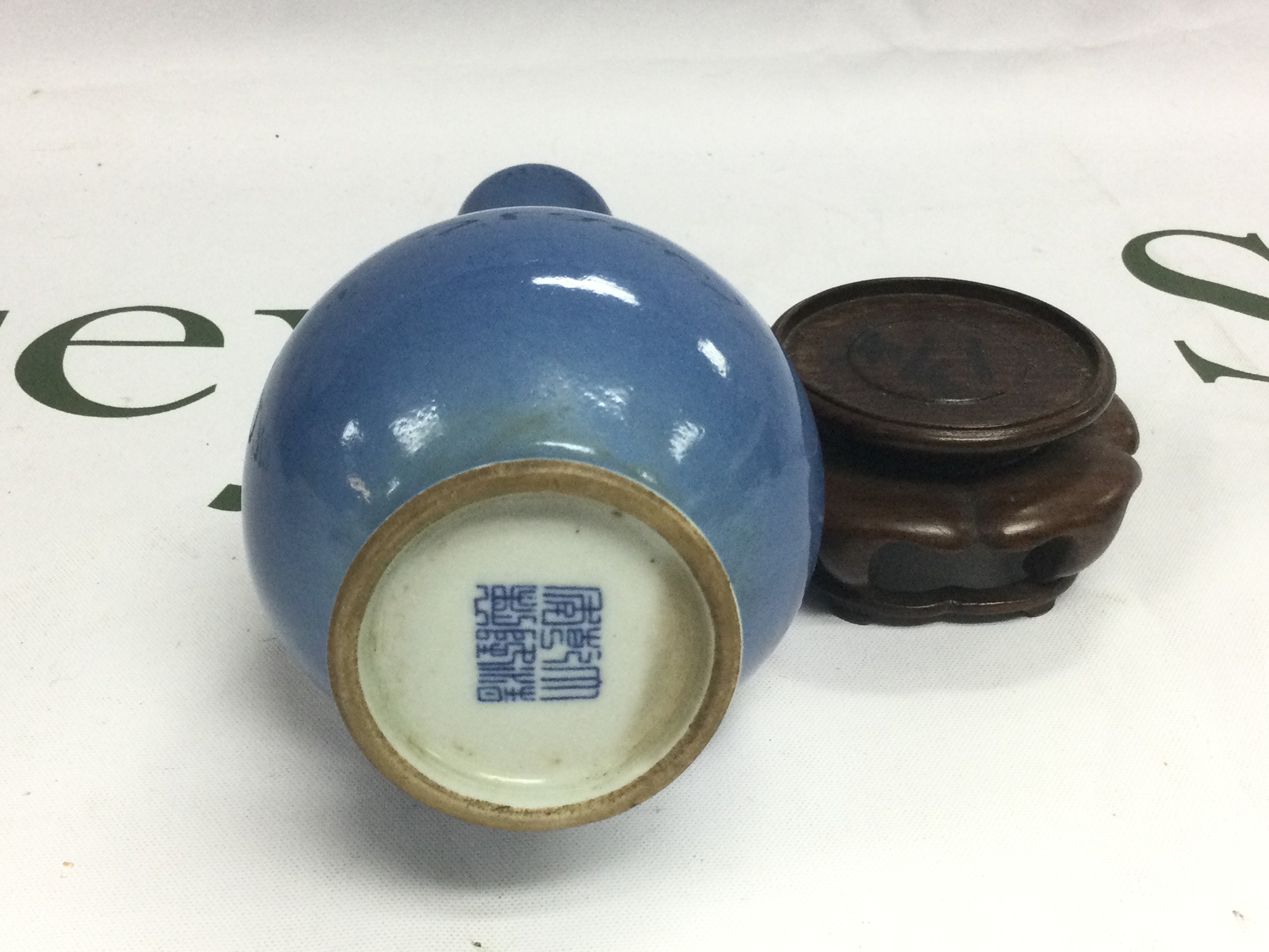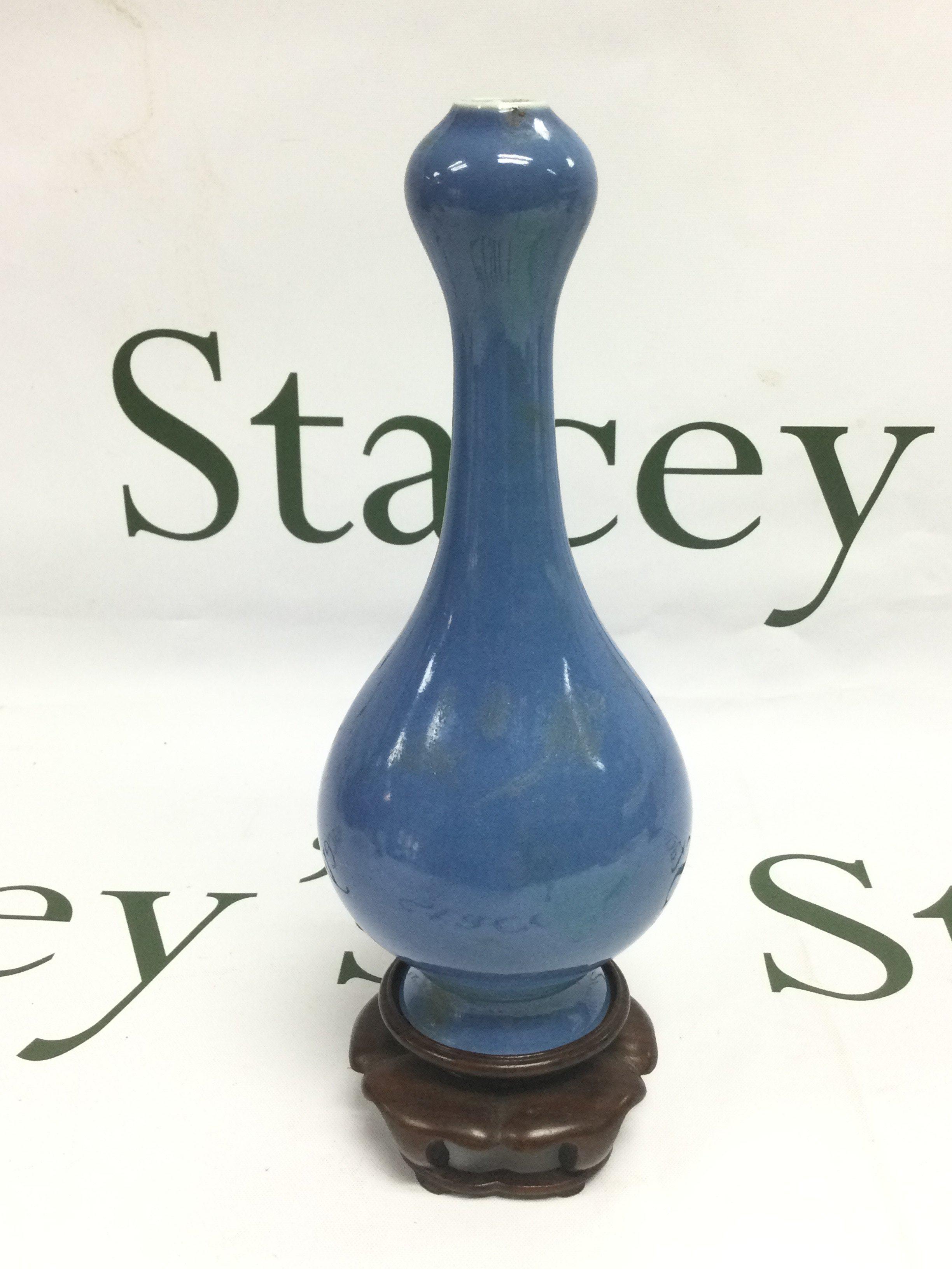A Chinese garlic vase in blue and raised on a carved hardwood stand, approx total height 20.5cm. Shipping category D.