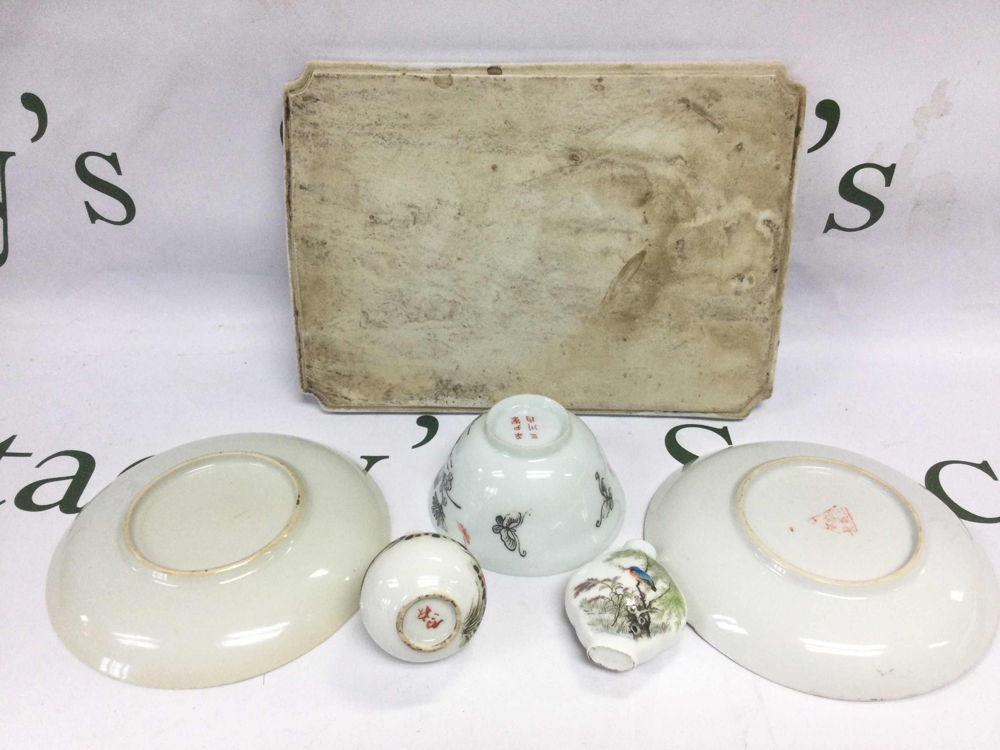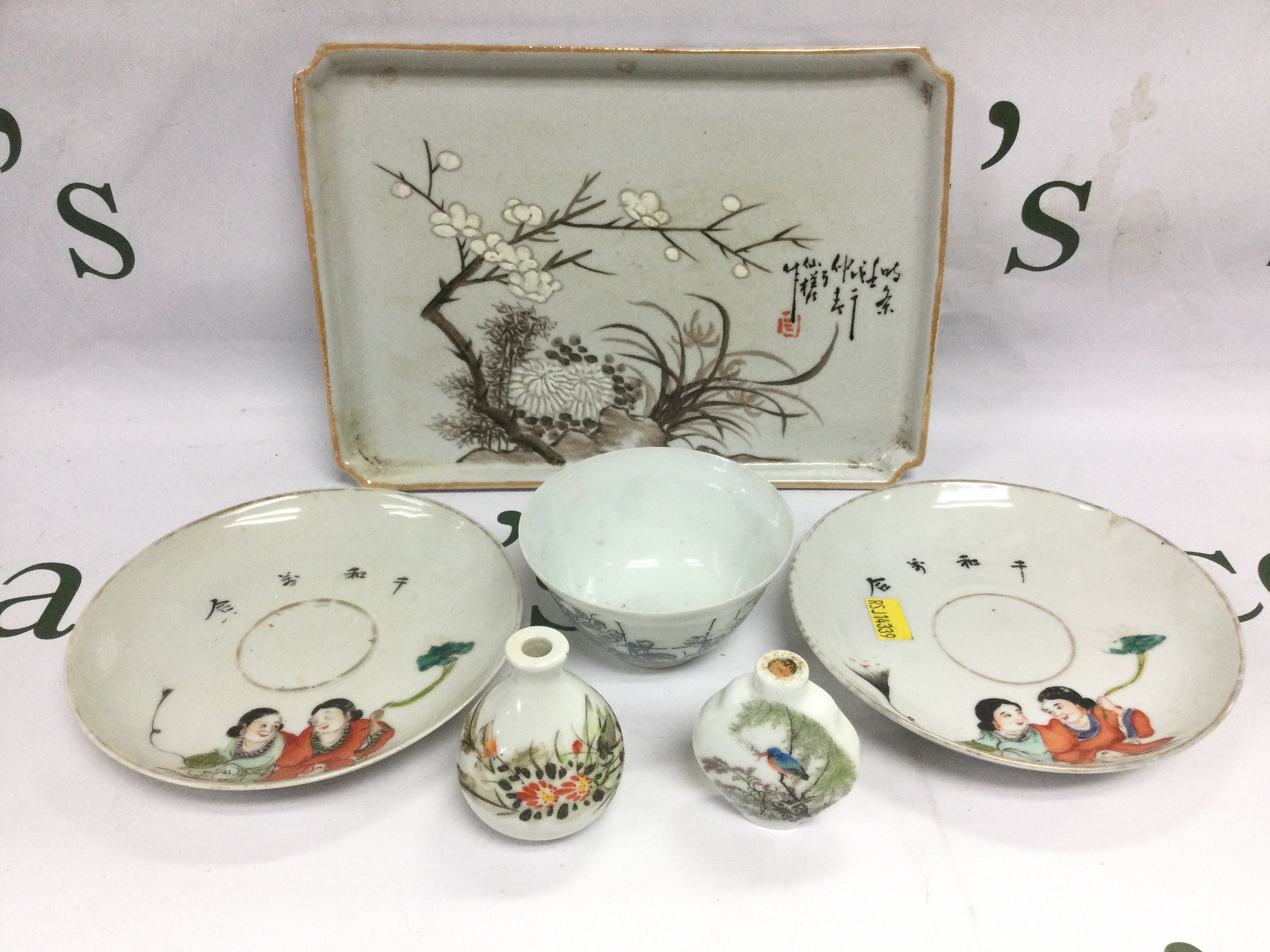 A small collection of Oriental ceramics comprising tea bowl, scent bottle, tray etc. Shipping category D.