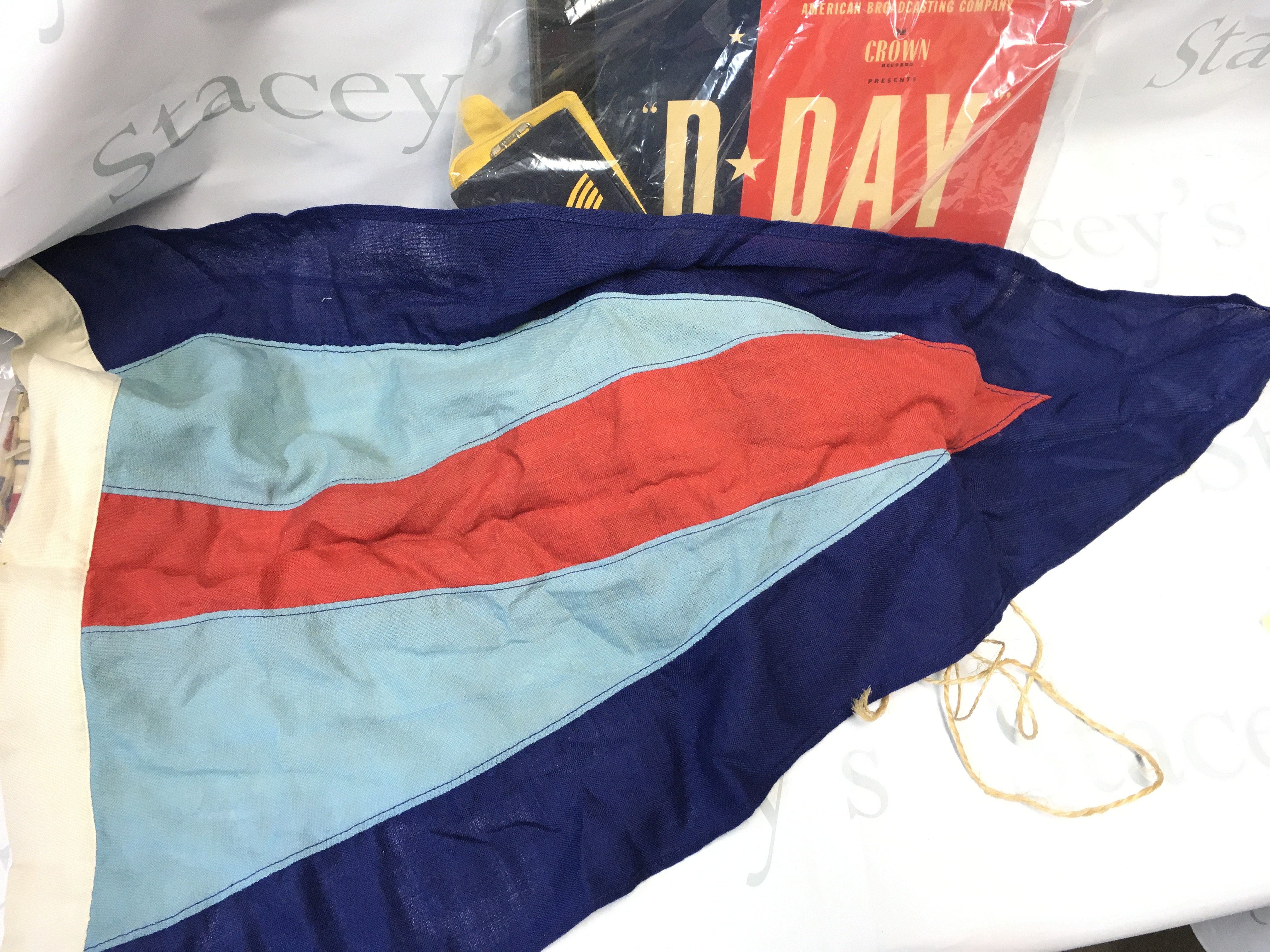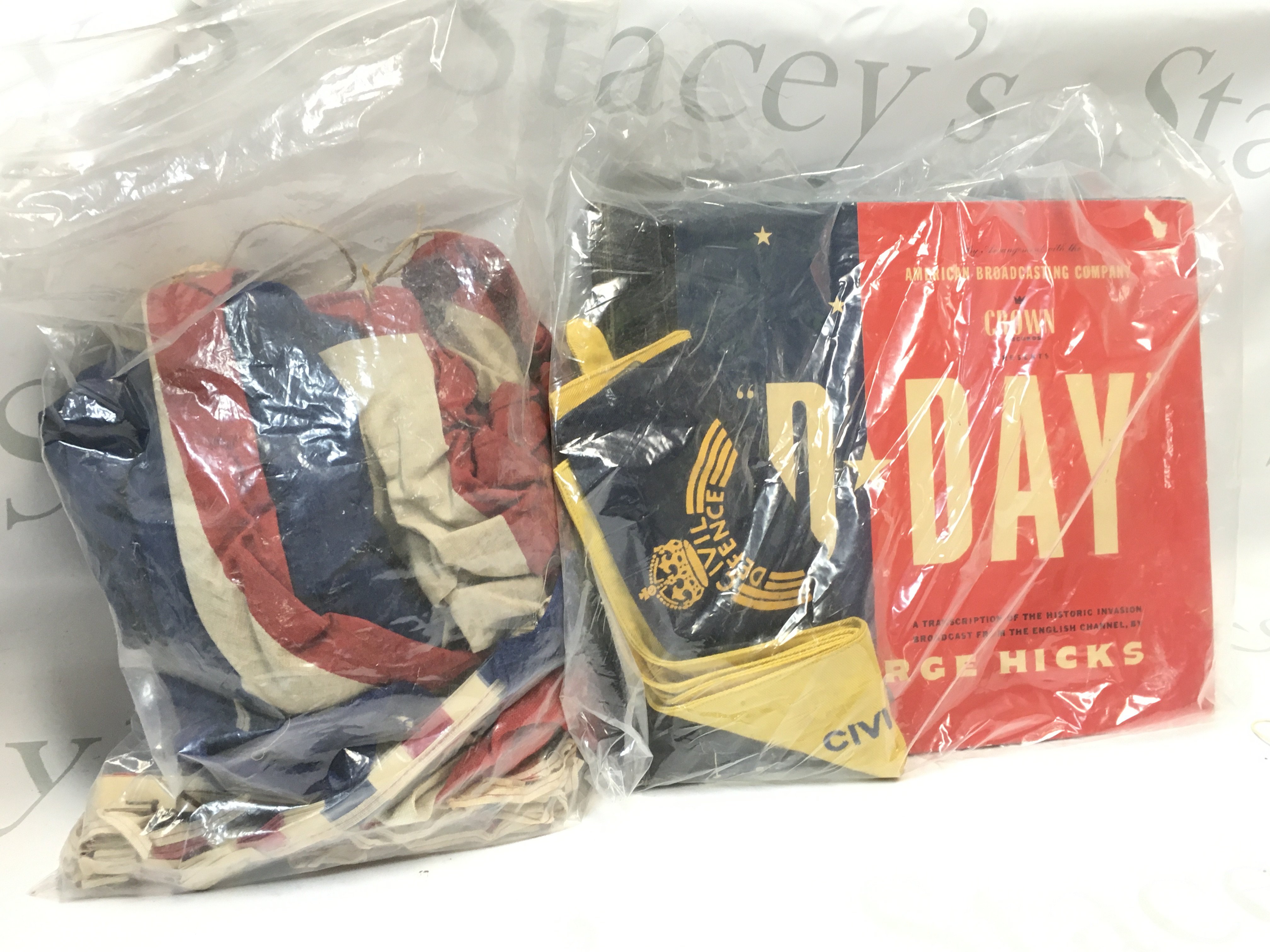 Civil Defence armbands, George Hicks D Day coloured vinyl record, Union Jack flag, WW2 RAF flag