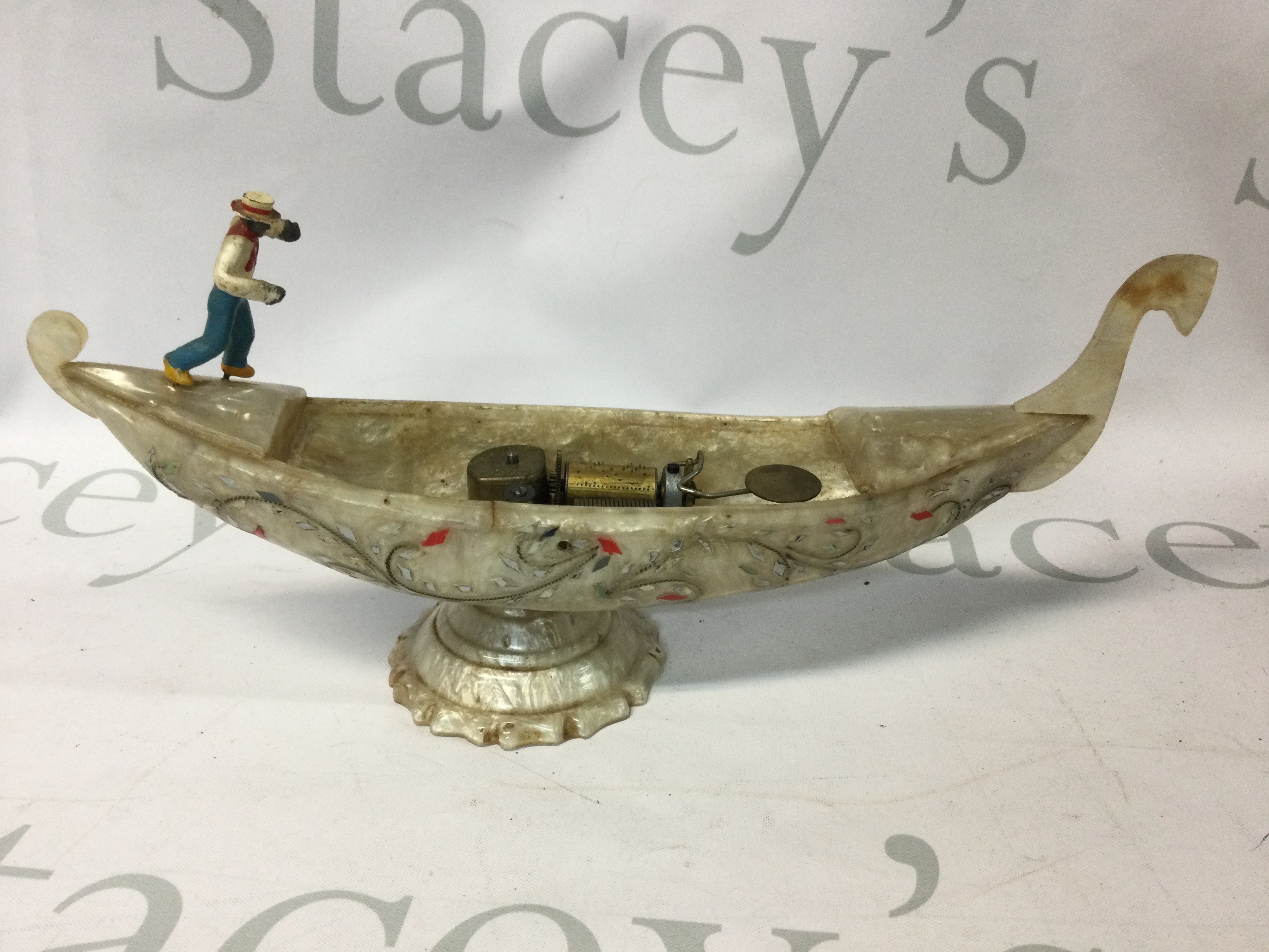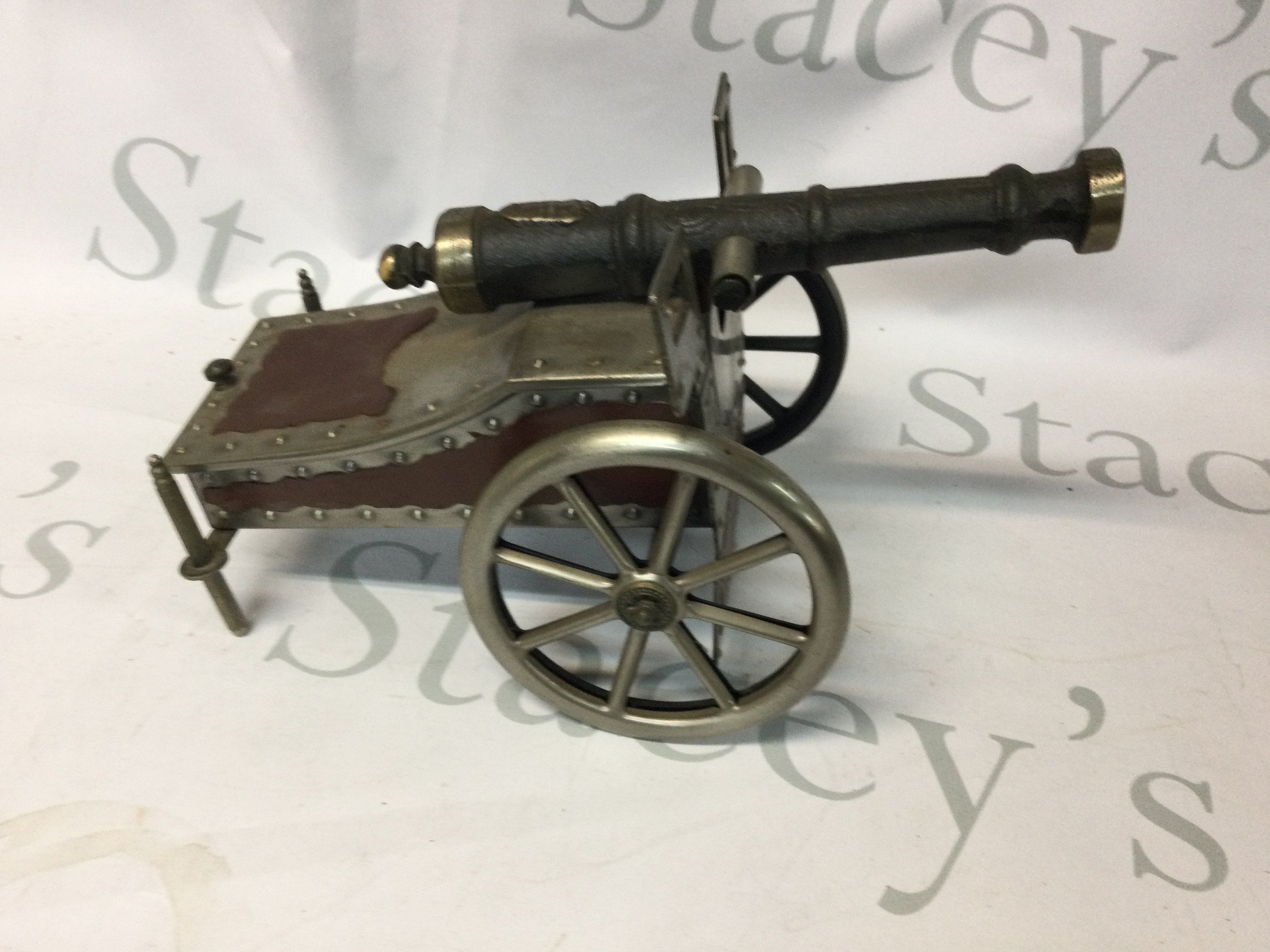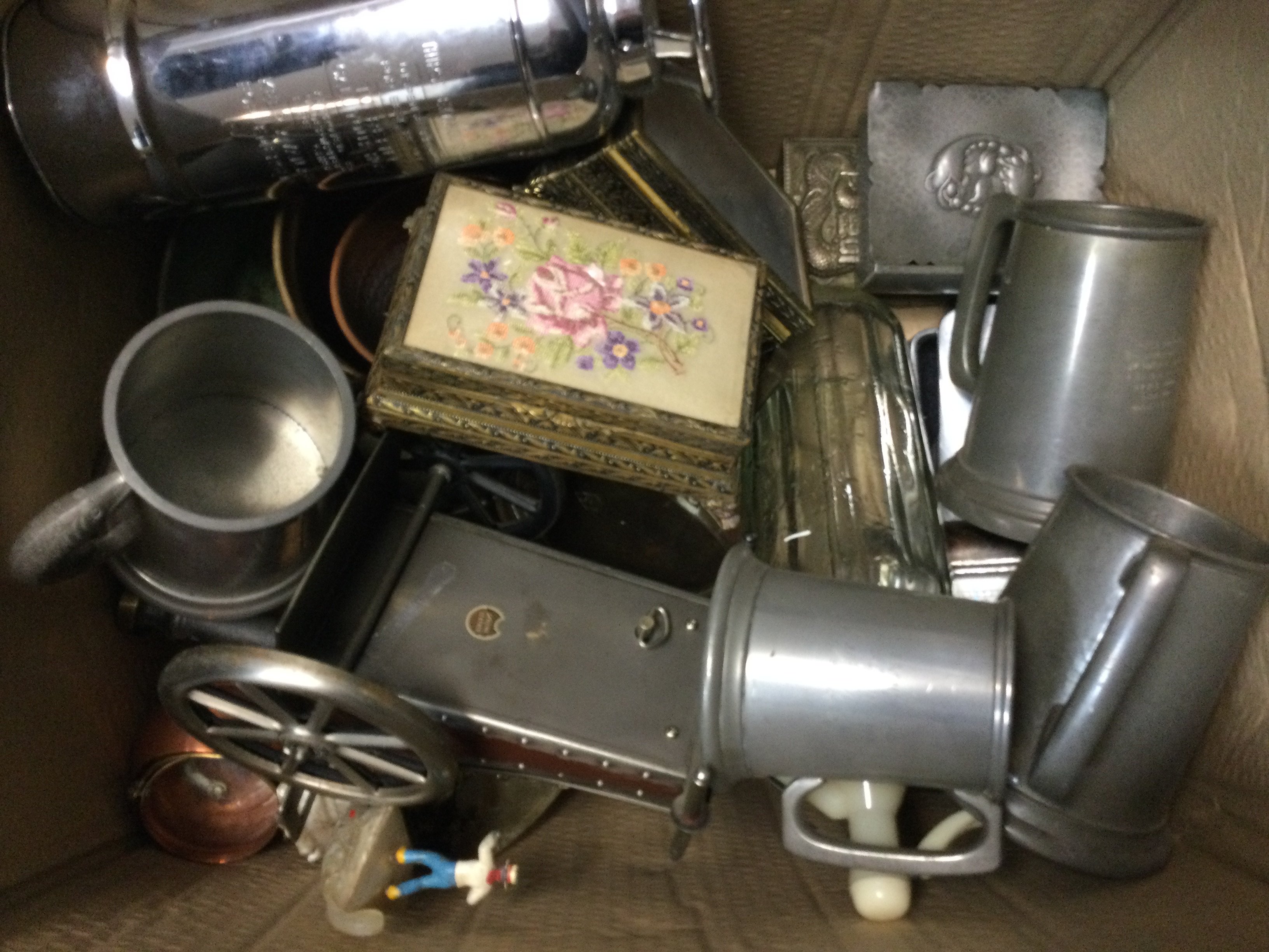 A collection of 2 small vintage jewellery boxes, a vintage souvenir Veneziano gondola, a canon which is also a jewellery box made its genuine leather, some vintage pewter tankards, and some other items.