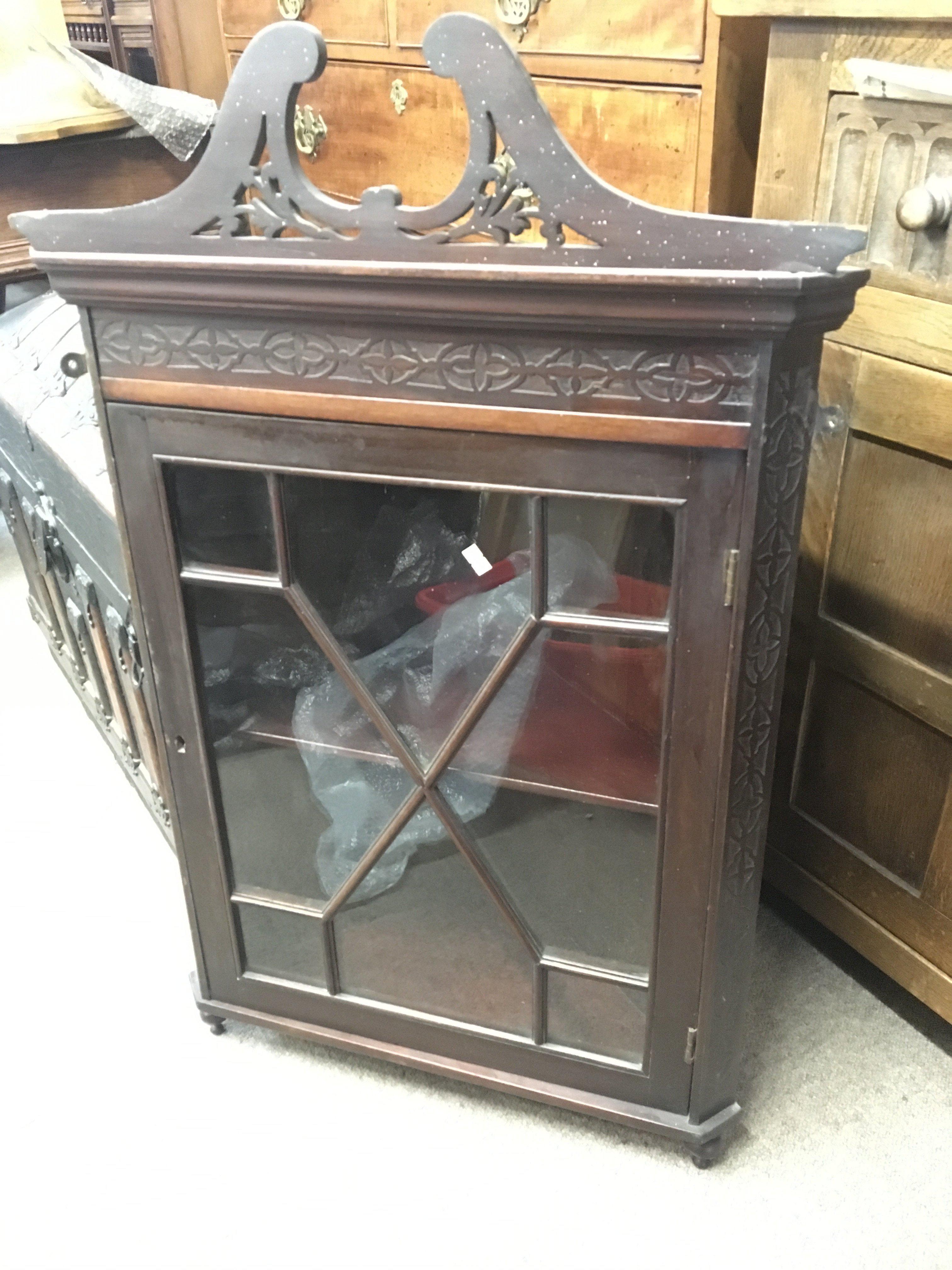 An Edwardian hanging display corner cabinet with blind fretwork and a glazed door. NO RESERVE