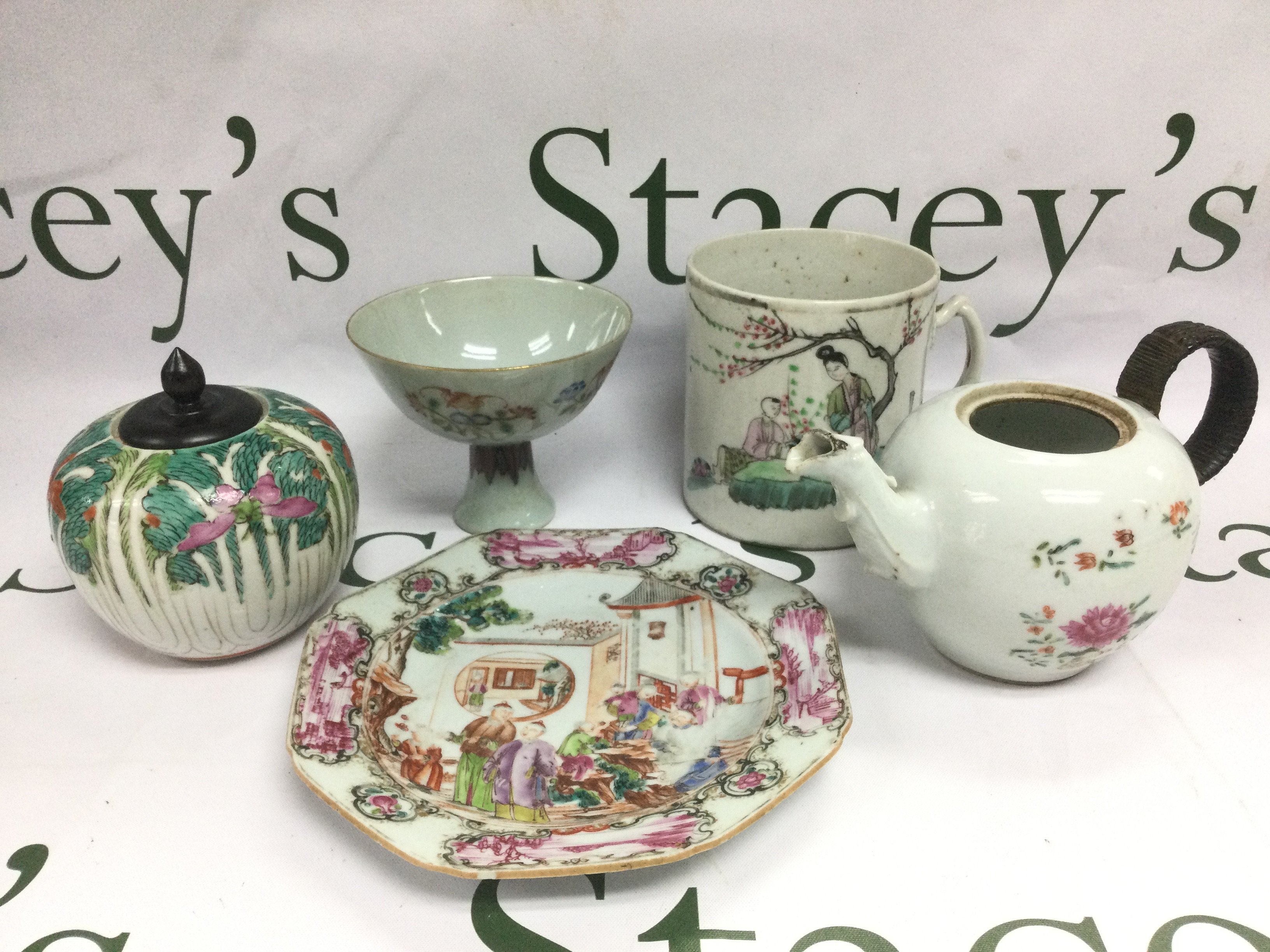 Five Oriental ceramic items comprising a teapot, octagonal dish etc. Shipping category D.