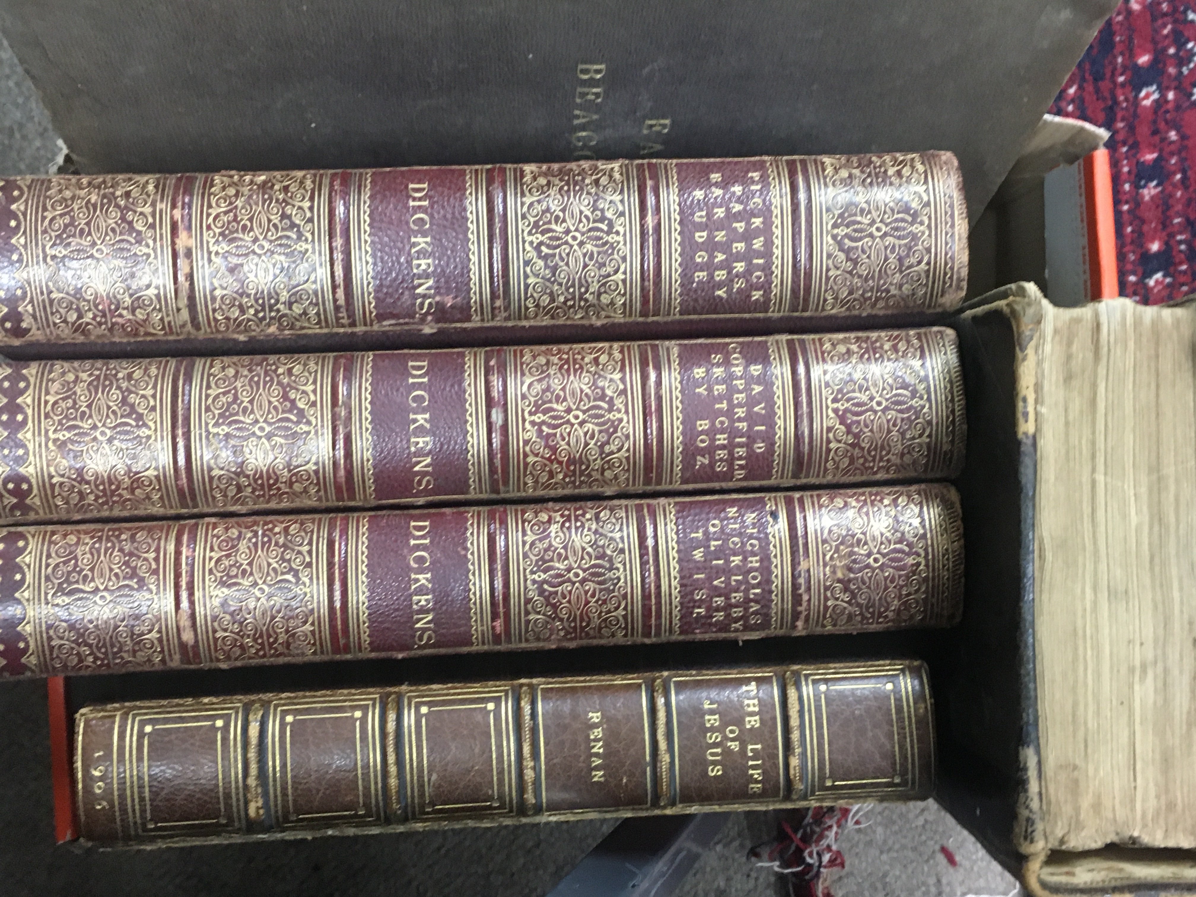 A box of 19th century leather bound books including Shakespeare, Dickens, Earl of Beaconsfield K.G. etc. NO RESERVE