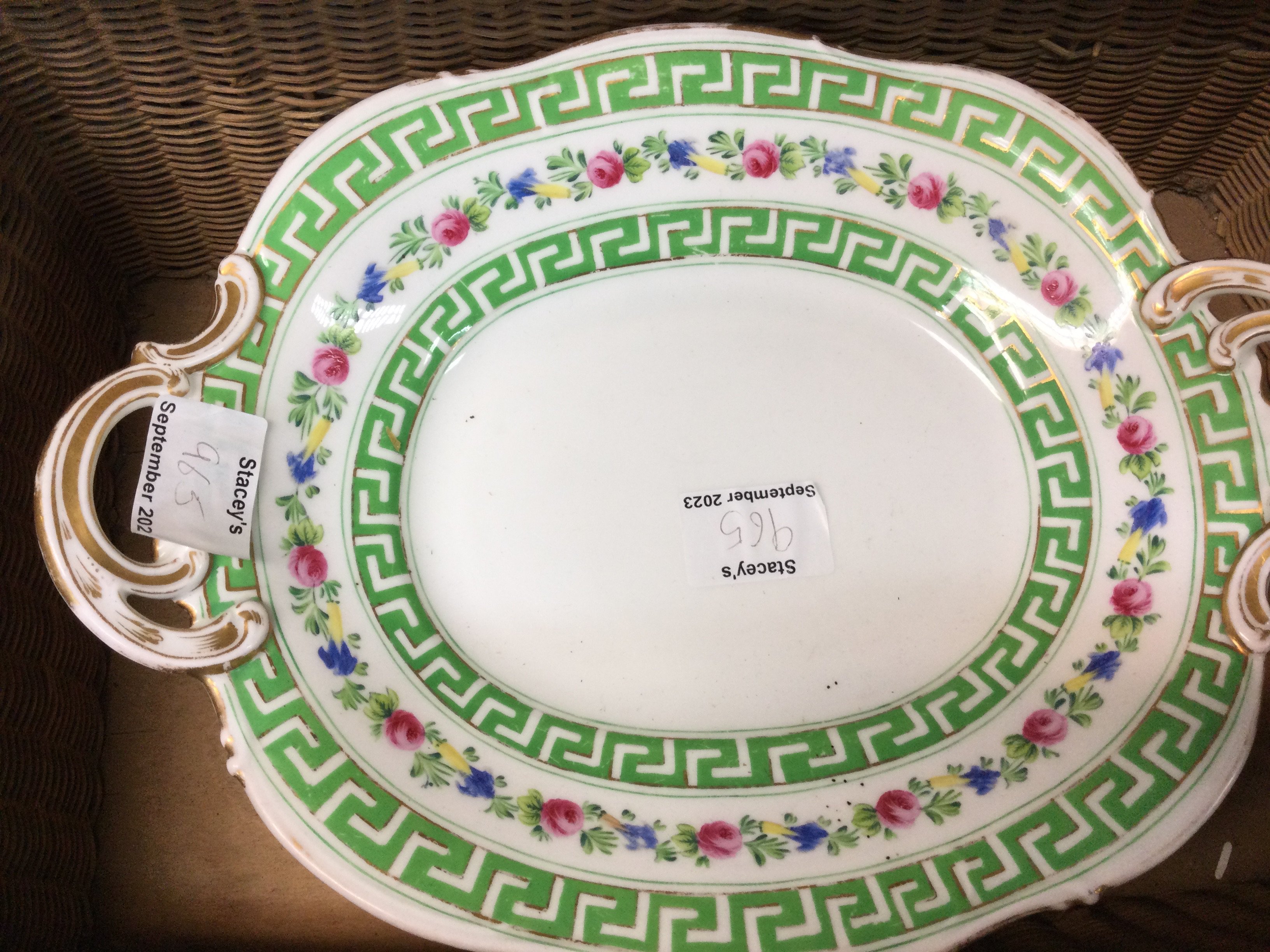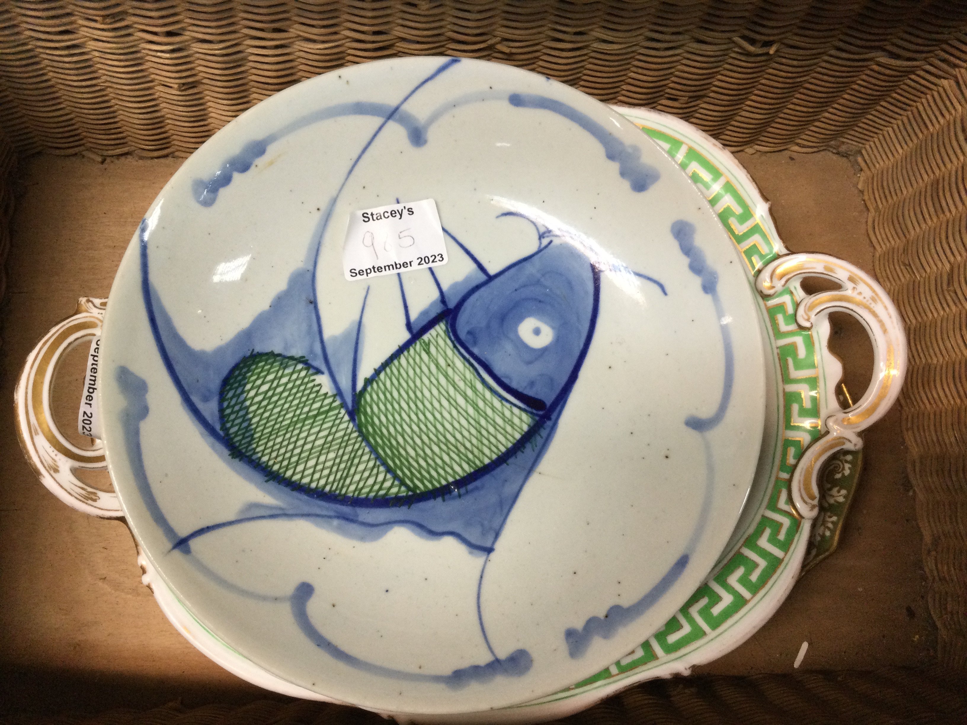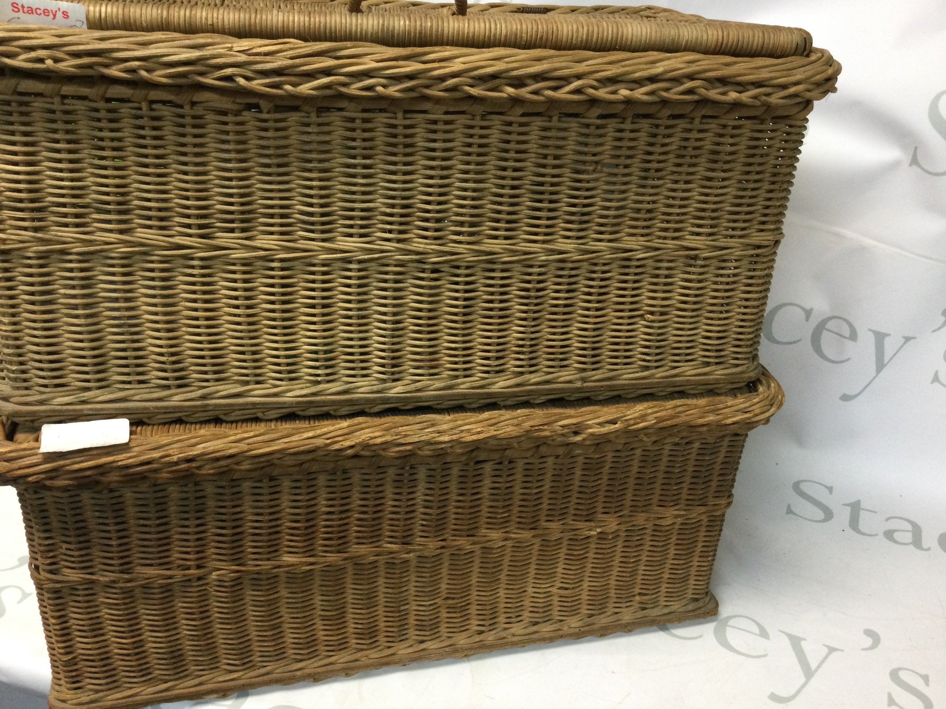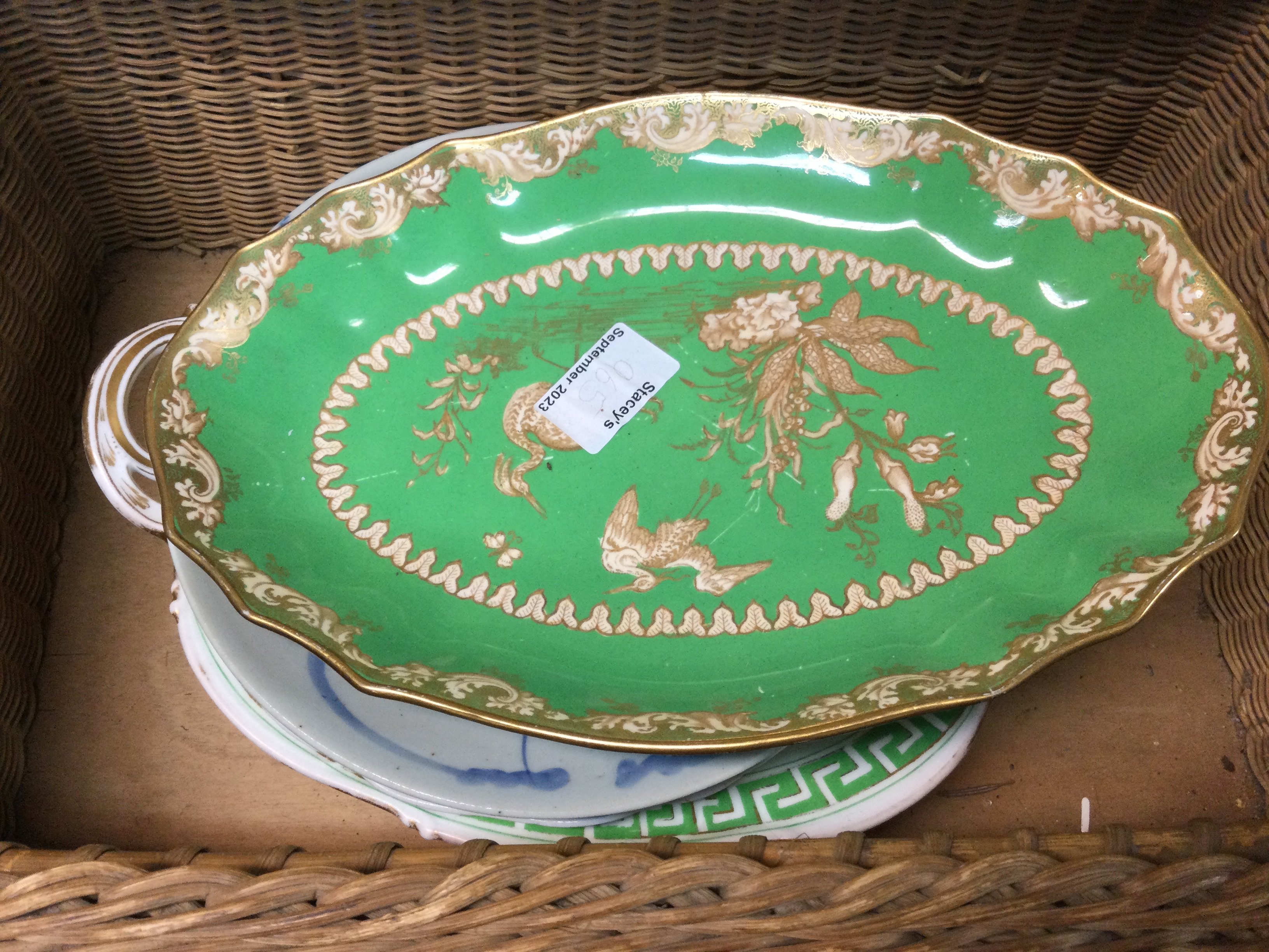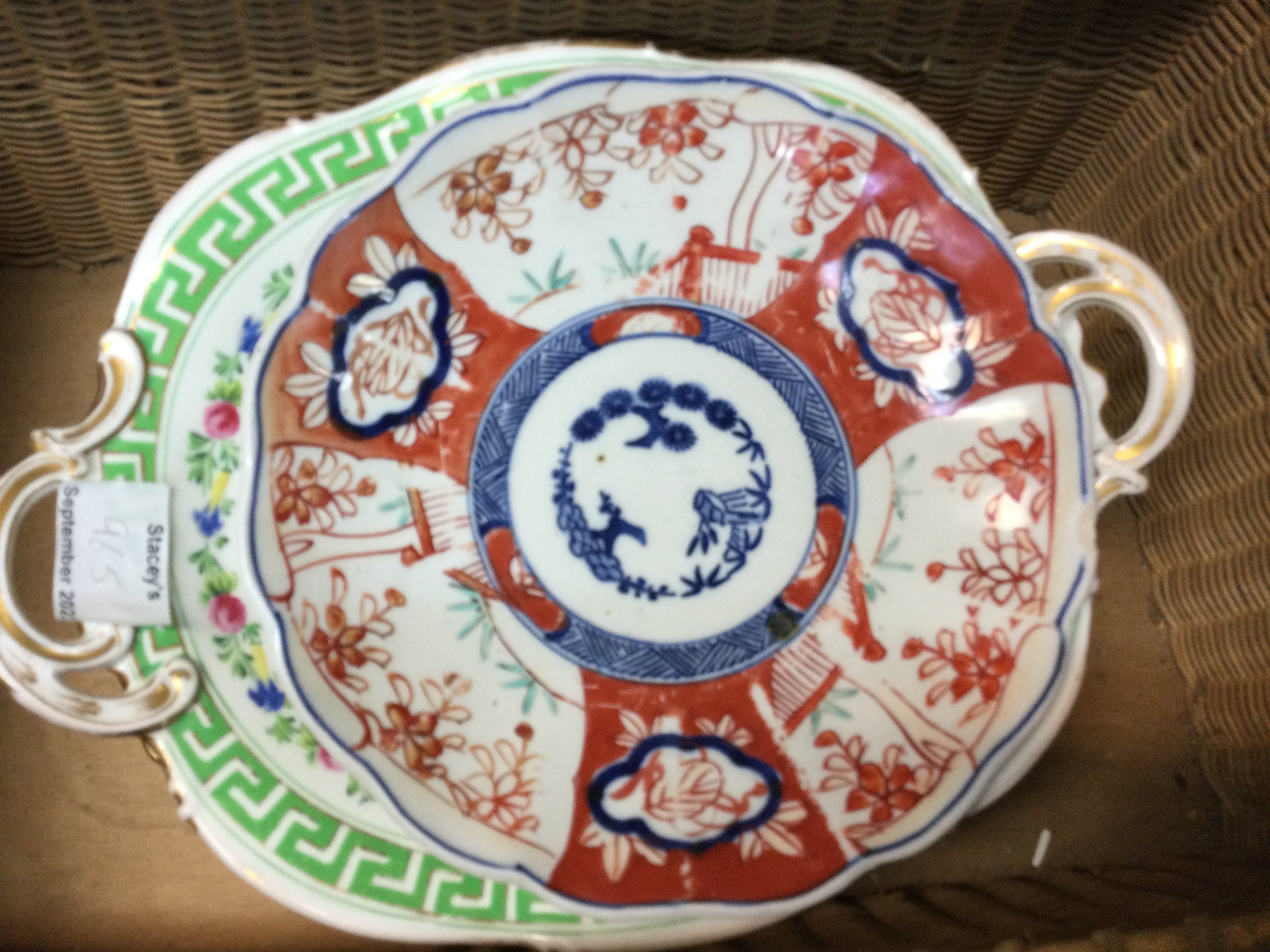Two Vintage baskets containing a collection of antique Japanese and Chinese dishes including Imariware, and the other basket containing a colon of cups, vases and more.