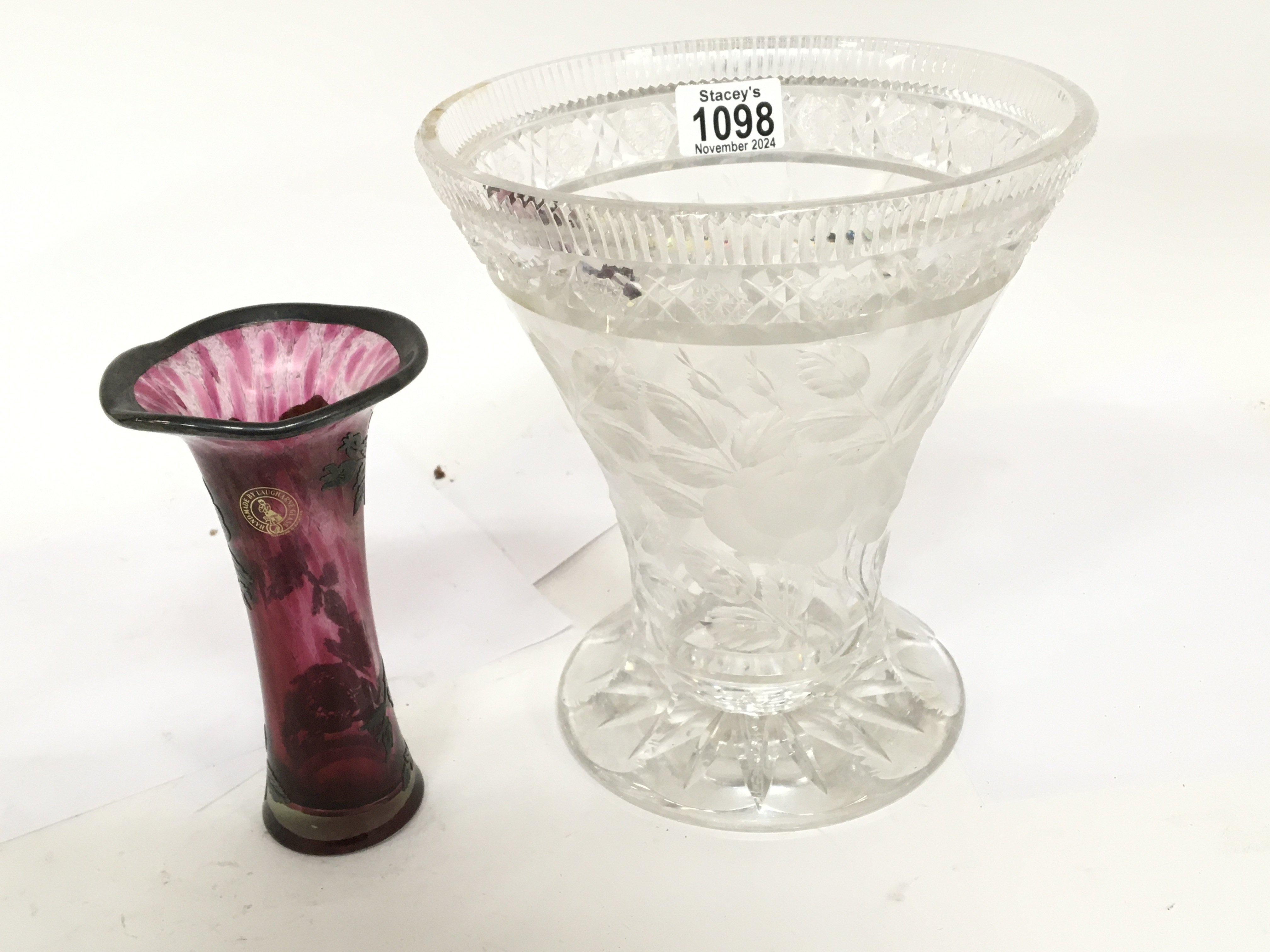 A Quality cut glass and acid and wheel cut vase and an art vase maker Laugharne. No obvious damage large vase Hight 22.5cm. NO RESERVE
