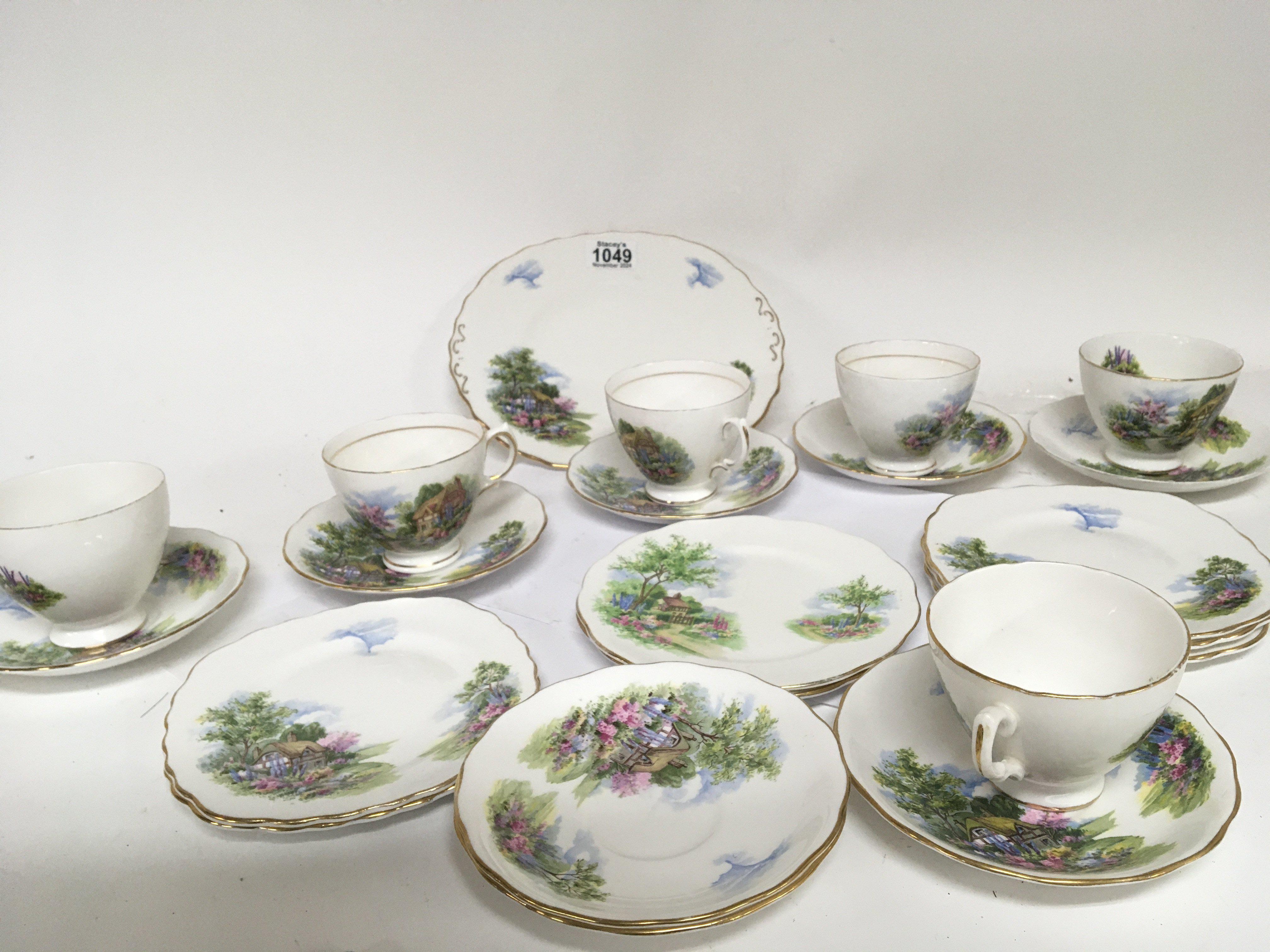 An English bone china tea set decorated with country cottages Royal Vale six place setting with serving plate no obvious damage. NO RESERVE