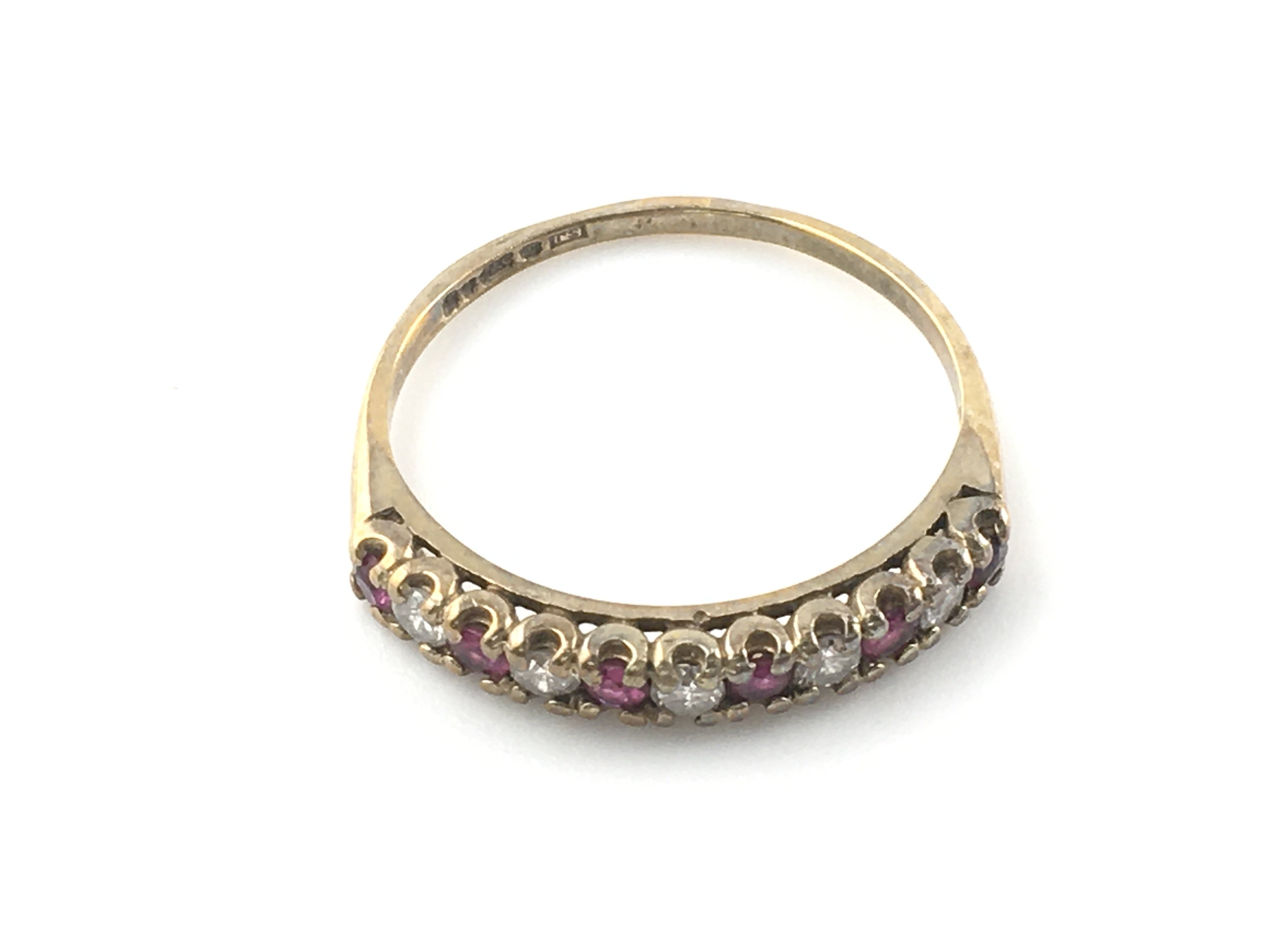 A 9ct gold ruby and diamond band ring. Size L and 1.35g Postage A